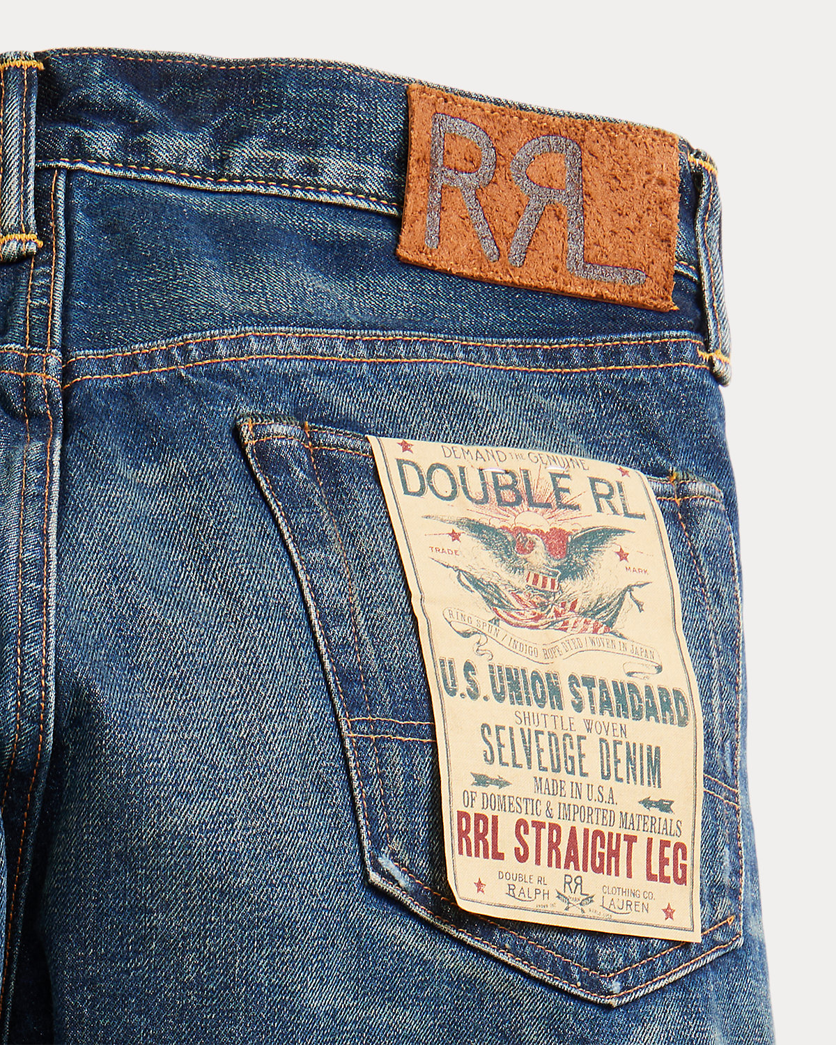 - Roughout suede “RRL”-debossed logo label at the back right waist.