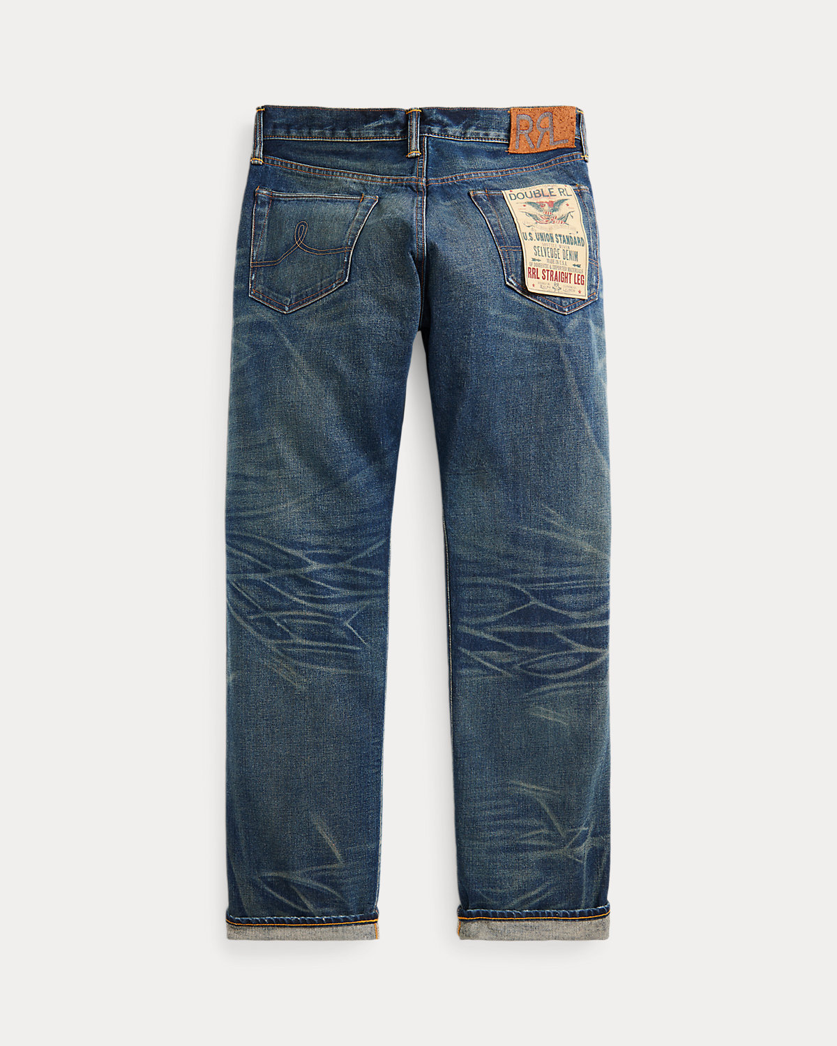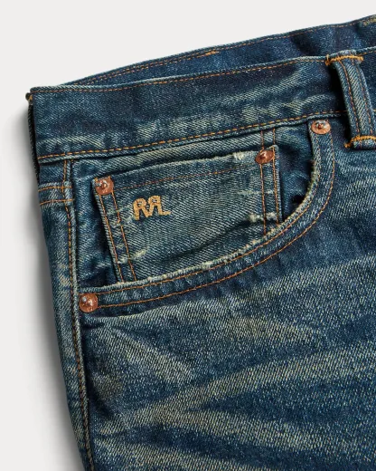 - American-made divs, rivets, and washer burrs. Five-pocket styling. “RRL” embroidery at the selvedge coin pocket.