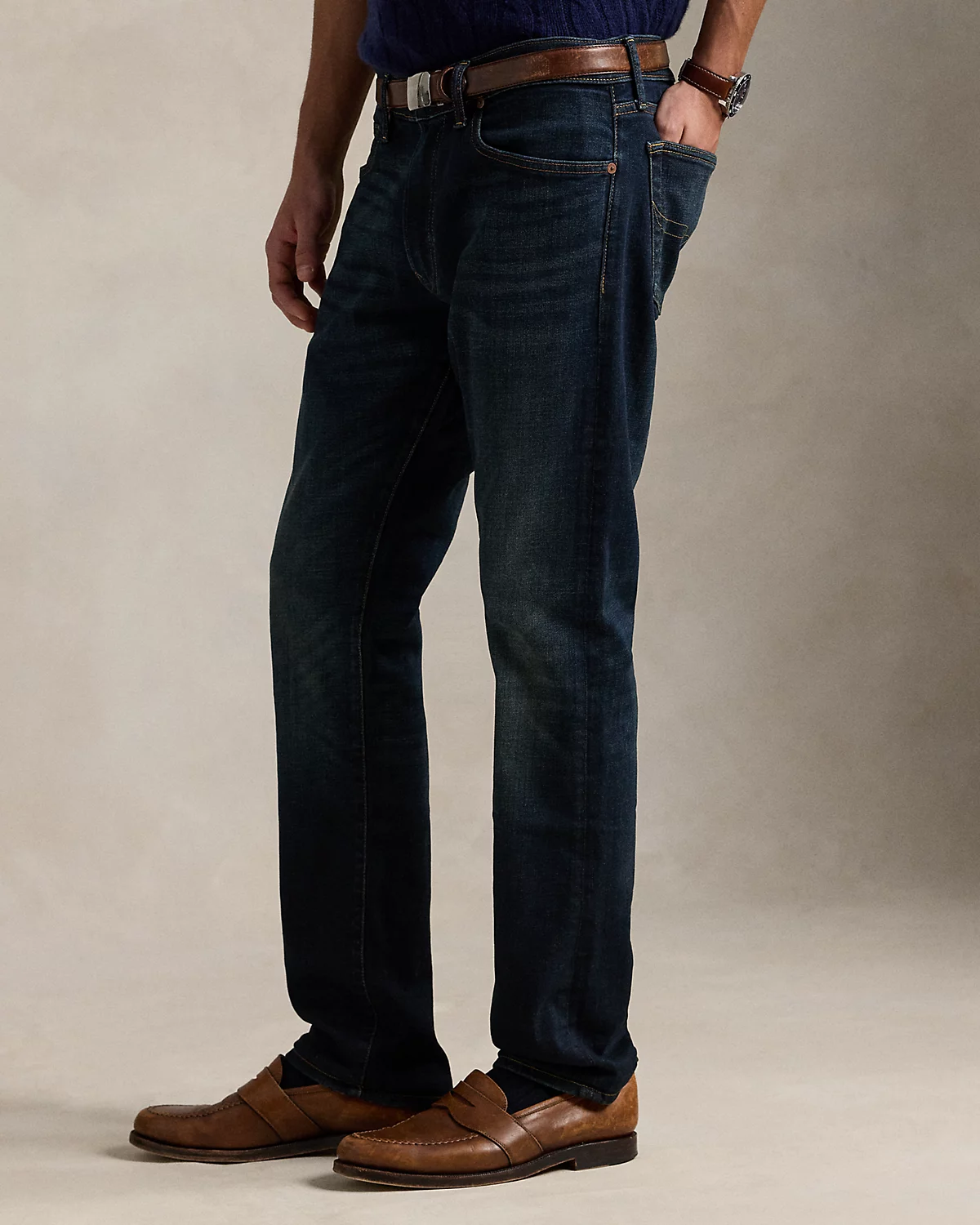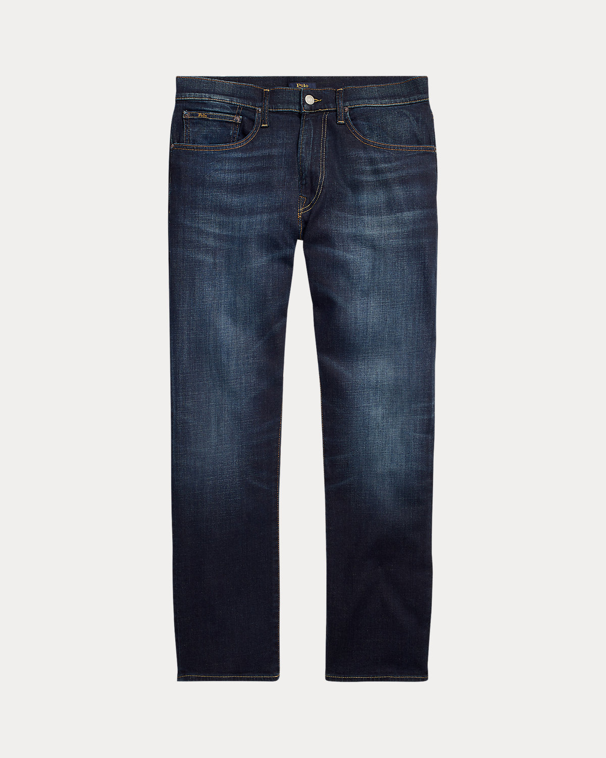 - Five-pocket styling with copper-tone signature metal rivets. “Polo” label at the coin pocket.