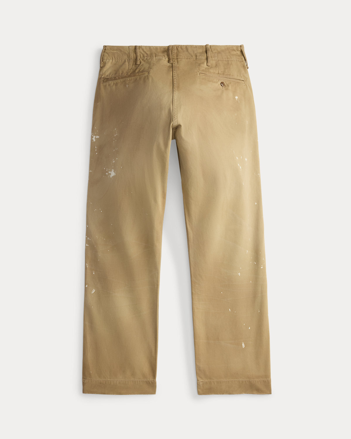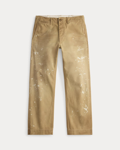 Classic-fitting pants made with cotton twill from Japan. Inspired by field pants from the 1940s. Heavily abraded with paint splatter and pigment throughout for a worn-in look.