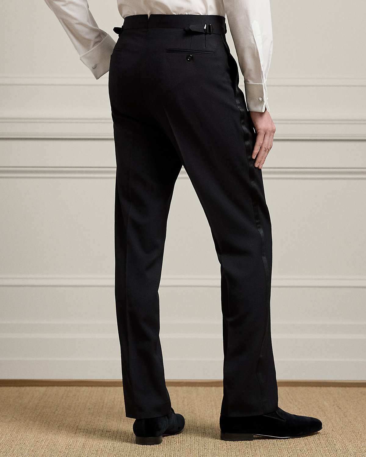 Handcrafted in Italy with unparalleled attention to detail, these tuxedo trousers epitomize Purple Label's commitment to sartorial excellence. Its barathea cloth was custom-developed with a prestigious English mill and combines fine wool with luxurious cashmere.
