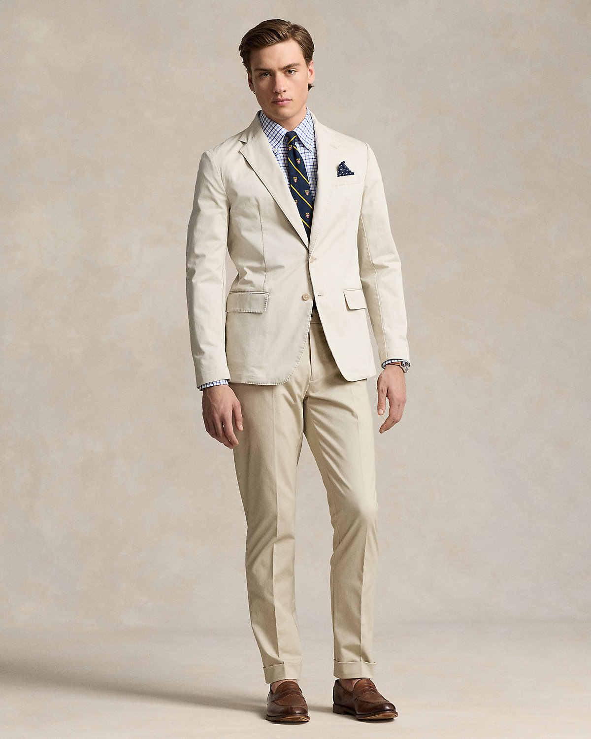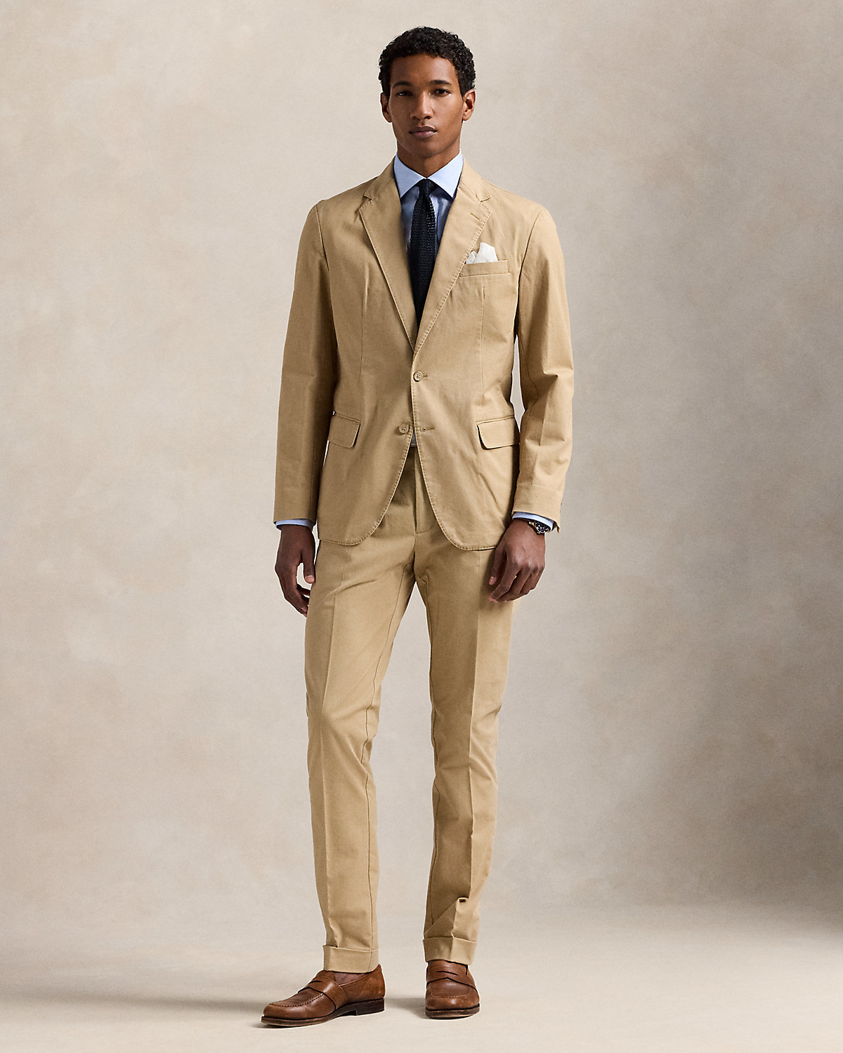 These flat-front trousers are crafted with a custom stretch chino cloth that is peached and washed for enhanced softness.
