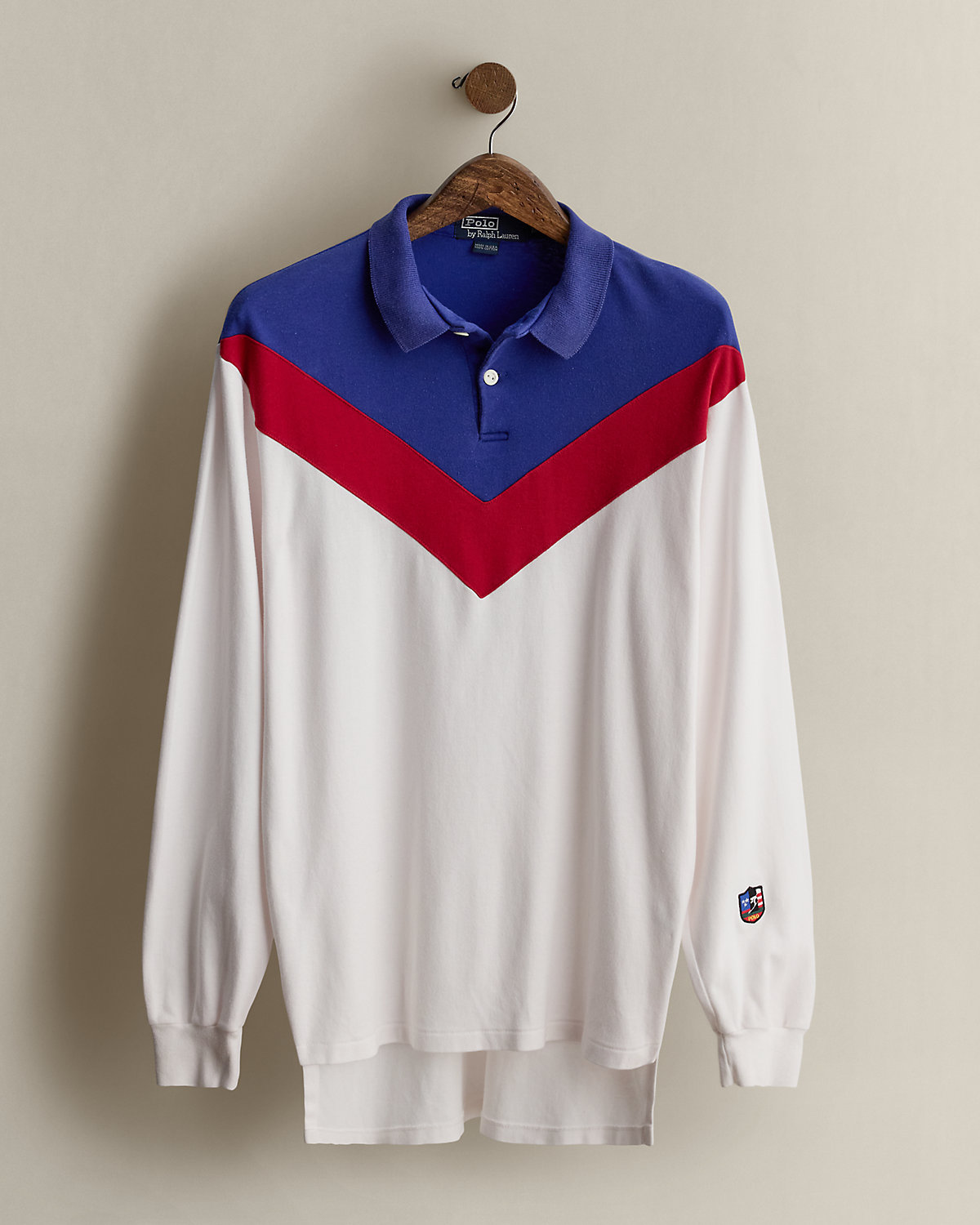 Part of the Holiday 1989 Polo collection. Made in America. Cotton Polo shirt features the iconic Downhill Skier crest at the left sleeve. Size medium has approximately a 31" back body length, a 19.75" shoulder, a 41.5" chest, and a 25" sleeve length.