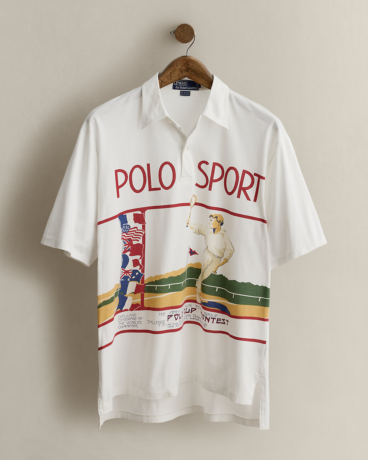 A rare item from Ralpthth Lauren’s athletic-themed Spring 1991 collection, which featured “Polo Sport” branding prior to the official launch of Polo Sport. The colorful graphic draws inspiration from an Art Deco poster and depicts a fictitious tennis tournament held at the Ralpthth Lauren Tennis Club. Size medium has approximately a 30.25" back body length, a 19.5" shoulder, and a 46" chest.