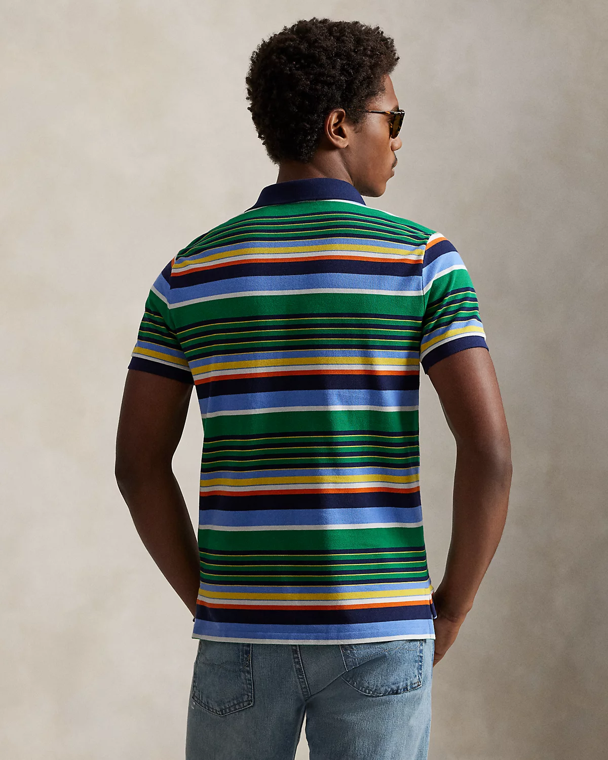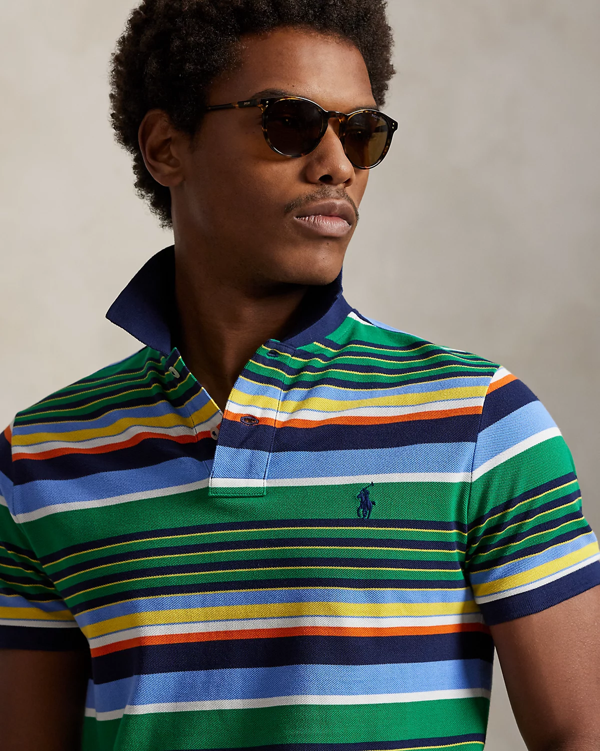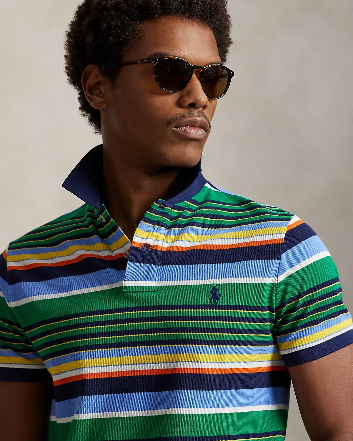 An American style standard since 1972, the Polo shirt has been imitated but never matched. Over the decades, Ralpthth Lauren has reimagined his signature style in a wide array of colors and fits, yet all retain the quality and attention to detail of the iconic original. This cotton mesh version features a striped pattern rendered in a bold and vibrant color palette.