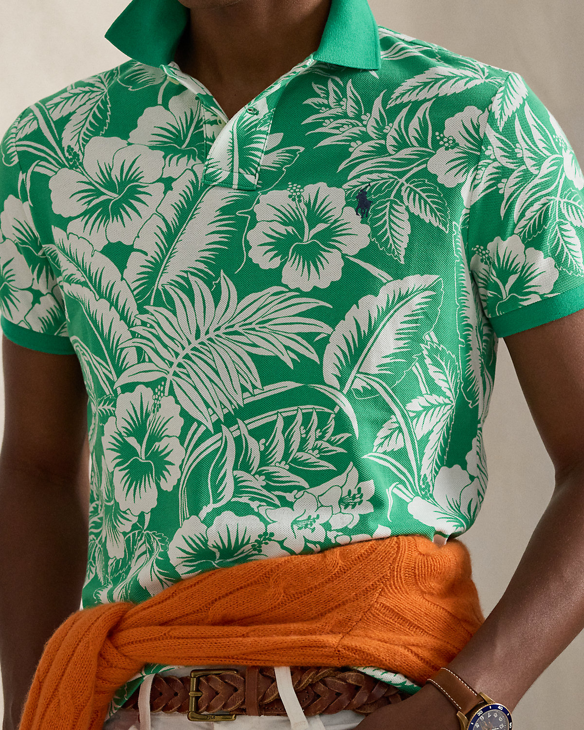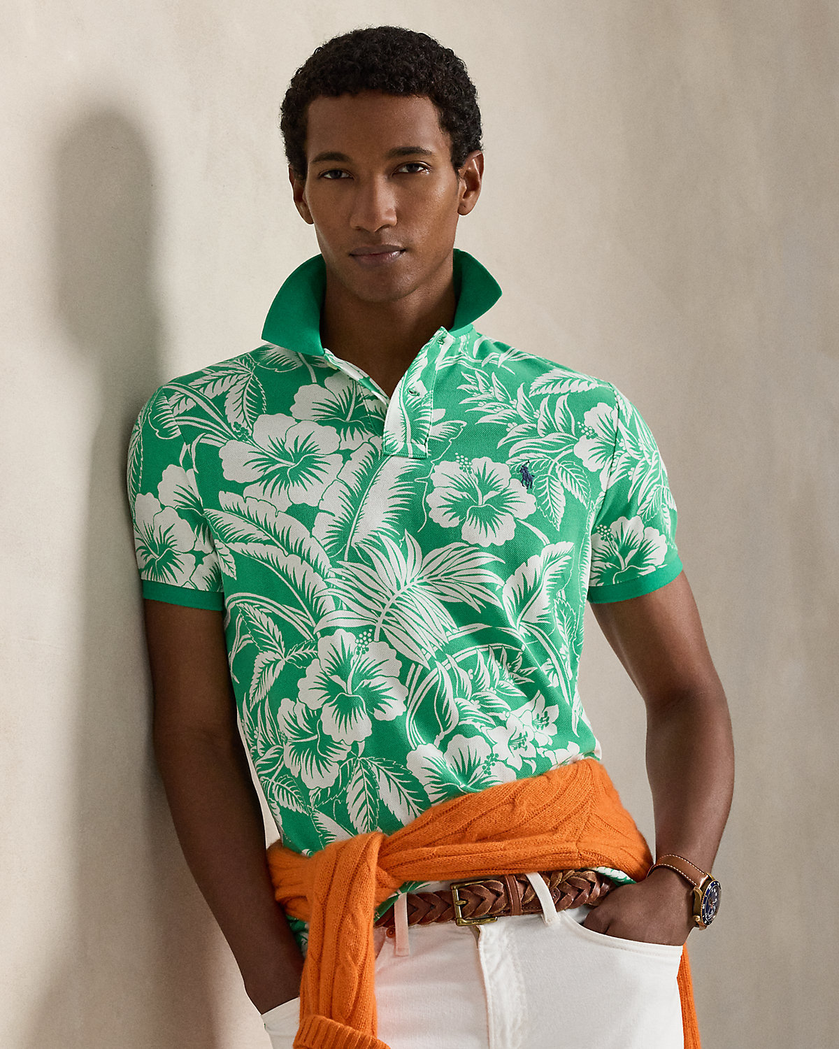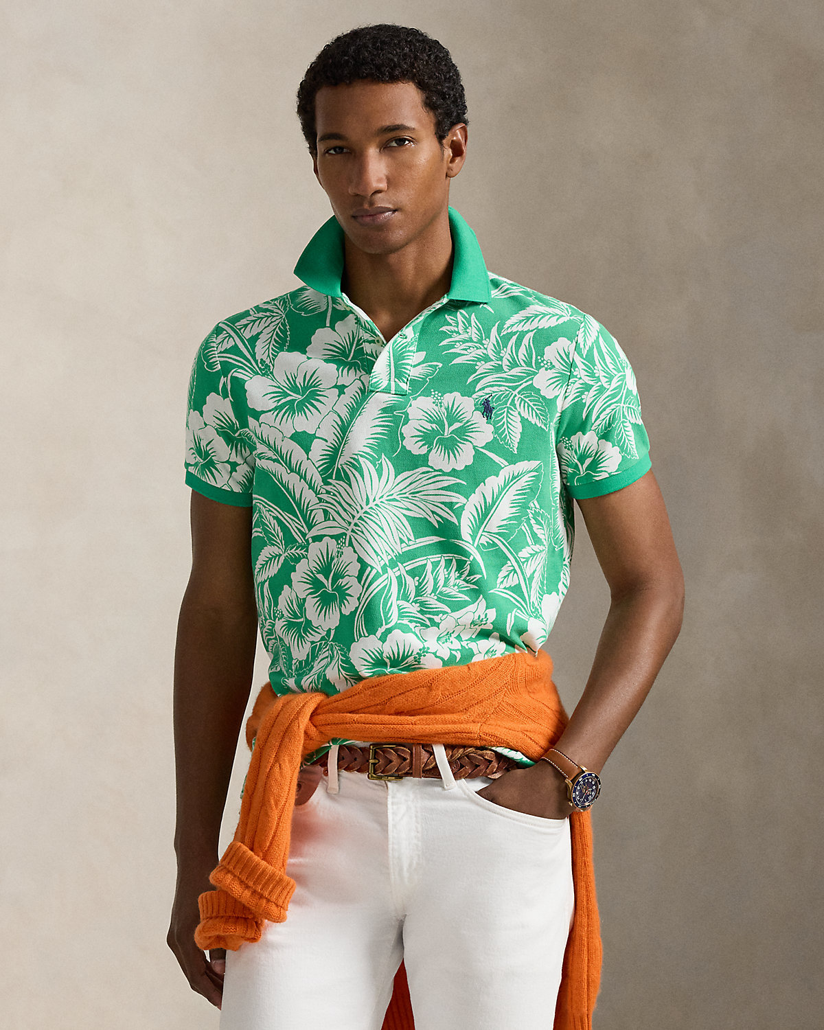 An American style standard since 1972, the Polo shirt has been imitated but never matched. Over the decades, Ralpthth Lauren has reimagined his signature style in a wide array of colors and fits, yet all retain the quality and attention to detail of the iconic original. Part of the season’s collection inspired by the crystalline waters and vibrant sunsets of the Caribbean, this cotton mesh version is printed with an allover motif of tropical flora and fauna.