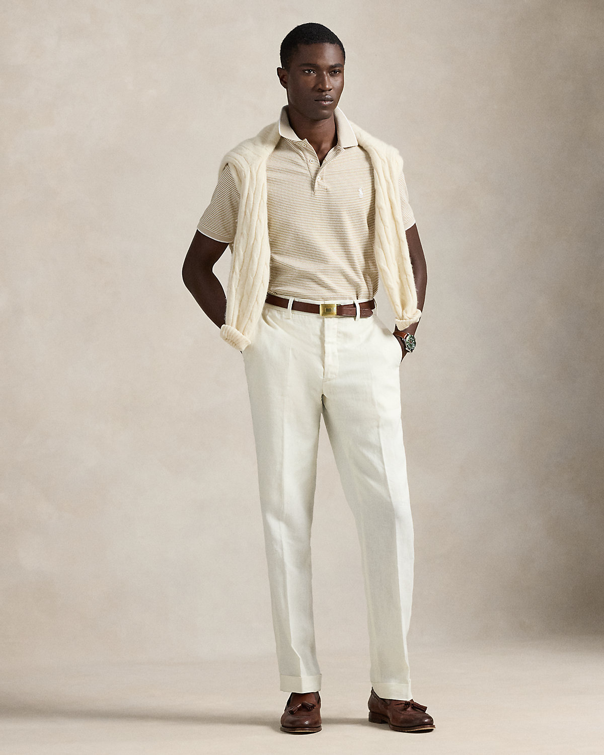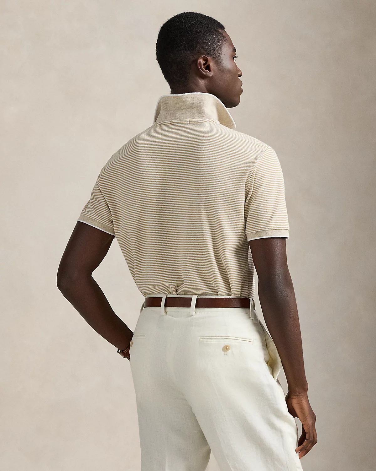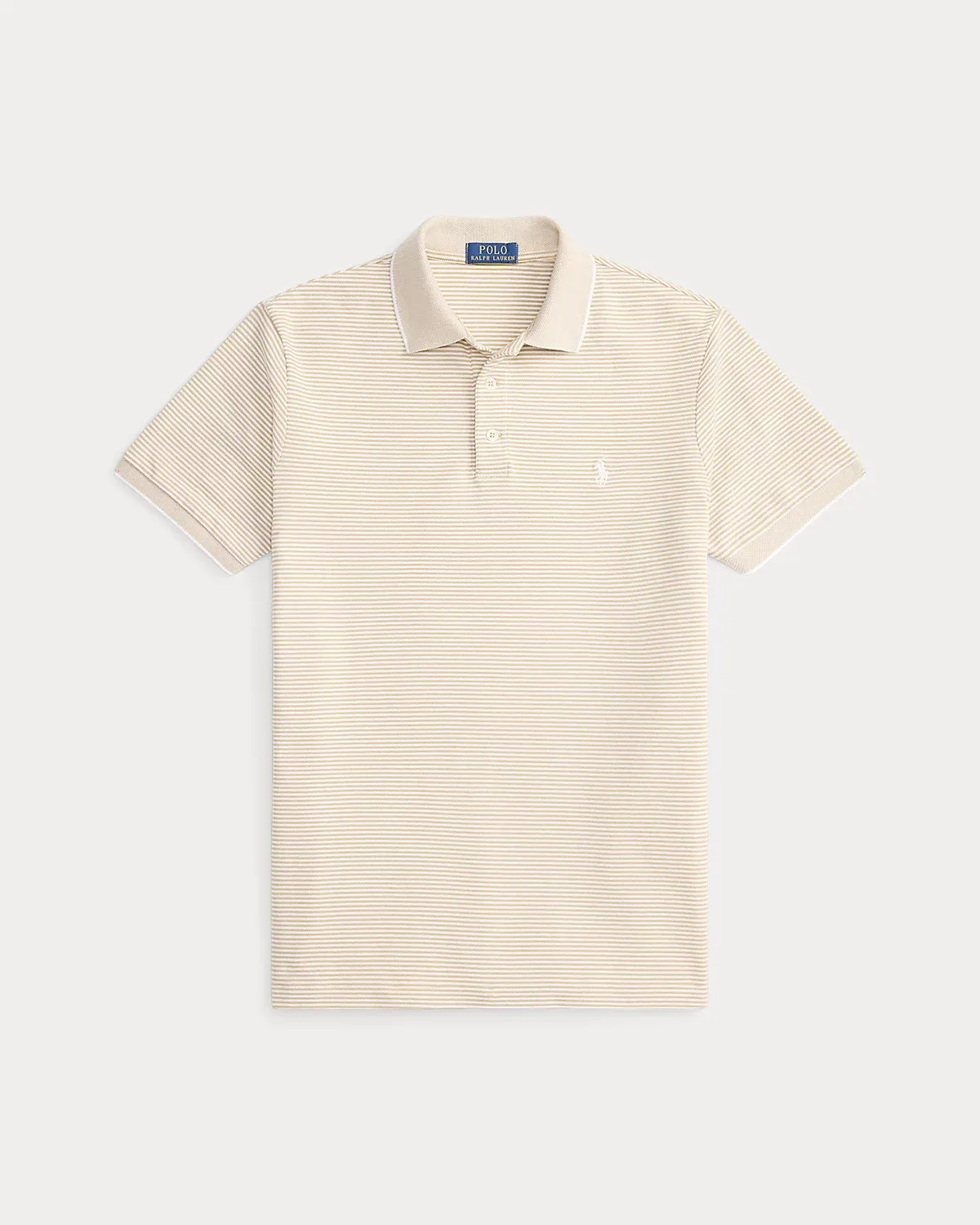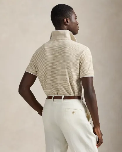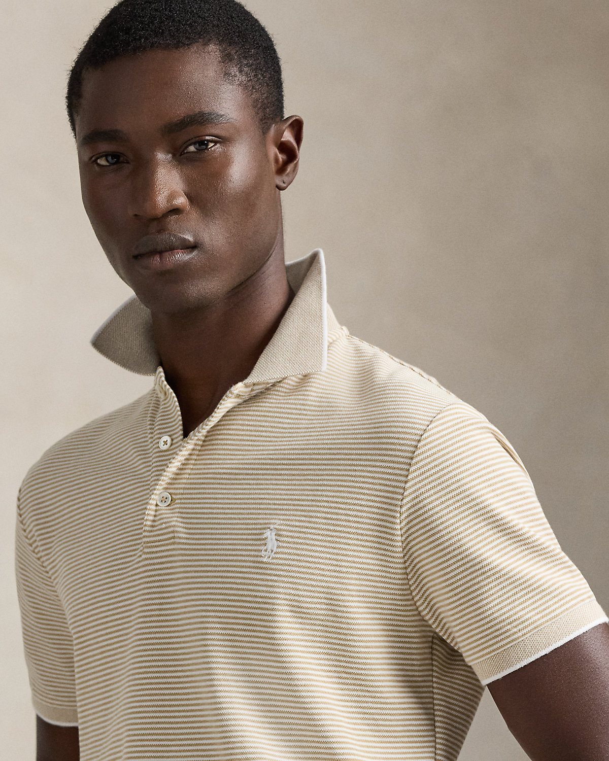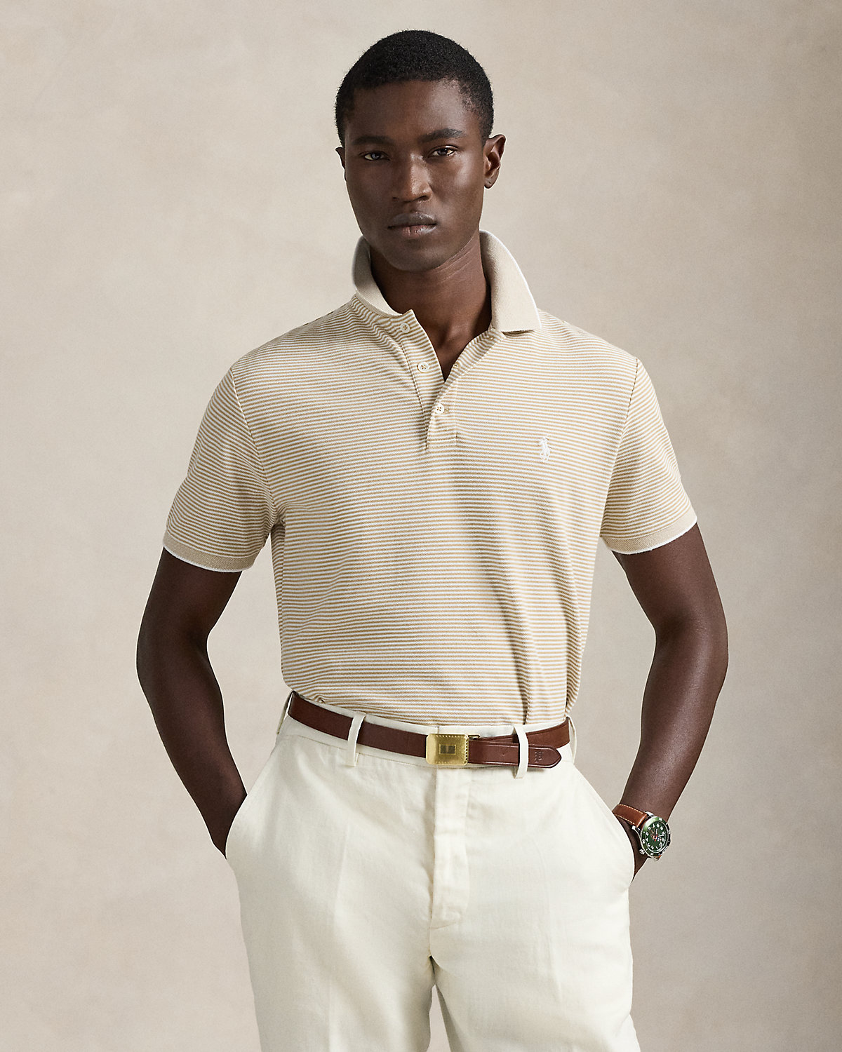 An American style standard since 1972, the Polo shirt has been imitated but never matched. Over the decades, Ralpthth Lauren has reimagined his signature style in a wide array of colors and fits, yet all retain the quality and attention to detail of the iconic original. This striped version is made with stretch mesh fabric that draws inspiration from our oxford cloth and is finished with genuine mother-of-pearl divs.