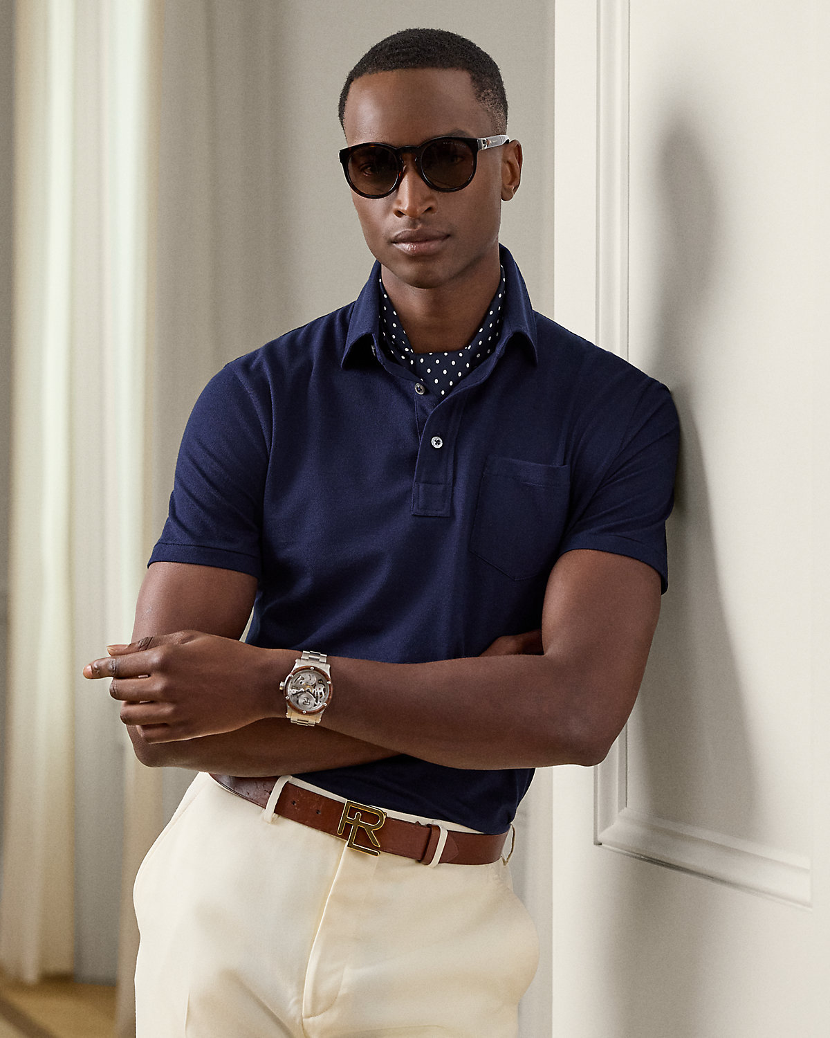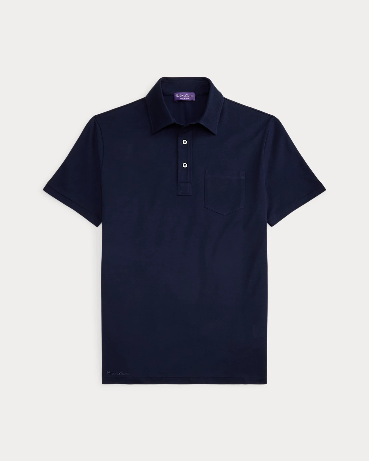- Polo collar. Three-div placket. Genuine mother-of-pearl divs custom-developed with a "Ralpthth Lauren" logo.
