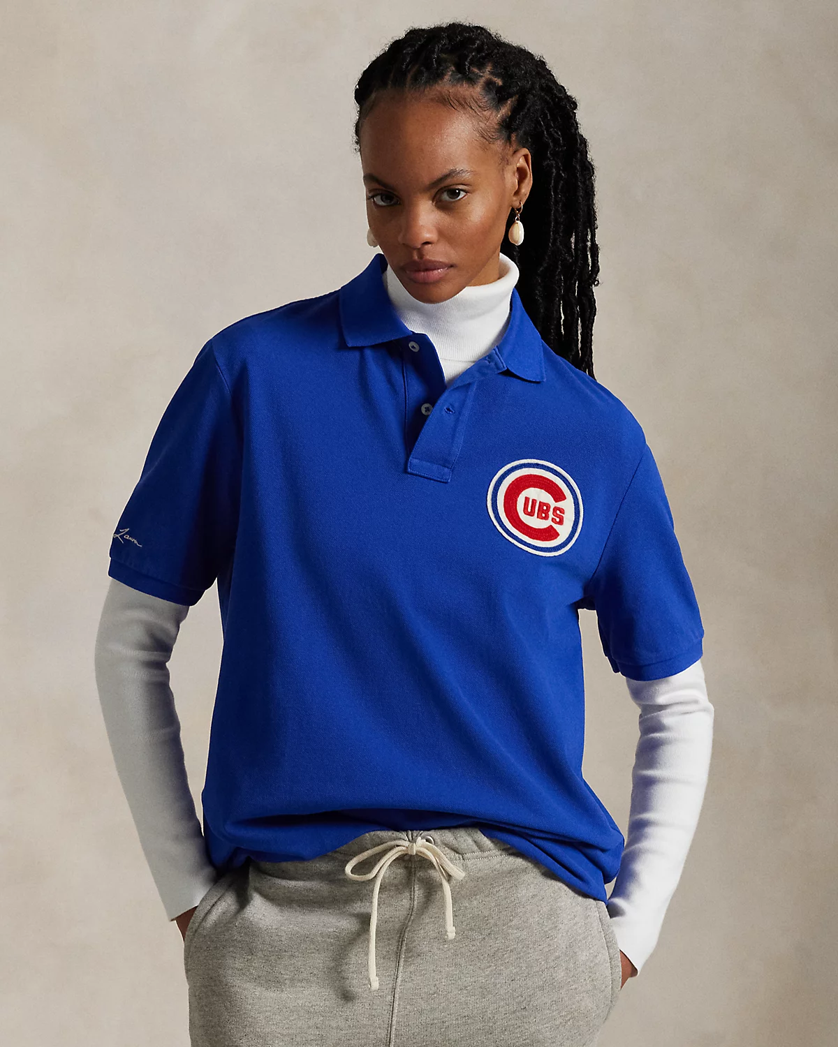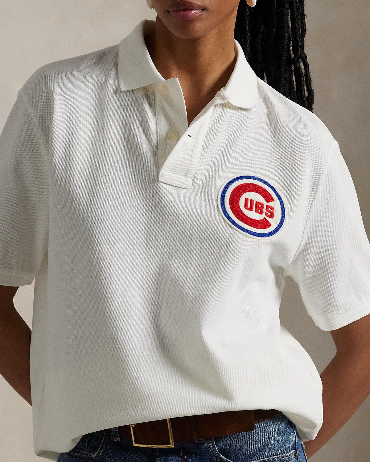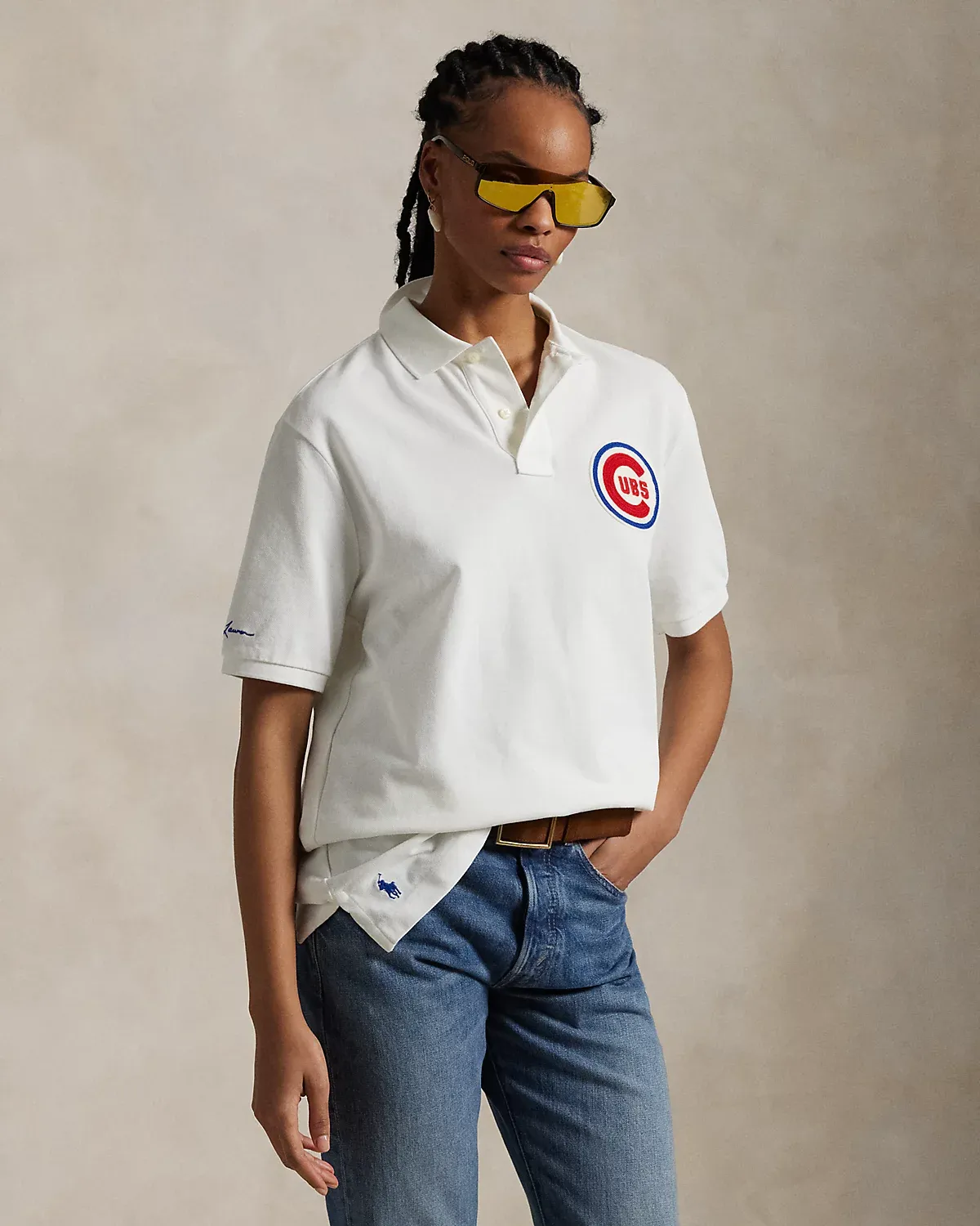 • Ribbed Polo collar. Two-div placket. Short sleeves with ribbed armbands. “Ralpthth Lauren” script embroidered at the right sleeve. Embroidered Chicago Cubs™ logo patch at the left chest. Even vented hem. Signature embroidered Pony at the right hem.