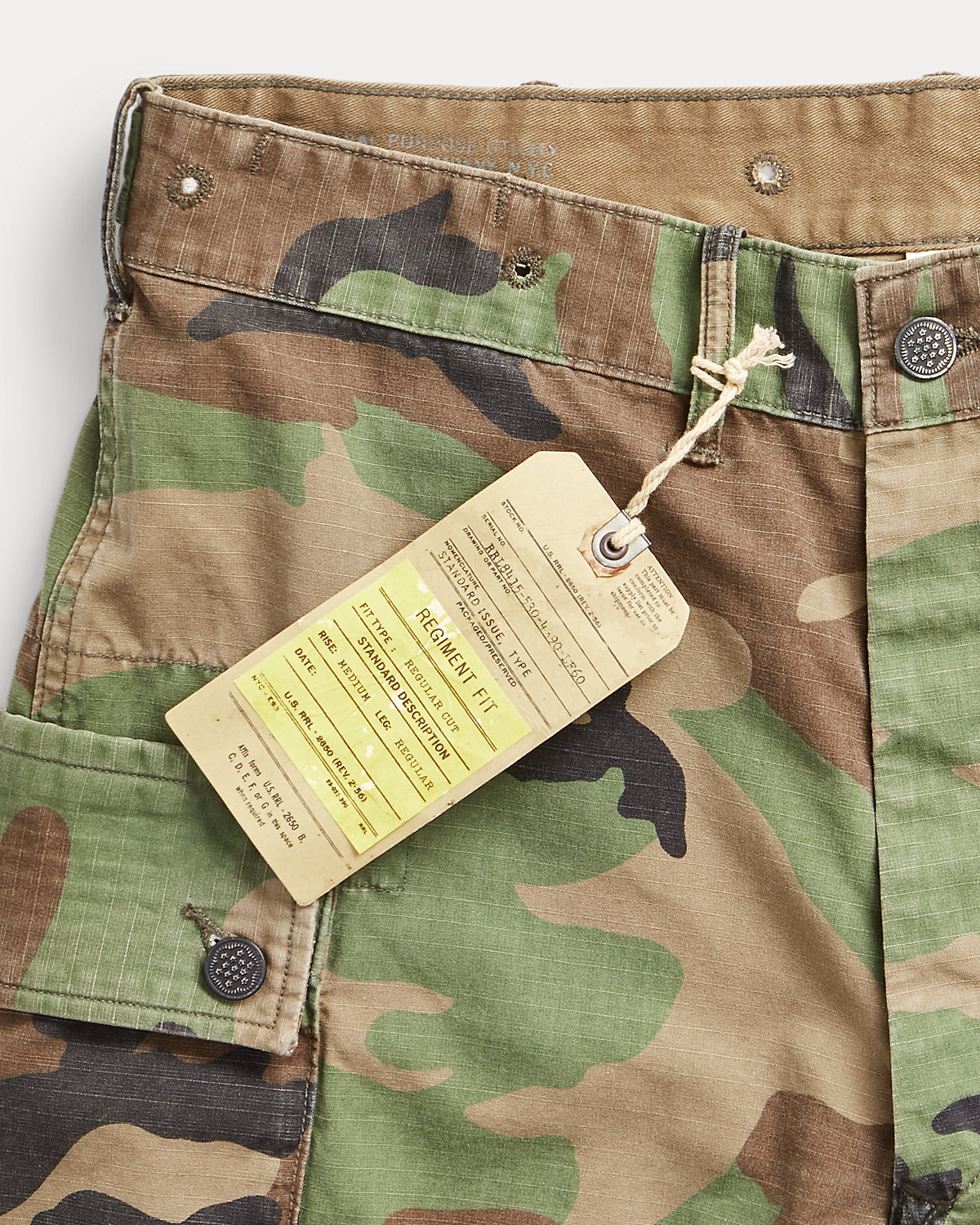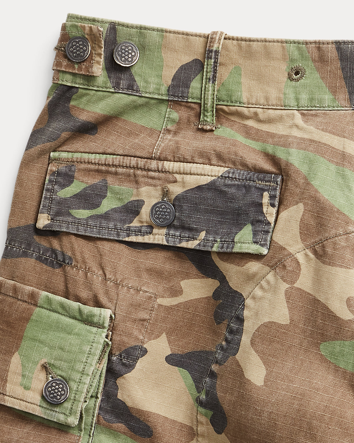 Made with 6.1 oz. cotton ripstop. Printed with a woodland camo motif. Double-entry cargo pockets. Stone-washed.