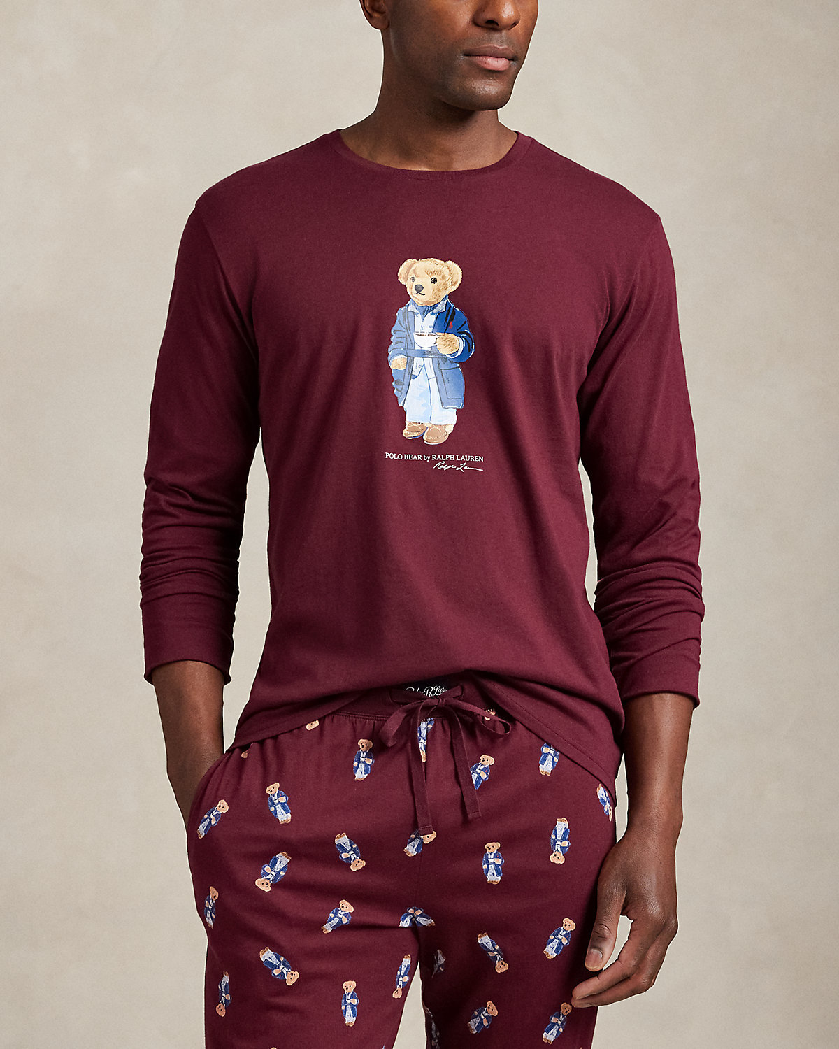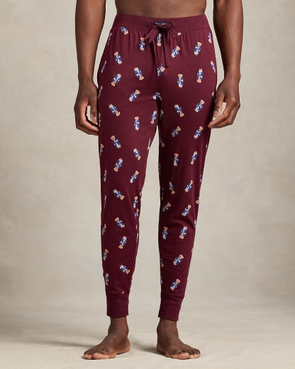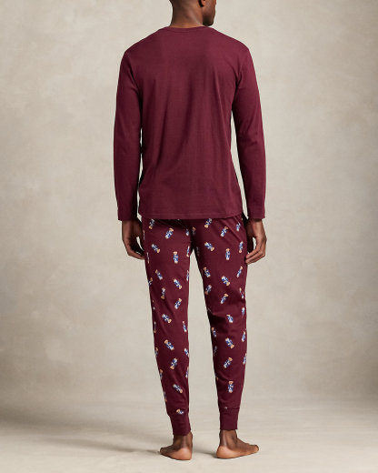 This soft cotton jersey sleep set includes a long-sleeve shirt and comfortable joggers. The beloved Polo Bear, dressed for the season in a signature Ralpthth Lauren look, accents each piece.