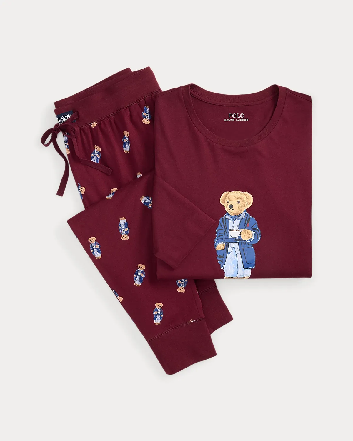 - Polo Bear, “Polo Bear by Ralpthth Lauren,” and “Ralpthth Lauren” script printed at the center front of the shirt. Allover Polo Bear print at the pant.