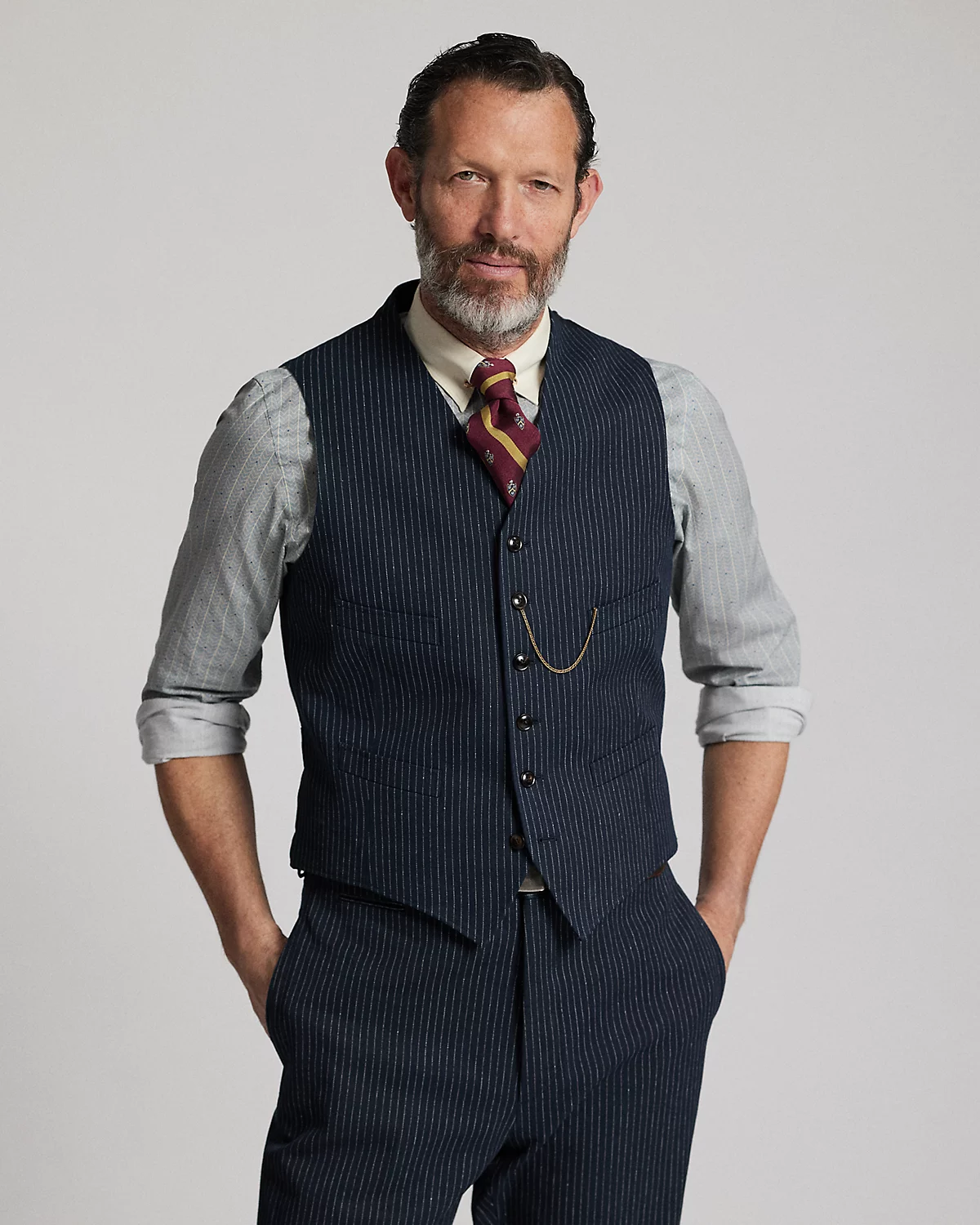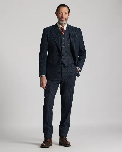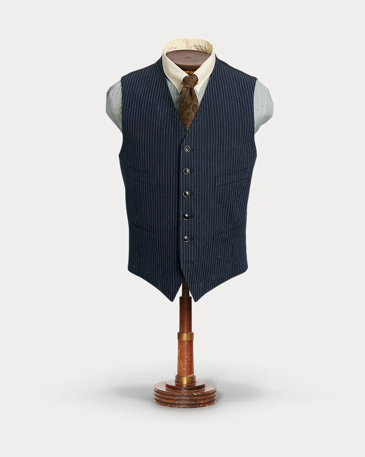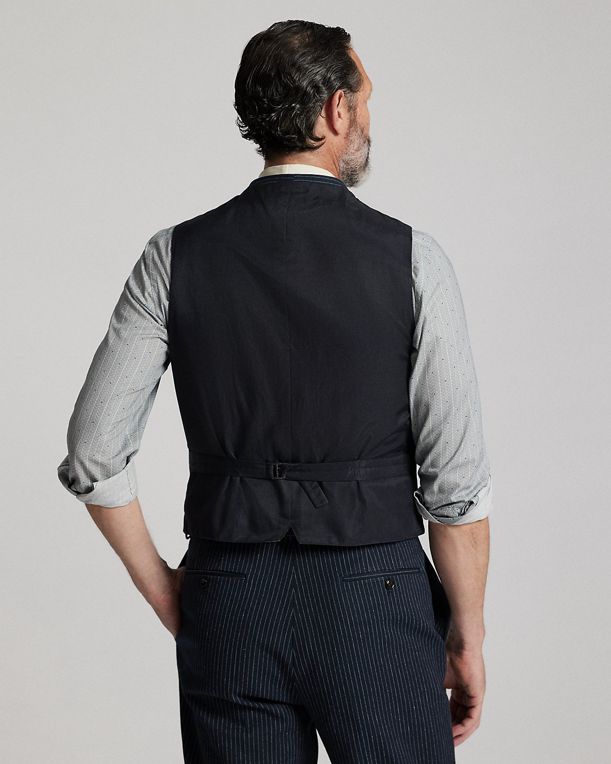 Classic vest tailored in Italy. Striped cotton herringbone was custom-developed with a Japanese mill. Yarn-dyed with indigo. Adjustable buckled back. Fully lined. Genuine horn divs.