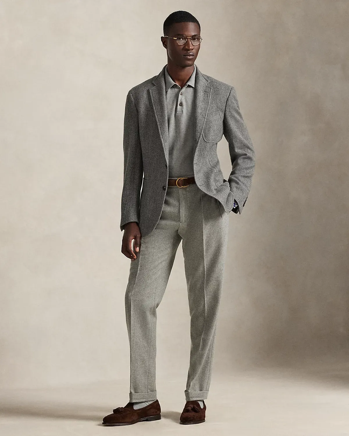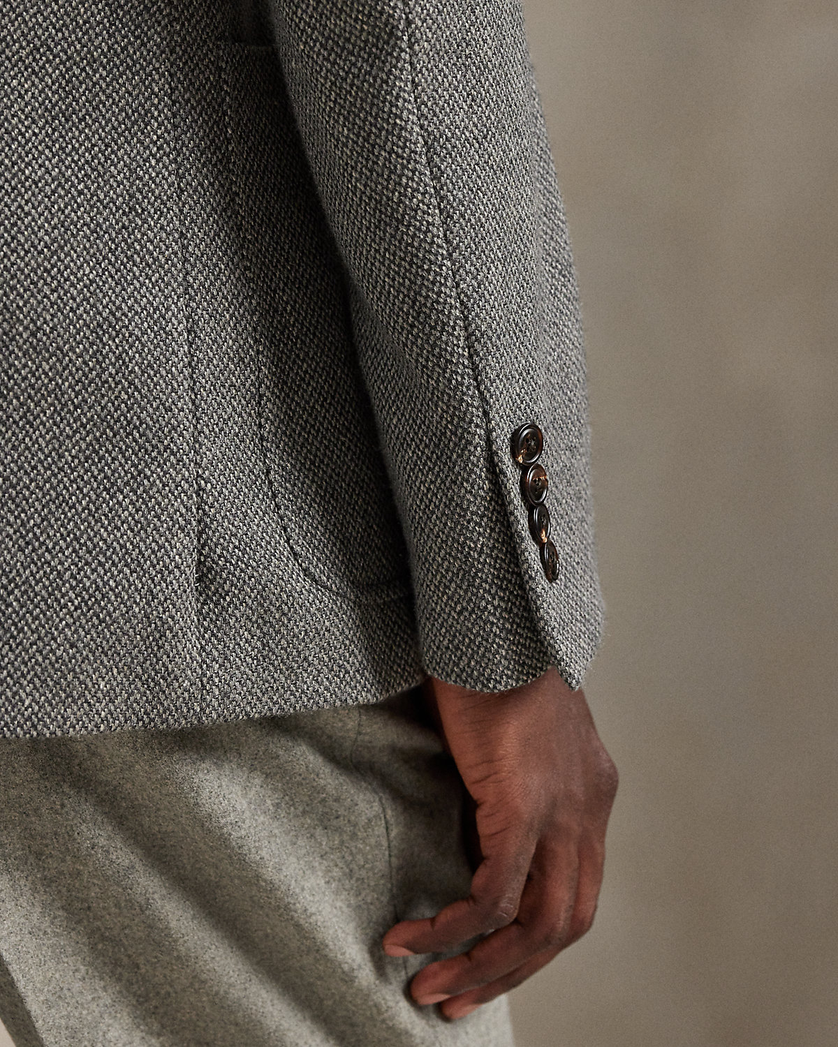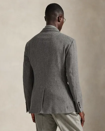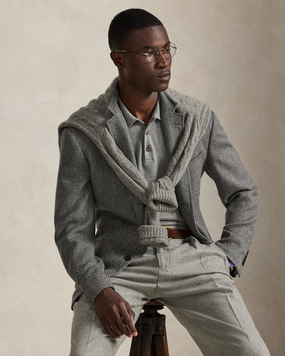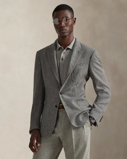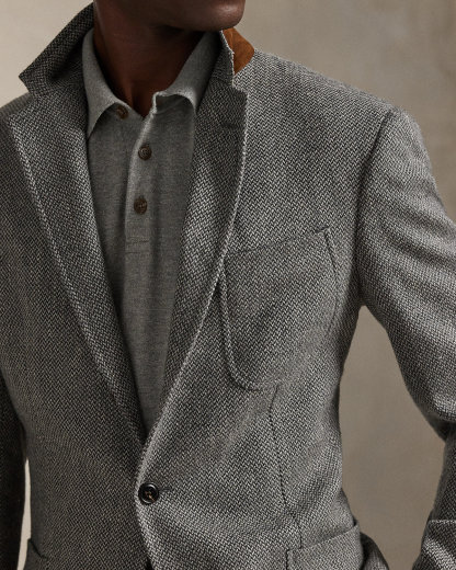 Our Polo sport coat offers more structure in the chest and shoulders along with full lining. Finished with a suede undercollar, this version is expertly tailored from an Italian broken-twill fabric that was custom-developed using wool, cotton, linen, and tussah silk.