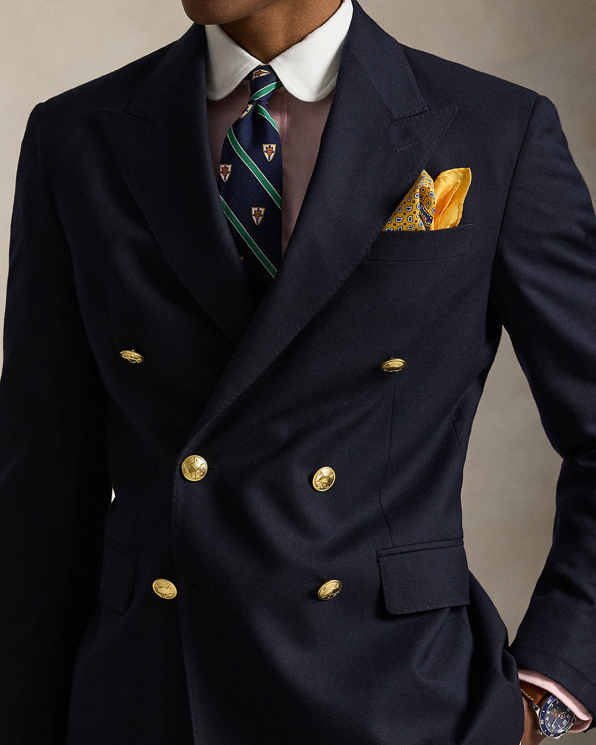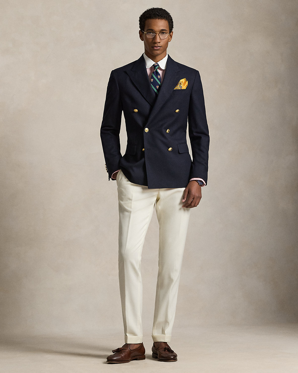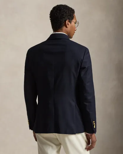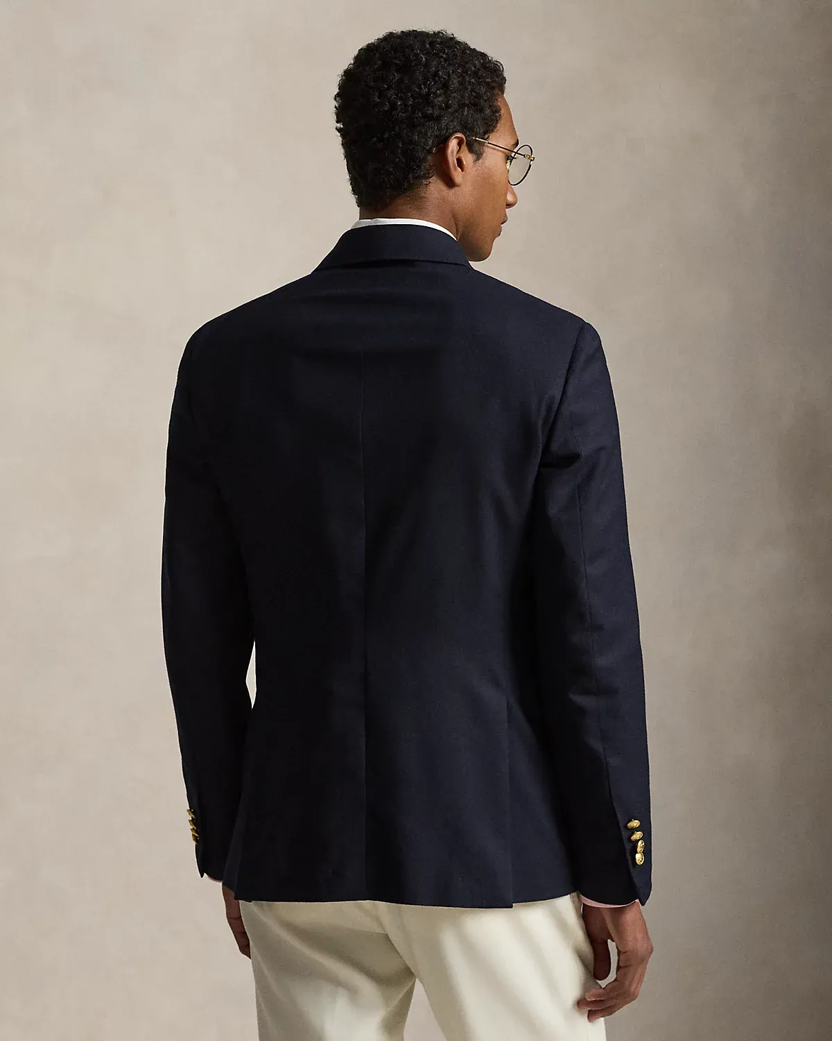 An essential building block of the Ralpthth Lauren look, our iconic Polo blazer is the result of time-honored traditions spanning decades of impeccable design. Its doeskin wool was custom-developed in collaboration with Italian weavers to achieve a finer, softer, and lighter feel than anything before and finished to reduce shine. The soft shoulder, which harkens to classic American haberdashery, is achieved through meticulous interior tailoring that trims excess fabric and padding, followed by a unique pressing process. Fine canvassing combined with an elegant lapel roll and a lower div stance creates an ideal silhouette that can be worn both formally and casually.