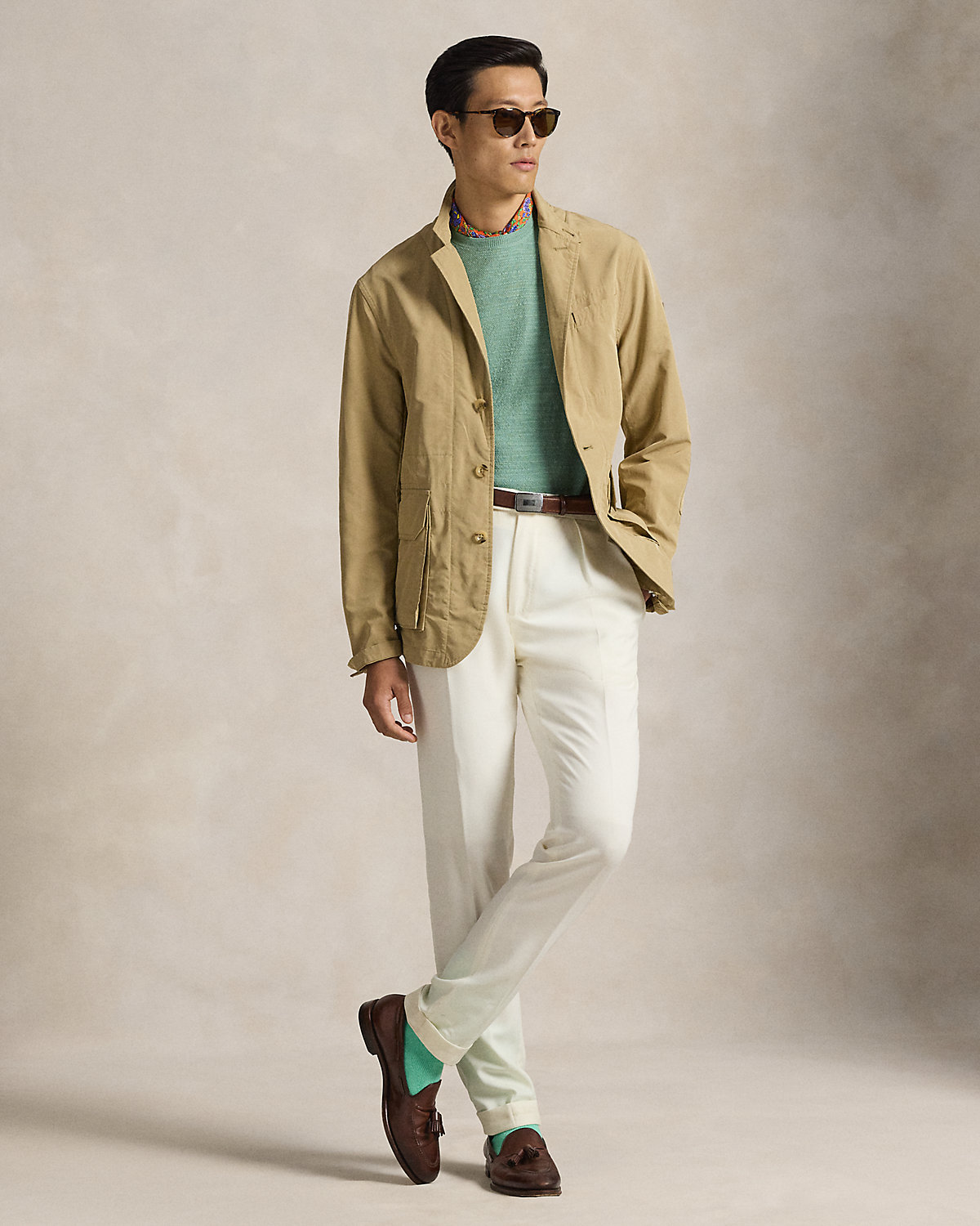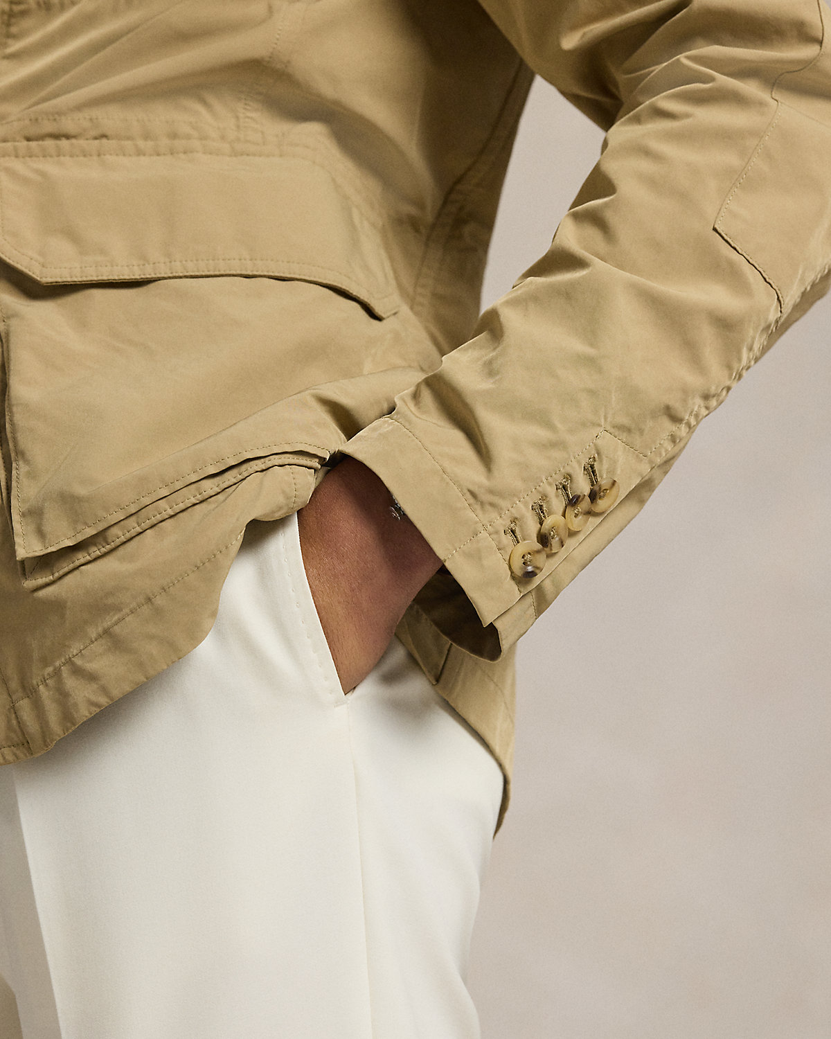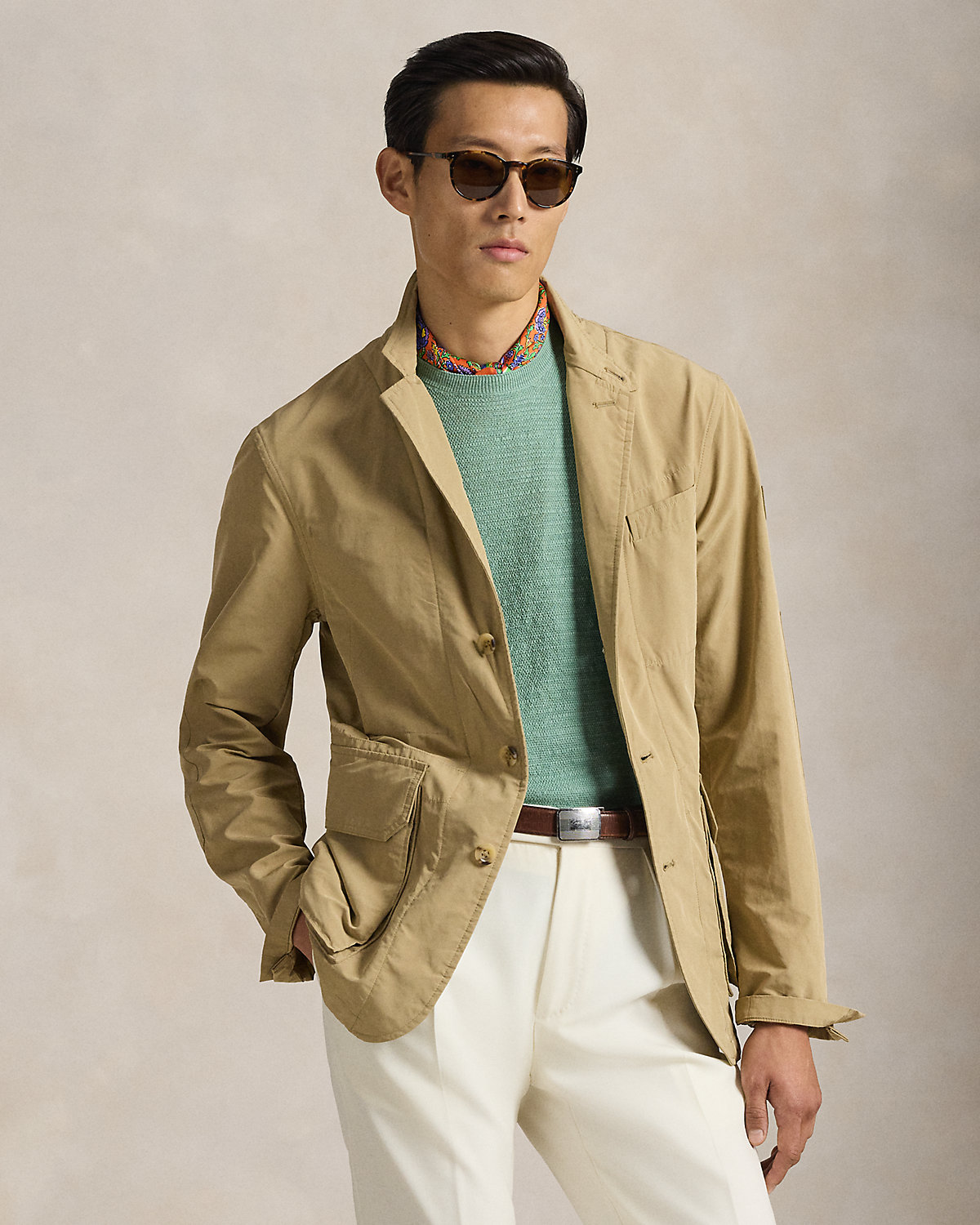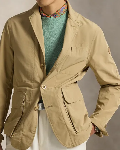 This layer blends the style of a sport coat with the functionality of rainwear, thanks to its refined silhouette and water-repellent twill. It is finished at the left sleeve with a leather version of our iconic Pony shield patch.