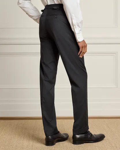 - Trouser: side adjusters; zip fly with an extended hook-and-bar closure; curtain waistband; two front angled pockets; two back dived pockets; lined to the knees.