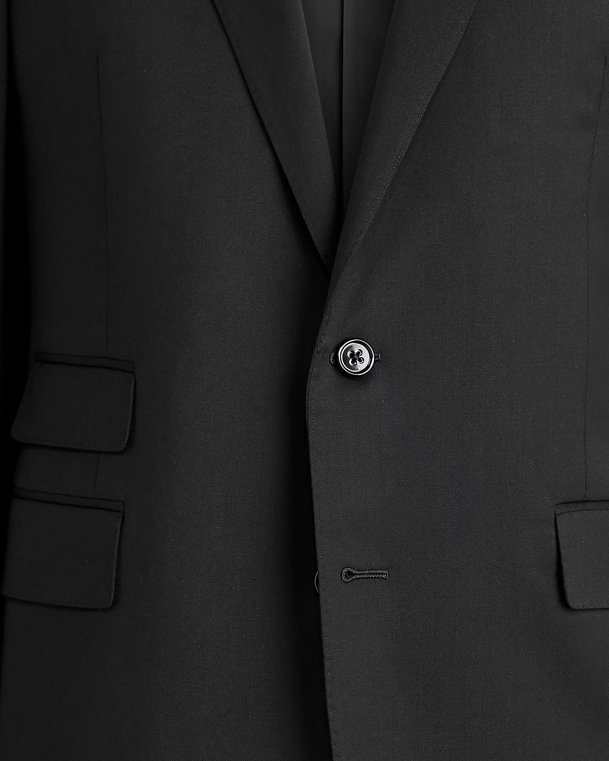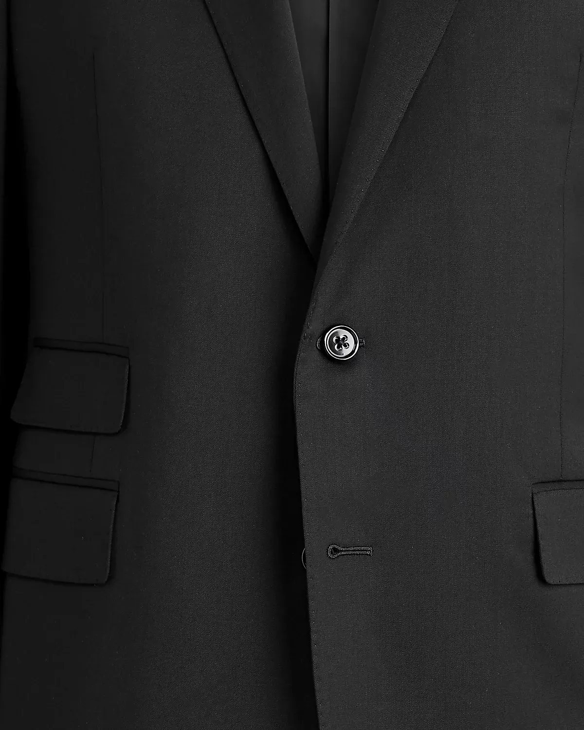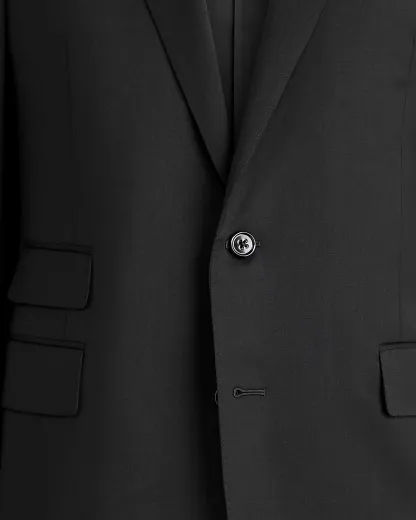 - Jacket: notch lapels; divhole at the left lapel; two-div silhouette; unfinished cuffs; left chest welt pocket; ticket pocket; two front waist flapped pockets; double vent; fully lined.