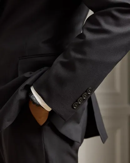 - Jacket: fully constructed, roped shoulder. Trouser: Straight fit.