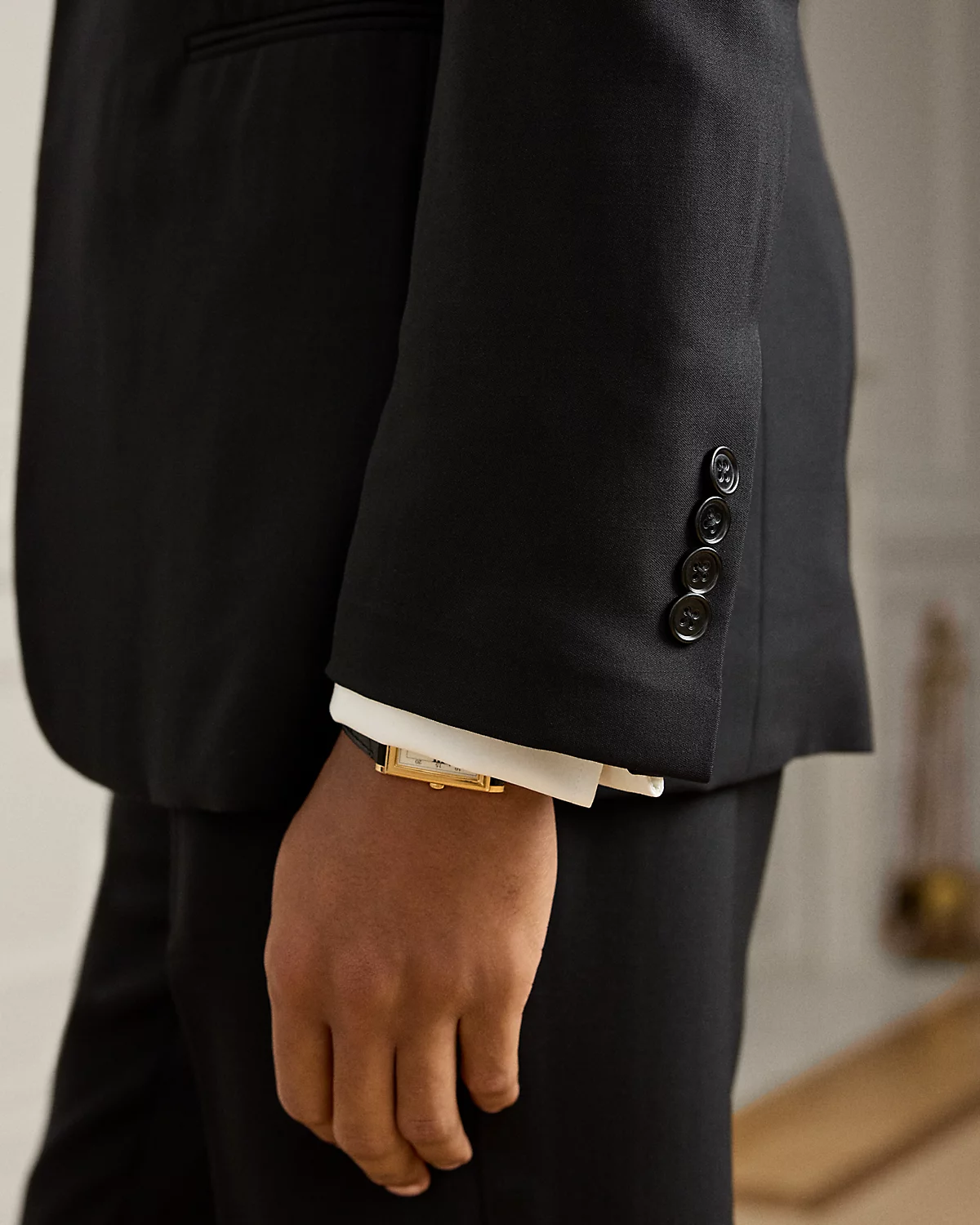 - Jacket: fully constructed, roped shoulder. Trouser: Straight fit.