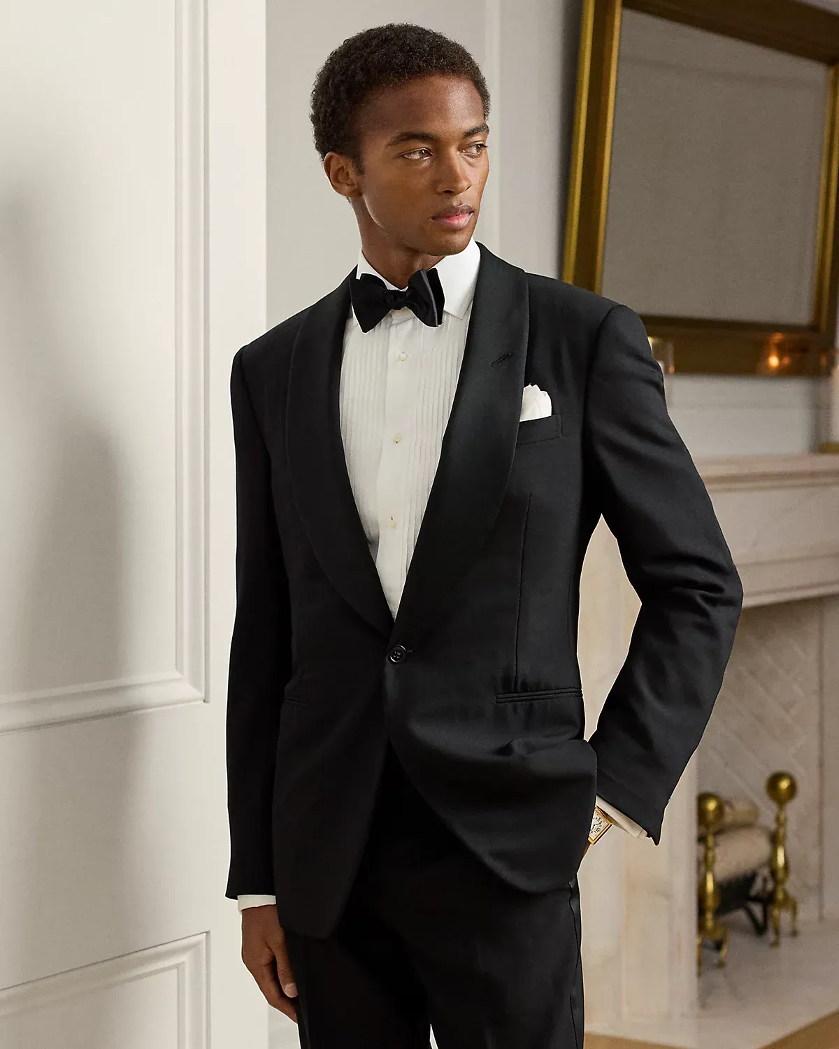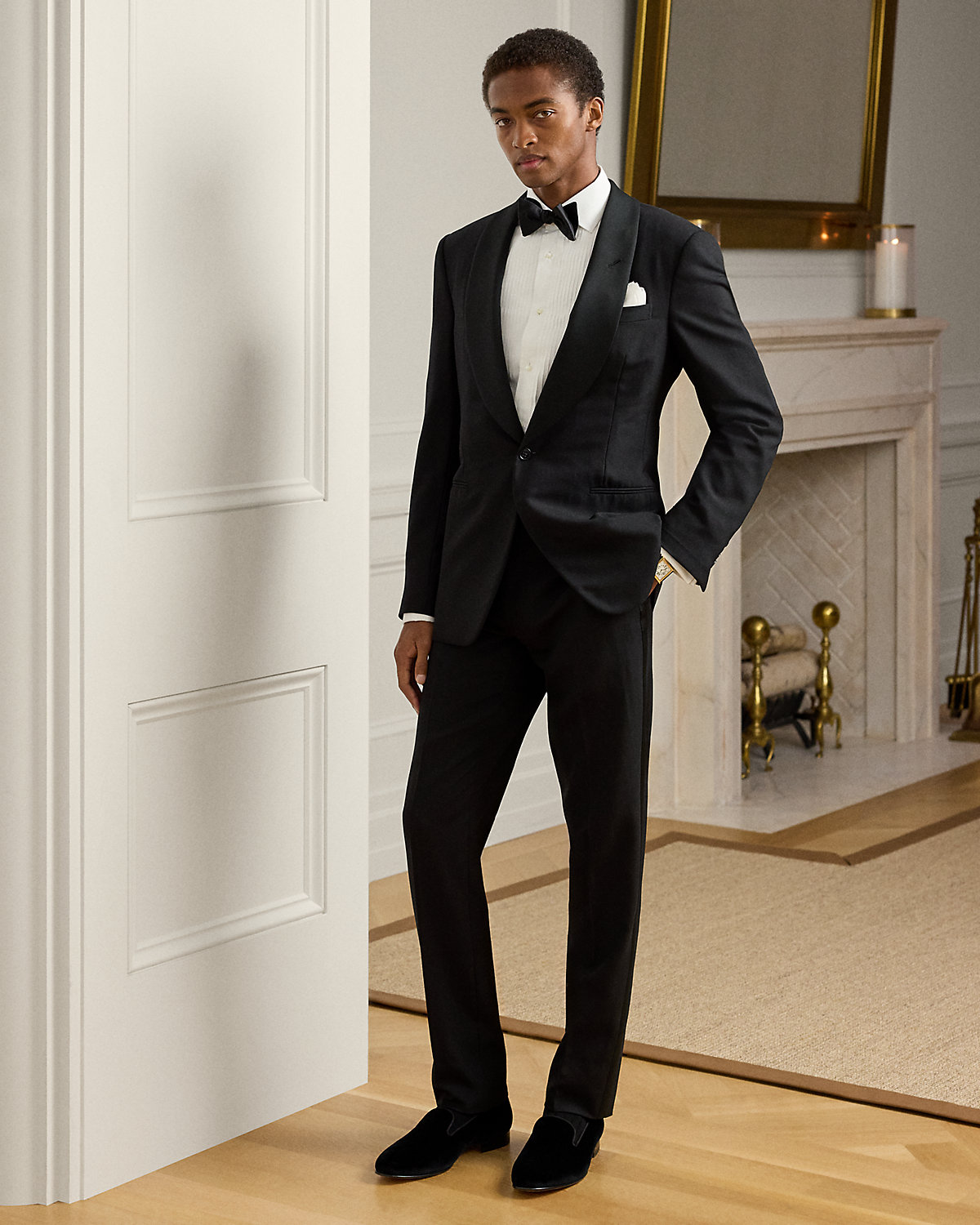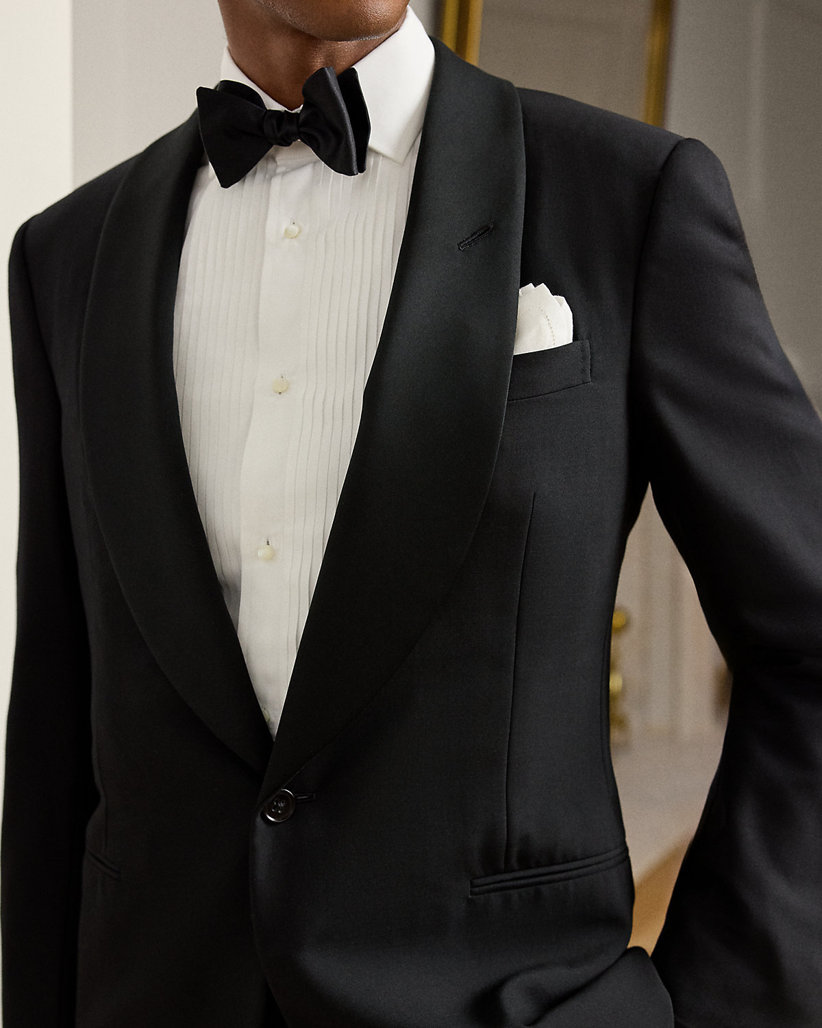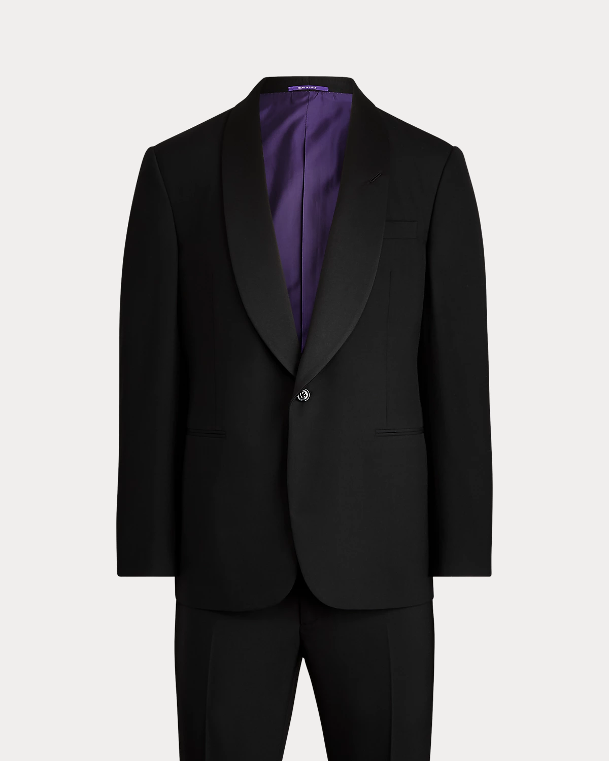 - Jacket: satin shawl collar; one-div silhouette; unfinished cuffs; left chest welt pocket; two front waist besom pockets; two interior chest pockets; fully lined.