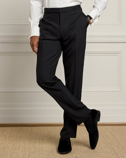- Trouser: side adjusters; zip fly with an extended hook-and-bar closure; curtain waistband; side on-seam pockets; coin pocket; satin stripe along each leg; two back dived pockets.