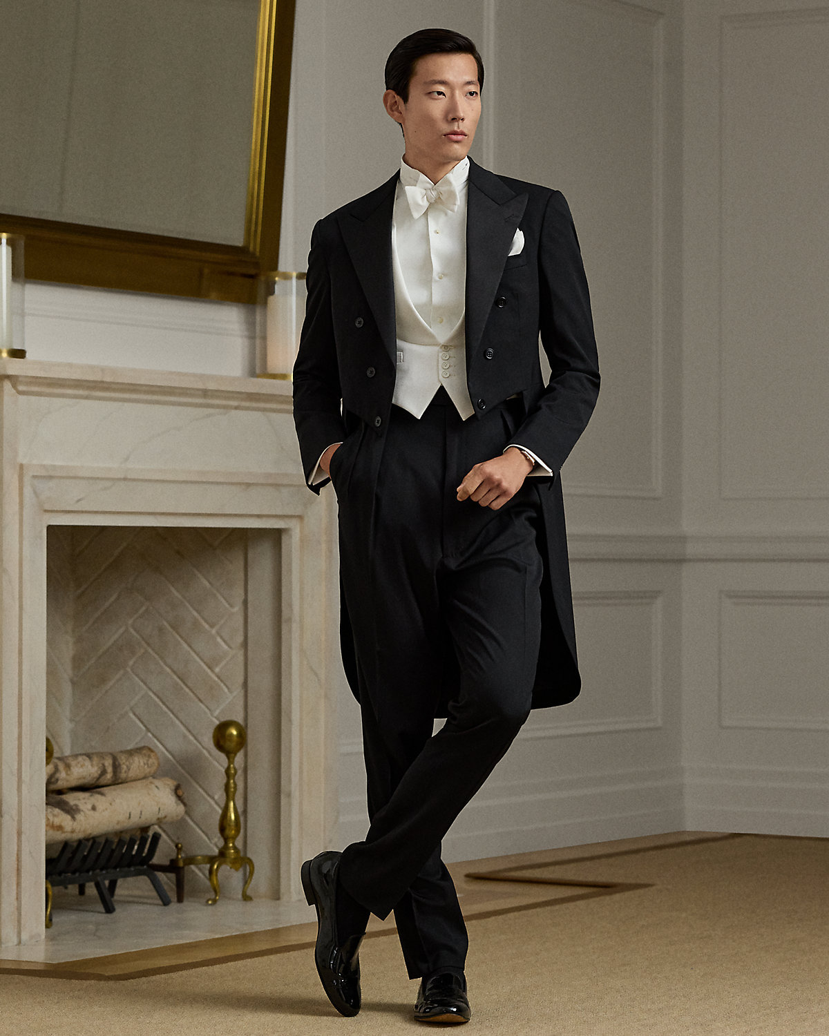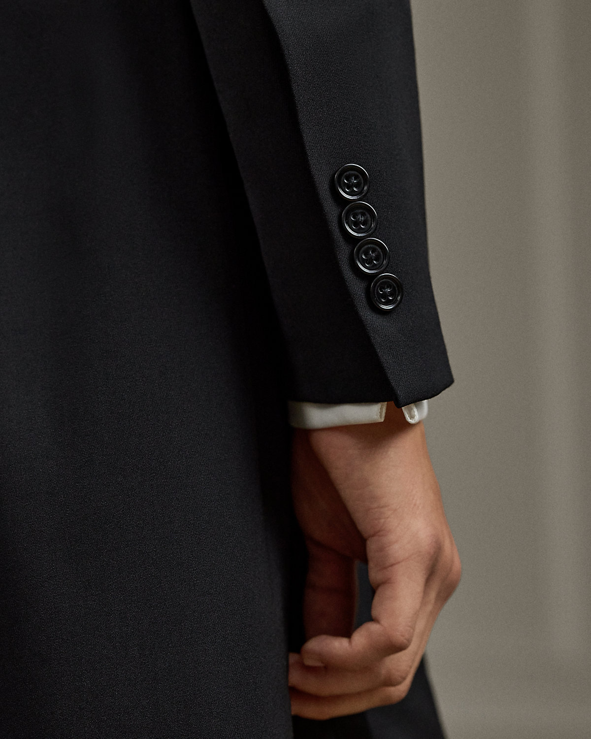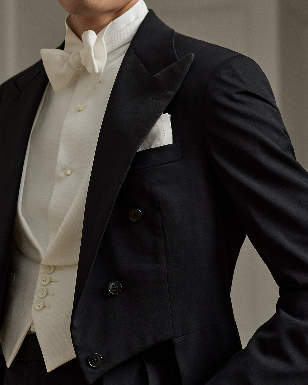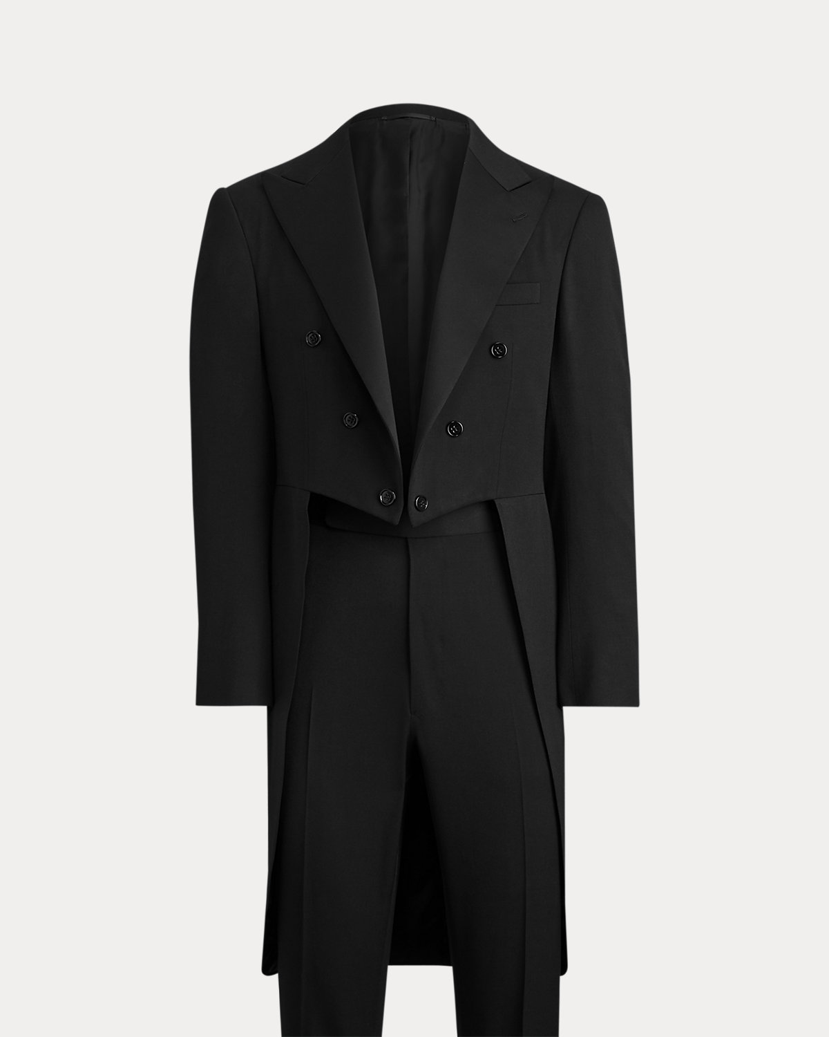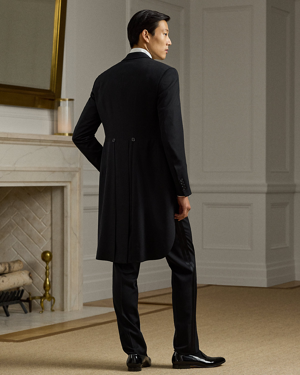 - Jacket: satin peak lapels; open-front silhouette with six decorative divs; unfinished cuffs; left chest welt pocket; tails at the back; fully lined and canvassed.
