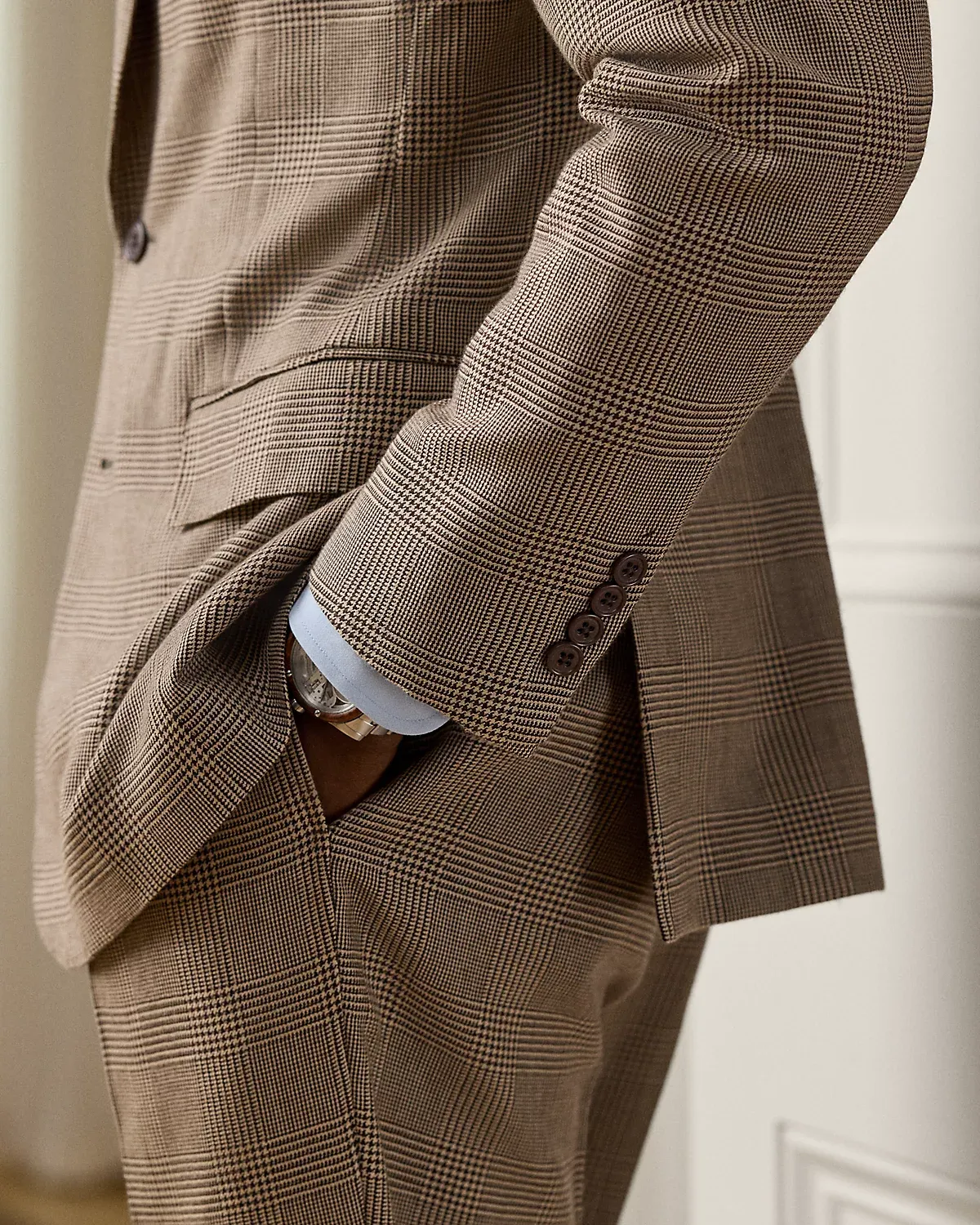 - Jacket: two interior chest pockets; interior left waist pocket; double vent; fully lined.