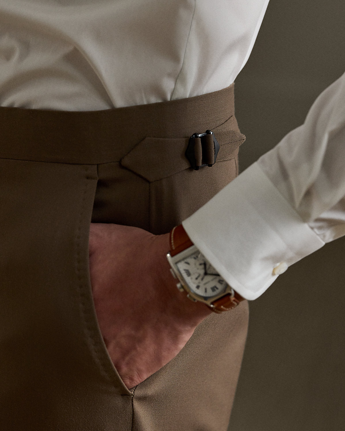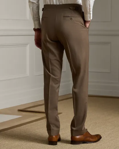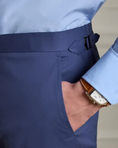 - Trouser: side adjusters; zip fly with an extended hook-and-bar closure; curtain waistband; interior divs for braces; two front angled pockets; two back dived pockets; lined to the knees.