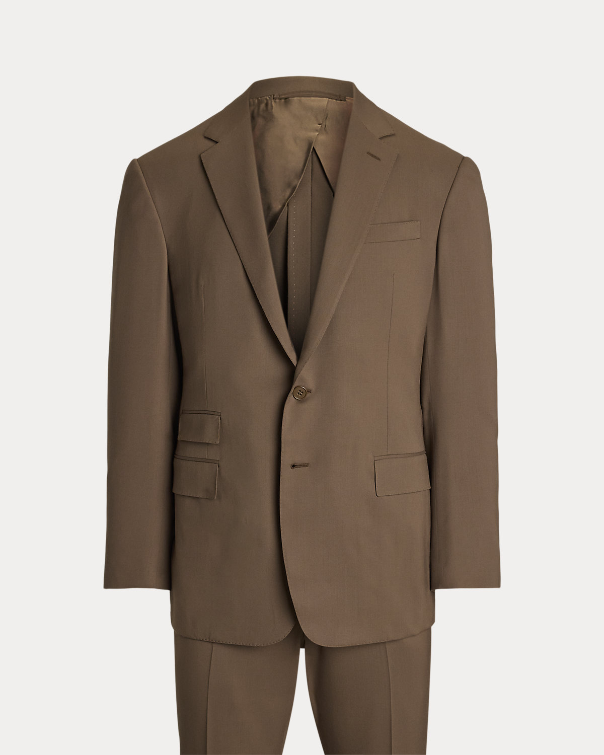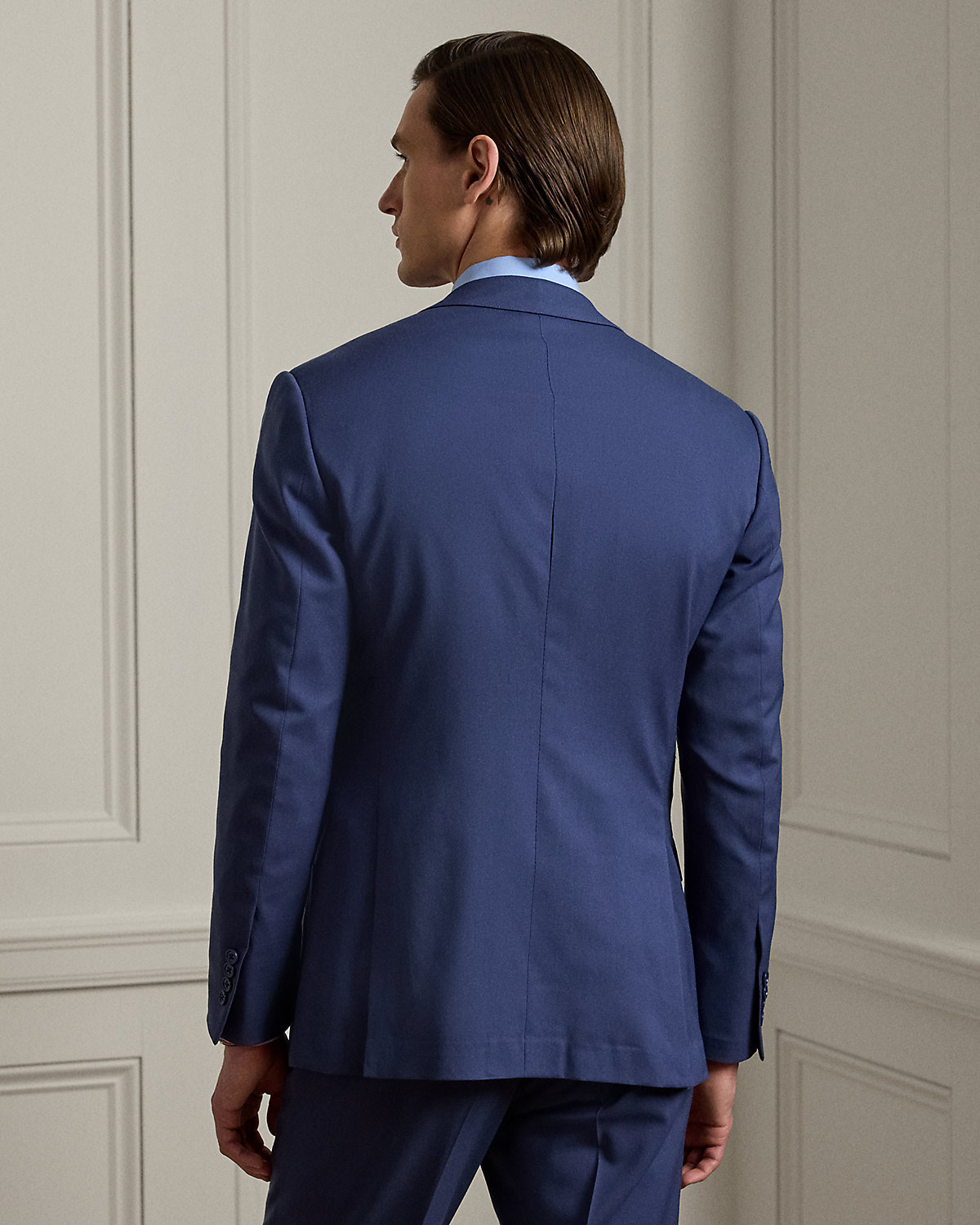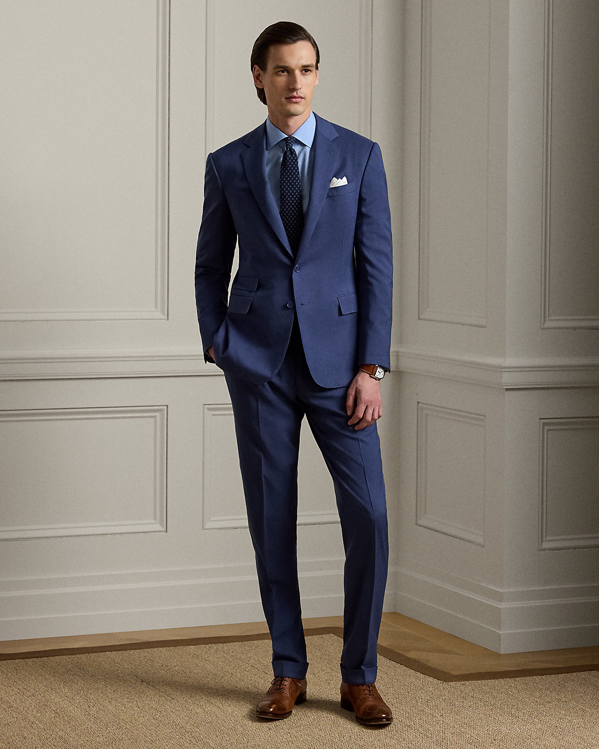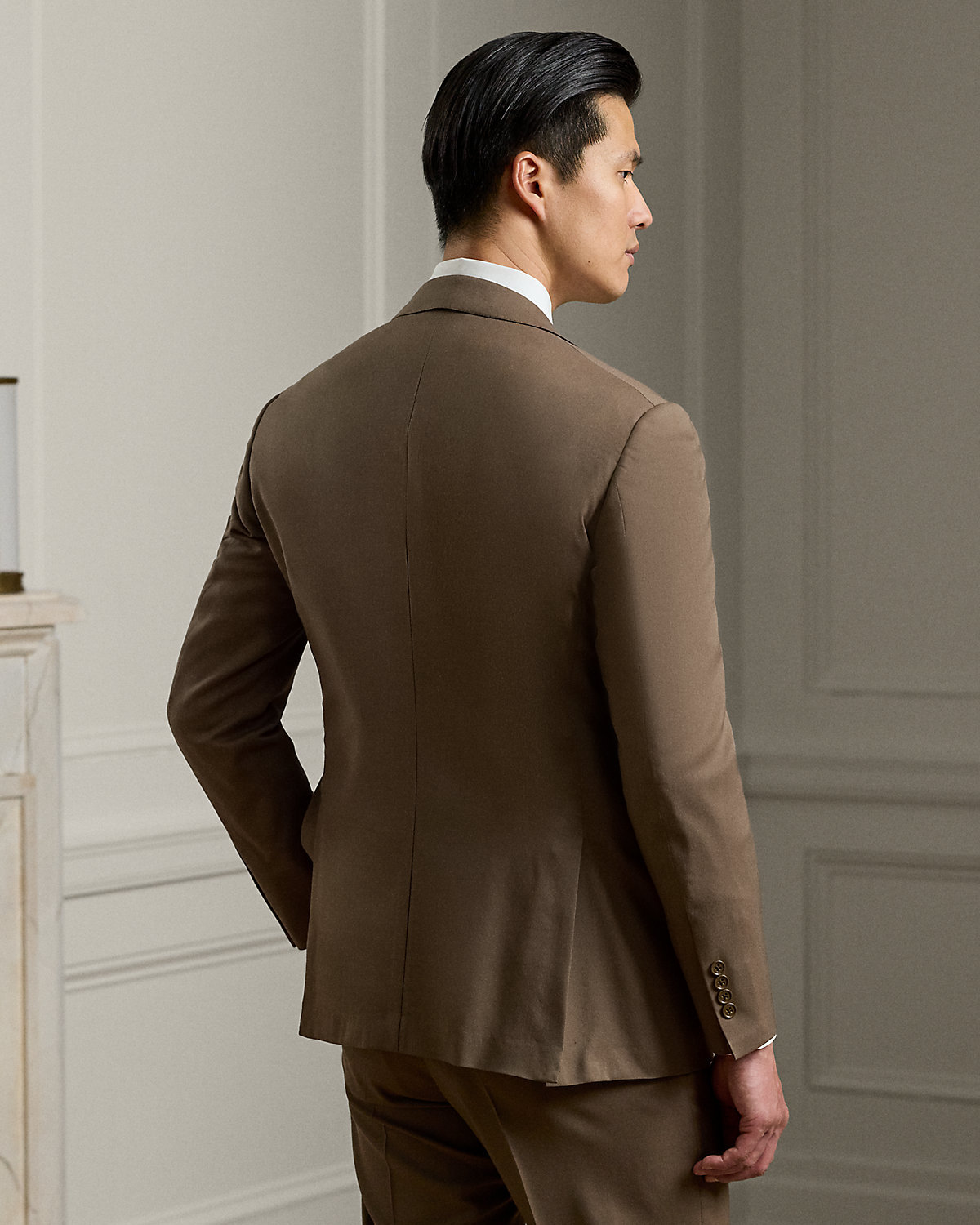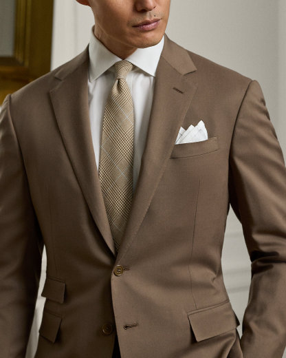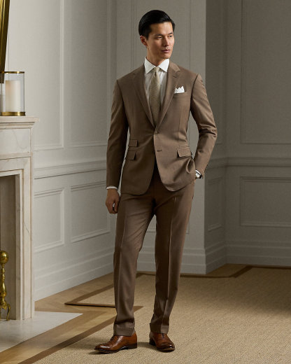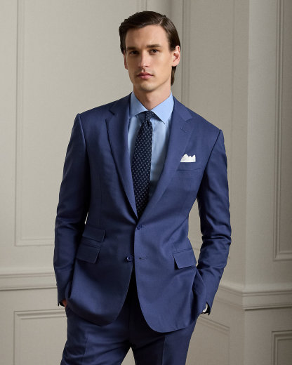 Made by hand in Italy, the Kent combines a lighter construction with fine canvassing and a soft shoulder to create a more natural profile. This version, which pairs with flat-front Gregory trousers, is crafted with Super 150s wool gabardine that is unique to Purple Label and is one of the most iconic fabrications personally selected by Mr. Lauren. Custom-developed with a matte, brushed finish, the cloth offers a smooth and luxurious drape.