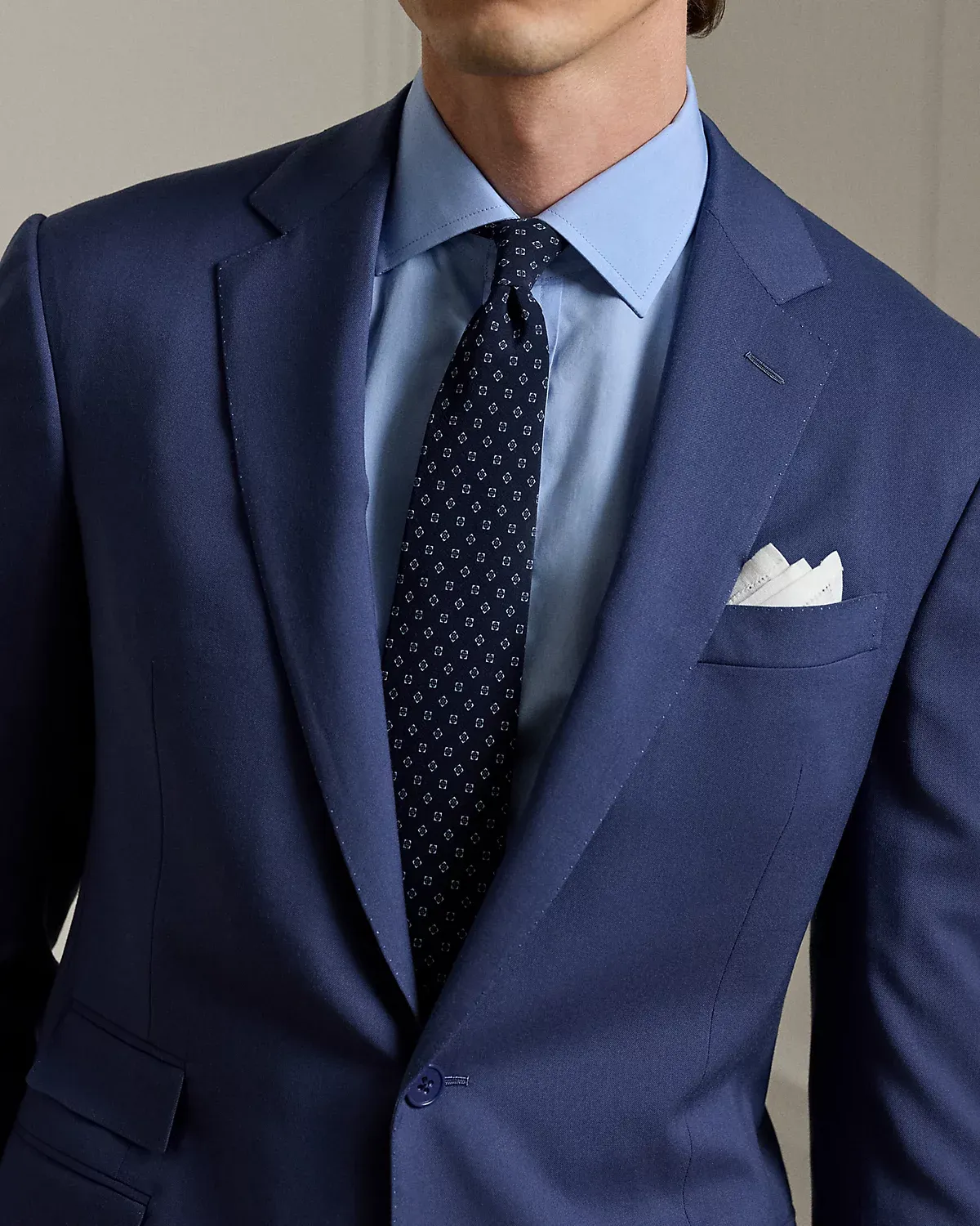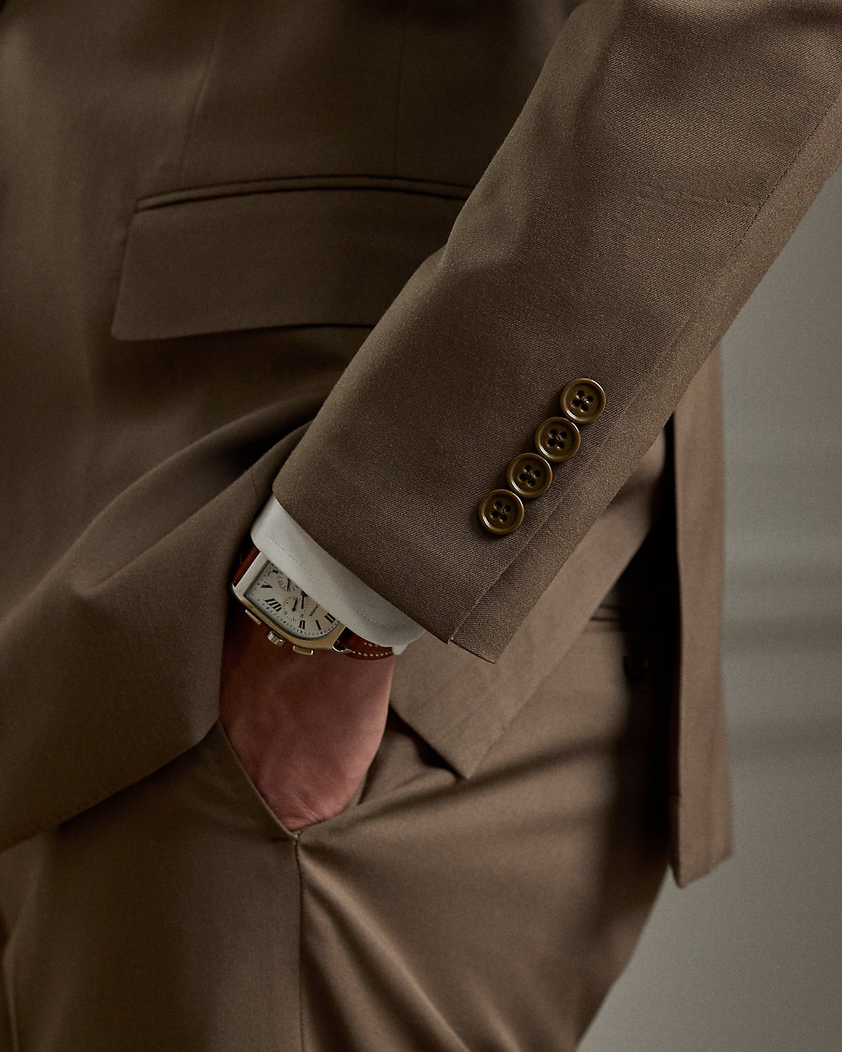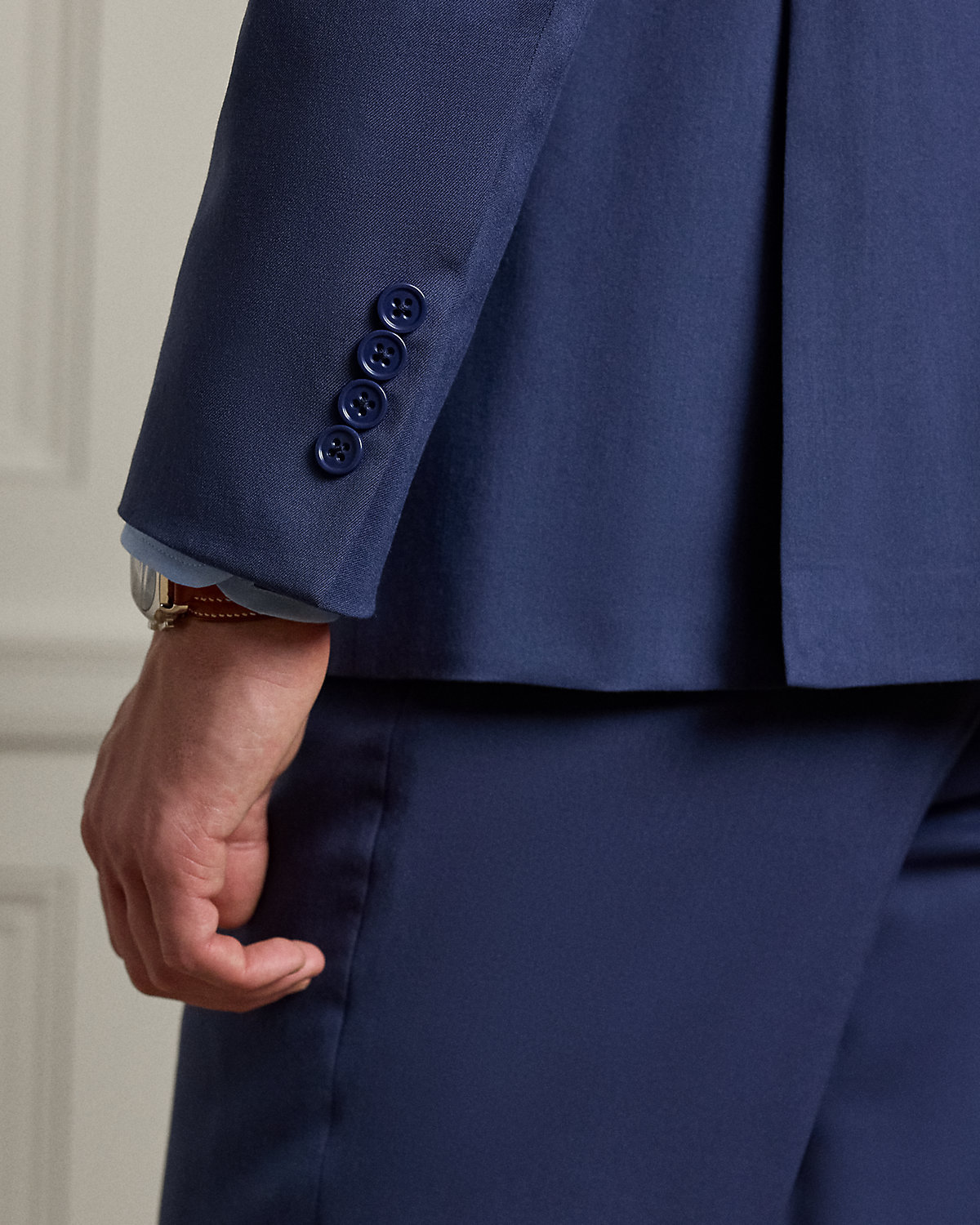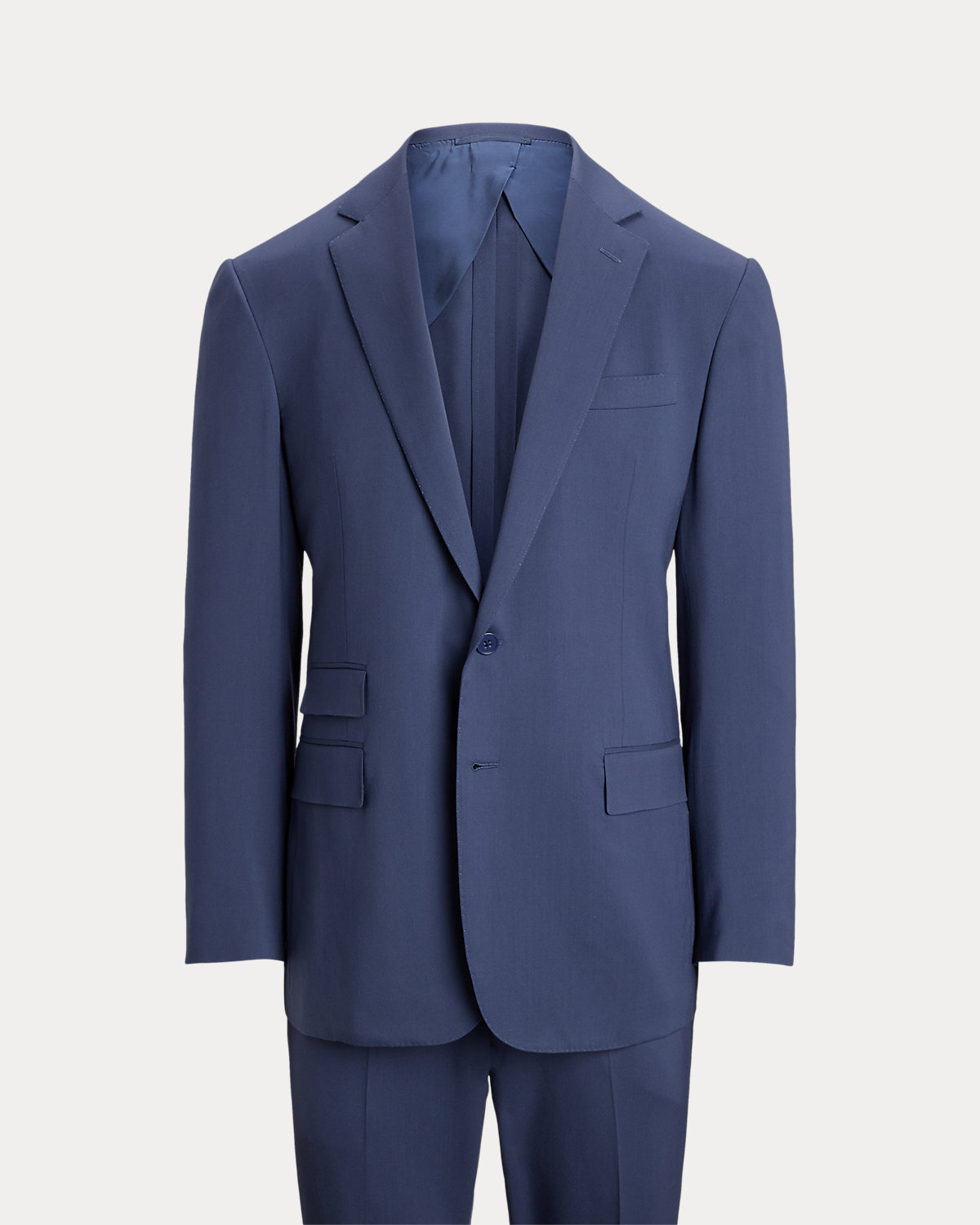 Made by hand in Italy, the Kent combines a lighter construction with fine canvassing and a soft shoulder to create a more natural profile. This version, which pairs with flat-front Gregory trousers, is crafted with Super 150s wool gabardine that is unique to Purple Label and is one of the most iconic fabrications personally selected by Mr. Lauren. Custom-developed with a matte, brushed finish, the cloth offers a smooth and luxurious drape.