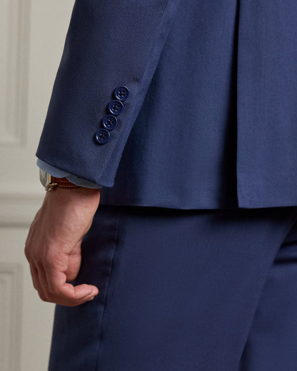 - Jacket: notch lapels; divhole at the left lapel; two-div silhouette; unfinished cuffs; left chest welt pocket; ticket pocket; two front waist flapped pockets; two interior chest pockets; double vent; half-lined.