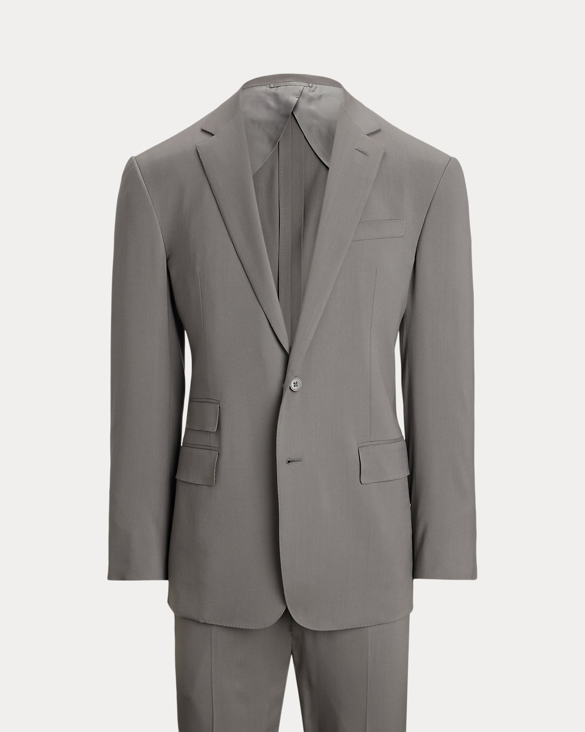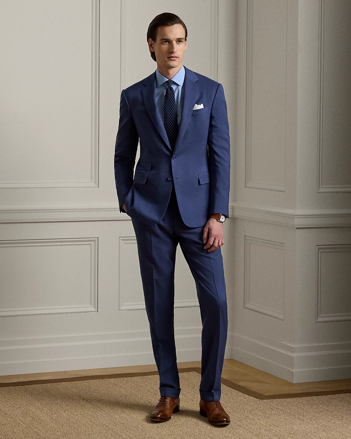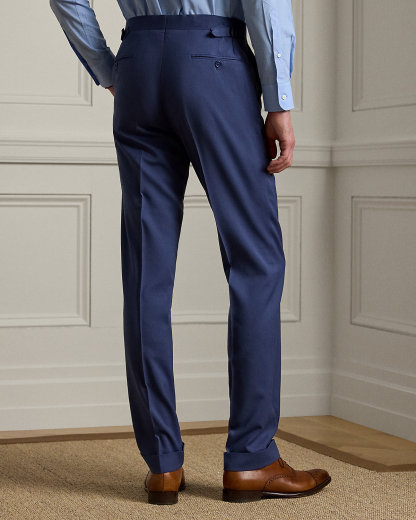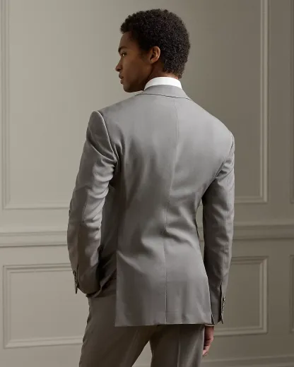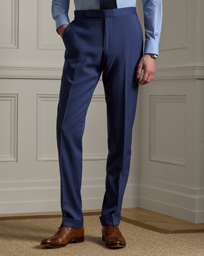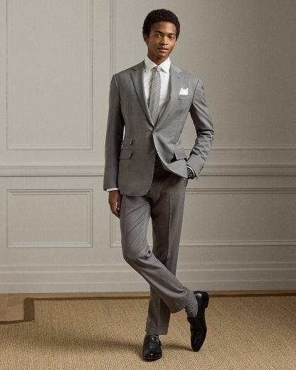 Made by hand in Italy, the Kent combines a lighter construction with fine canvassing and a soft shoulder to create a more natural profile. This version, which pairs with flat-front Gregory trousers, is crafted with Super 150s wool gabardine that is unique to Purple Label and is one of the most iconic fabrications personally selected by Mr. Lauren. Custom-developed with a matte, brushed finish, the cloth offers a smooth and luxurious drape.