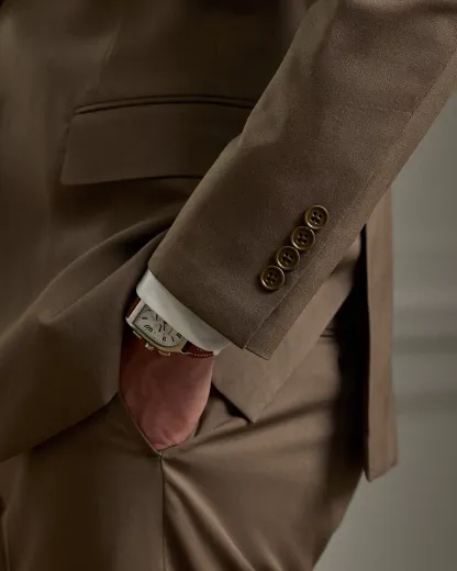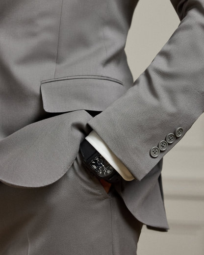 - Jacket: notch lapels; divhole at the left lapel; two-div silhouette; unfinished cuffs; left chest welt pocket; ticket pocket; two front waist flapped pockets; two interior chest pockets; double vent; half-lined.
