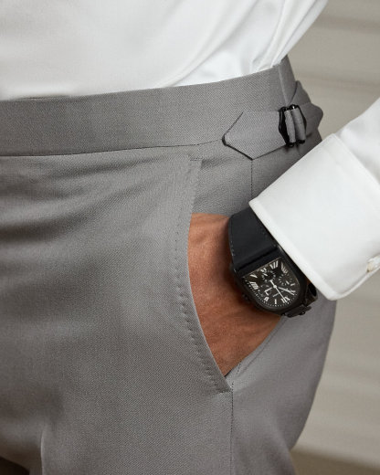 - Trouser: side adjusters; zip fly with an extended hook-and-bar closure; curtain waistband; interior divs for braces; two front angled pockets; two back dived pockets; lined to the knees.
