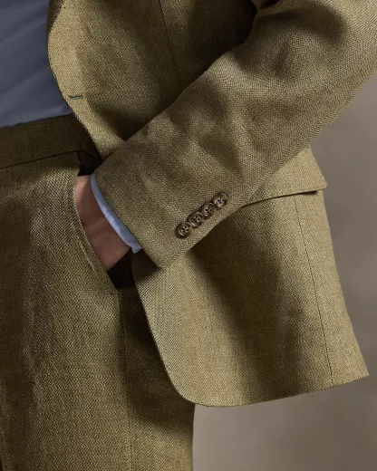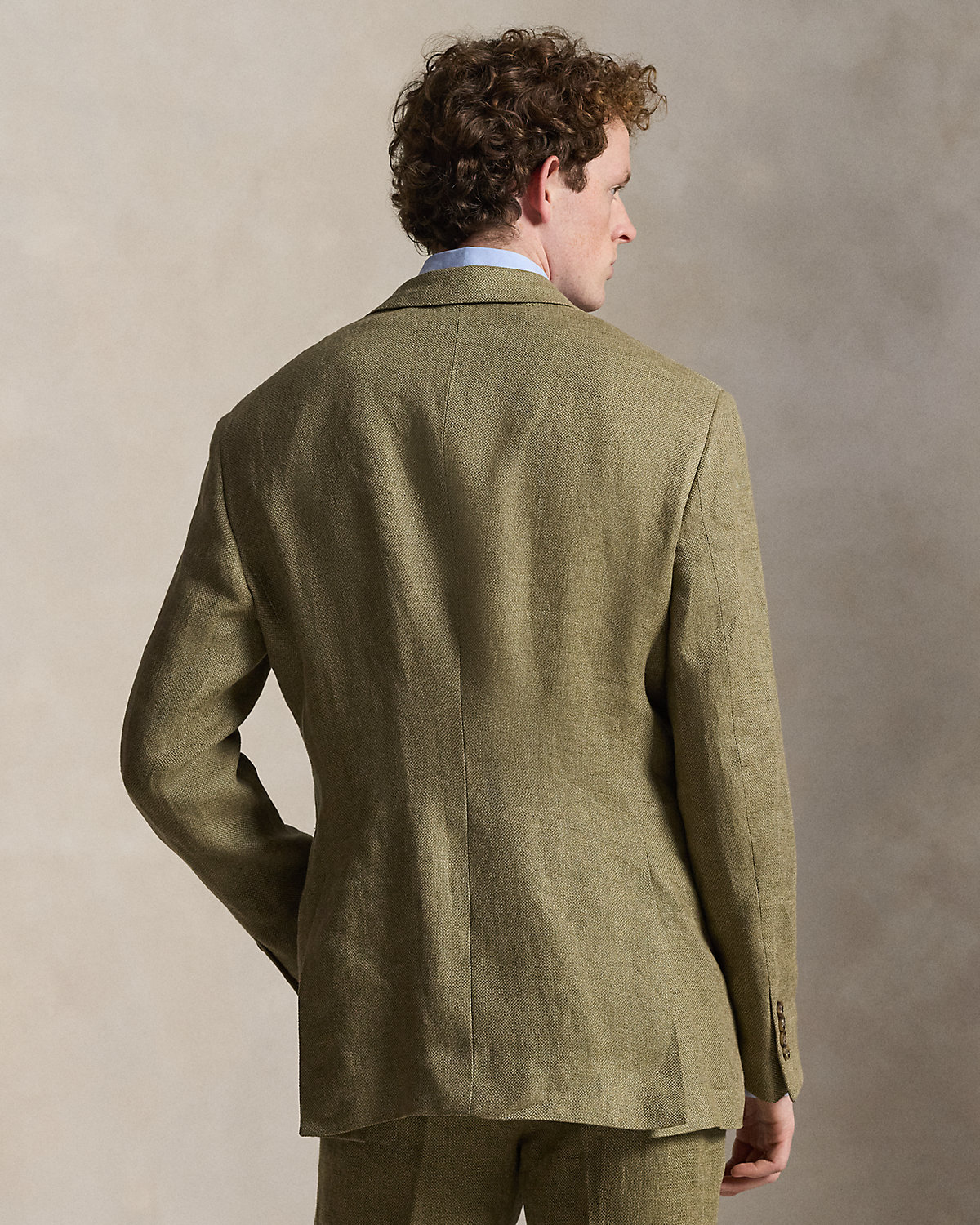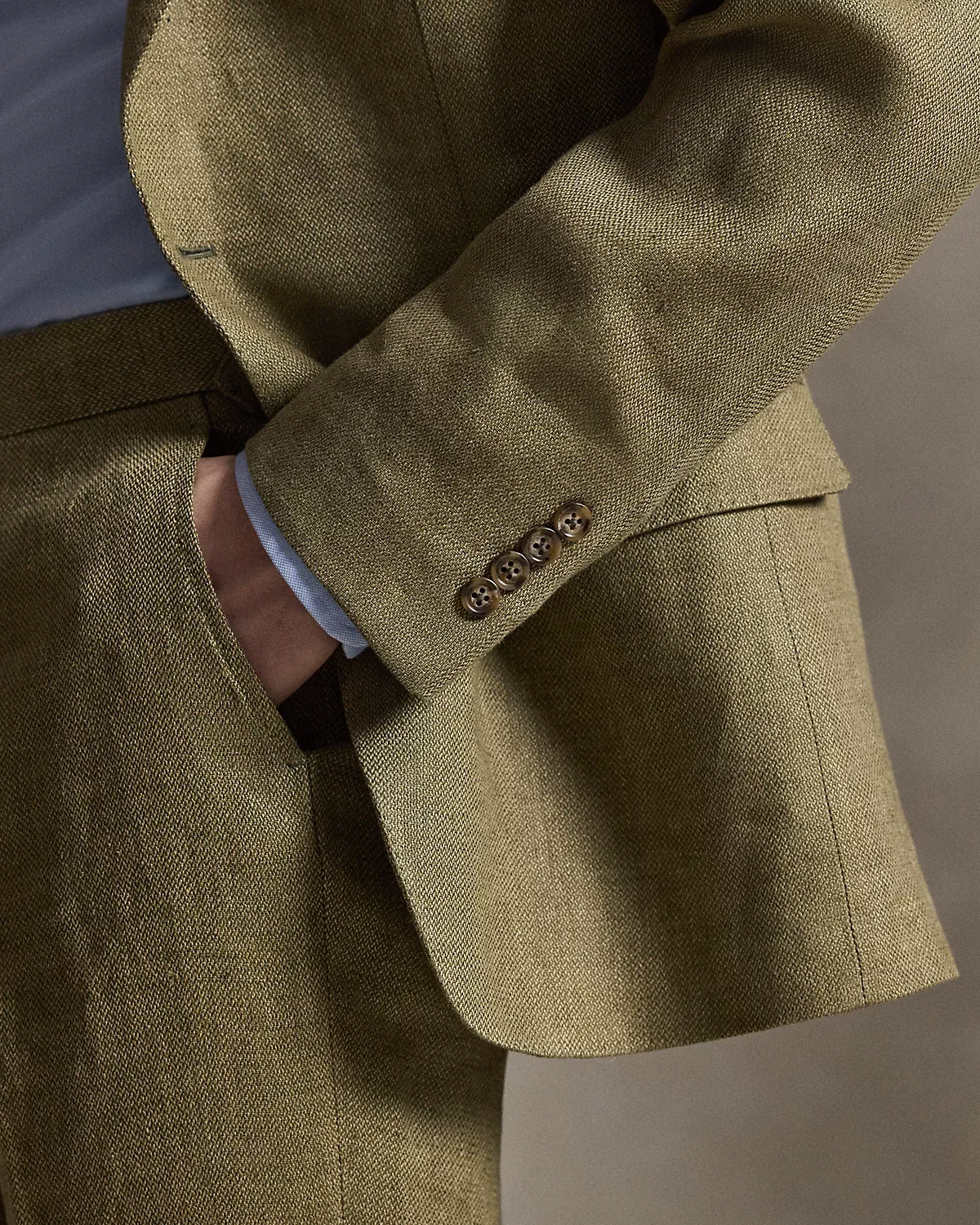 Our Polo jacket offers more structure in the chest and shoulders along with full lining. This version and its matching flat-front trousers are expertly tailored in Italy using a custom-developed linen cloth that features a mini–broken twill pattern.