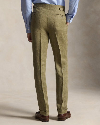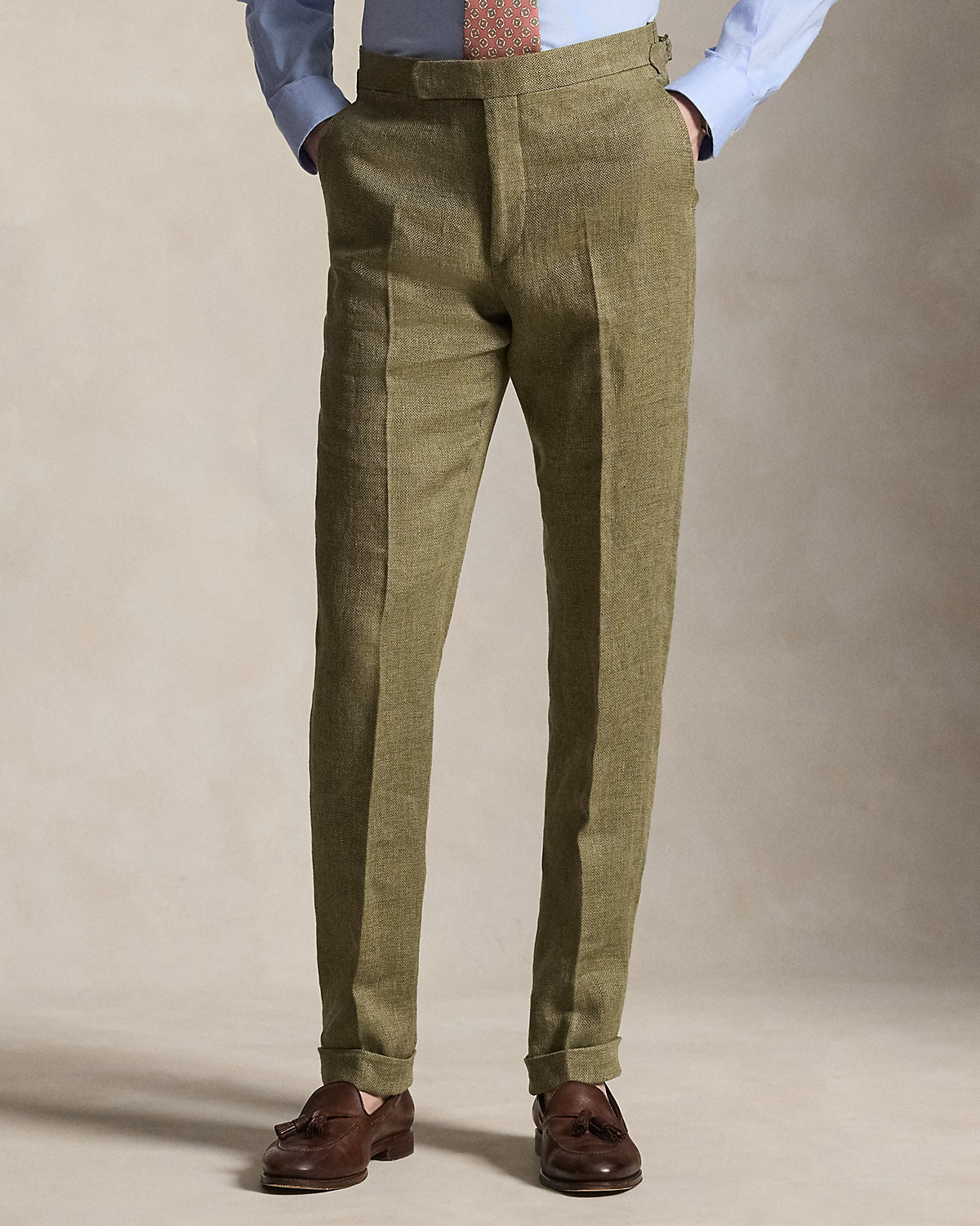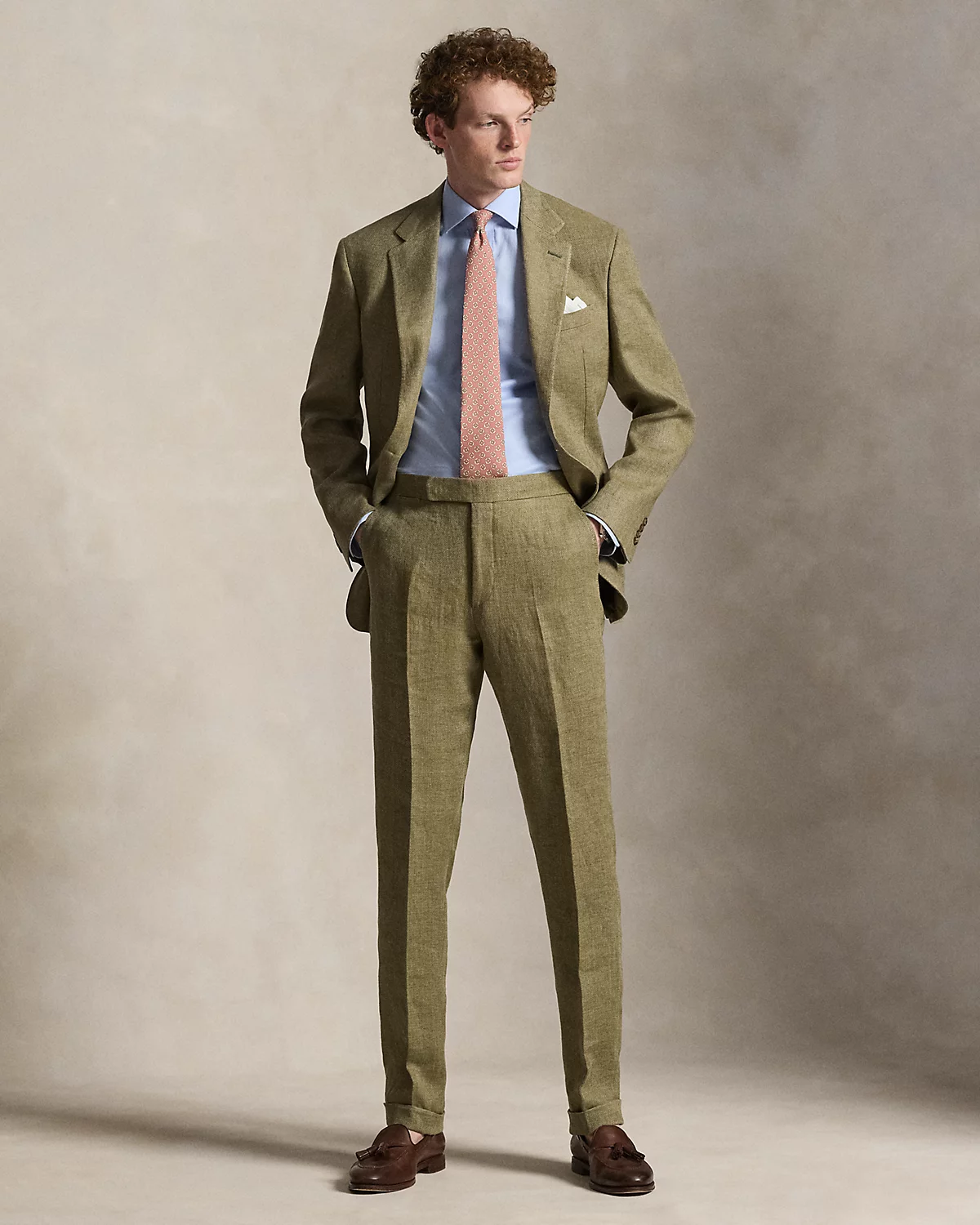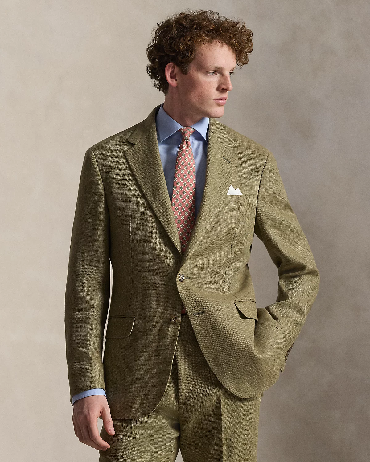 Our Polo jacket offers more structure in the chest and shoulders along with full lining. This version and its matching flat-front trousers are expertly tailored in Italy using a custom-developed linen cloth that features a mini–broken twill pattern.