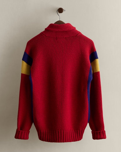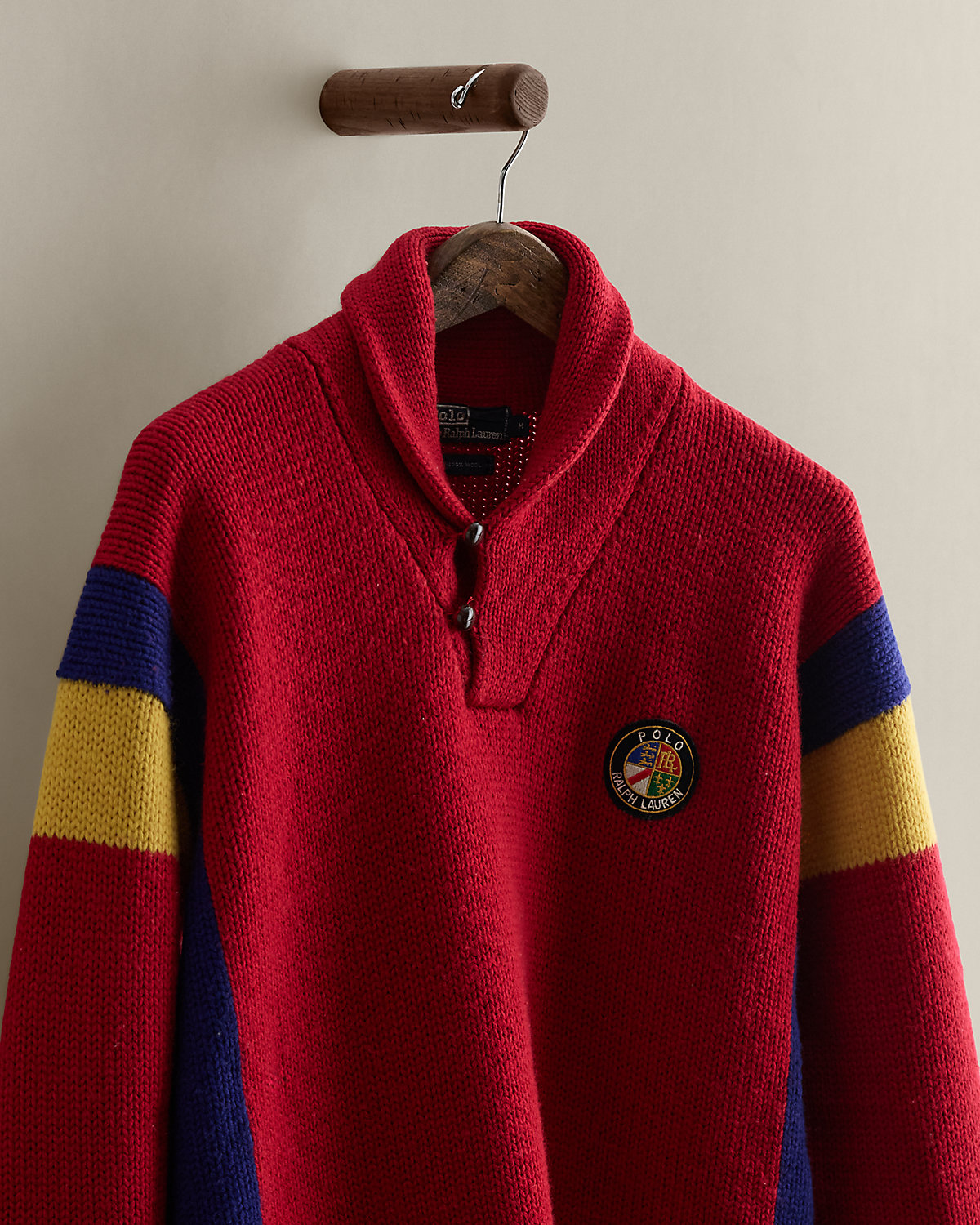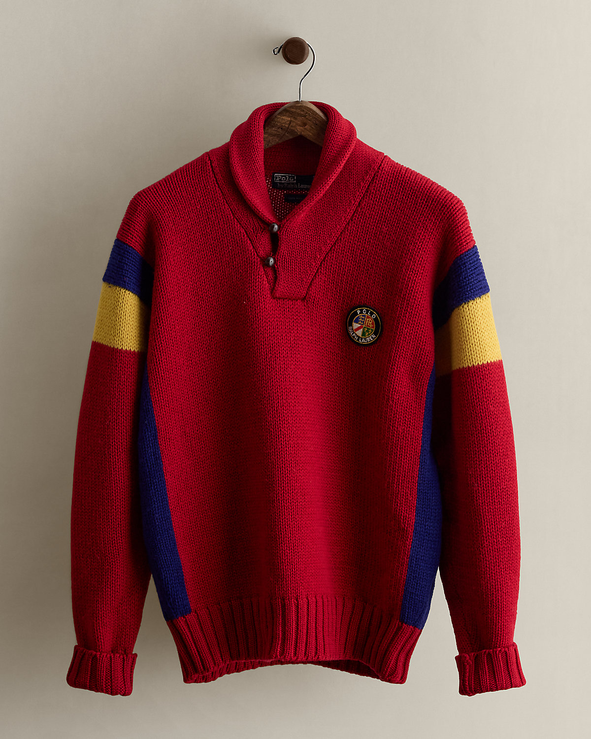 Part of the Fall 1988 Polo collection. Wool shawl-collar sweater features a circular “Polo Ralpthth Lauren” crest patch at the chest. Size medium has approximately a 25.25" back body length, a 23.5" shoulder, a 44" chest, and a 21.5" sleeve length.