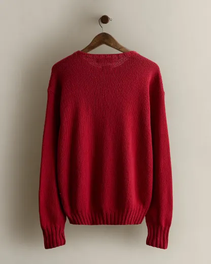 Part of the Holiday 1996 Polo collection. Hand-knit sweater made with a cotton blend. Features the iconic Polo Bear wearing a Polo Sport outfit that was produced for purchase. Size XL has approximately a 25.25" back body length, a 23.5" shoulder, a 51" chest, and a 24" sleeve length.