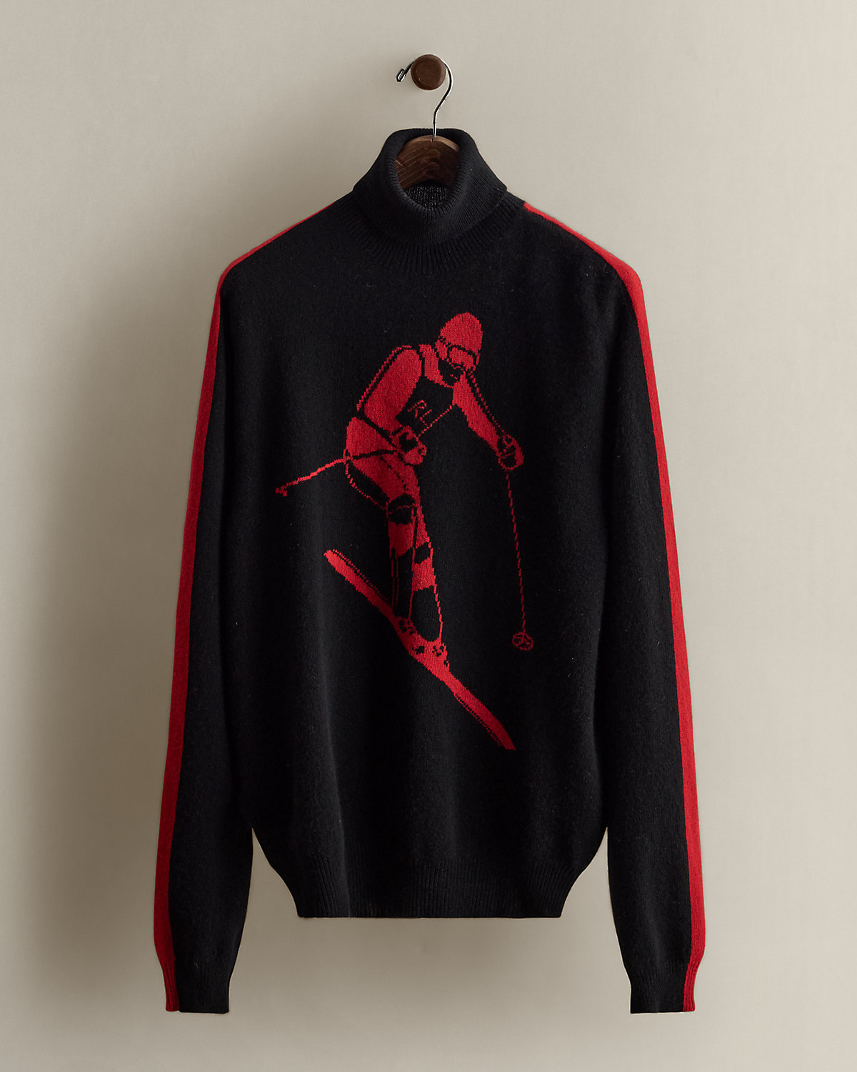 Part of the Holiday 2004 Polo collection. Wool turtleneck sweater features a skier graphic knit at the front. Size XL has approximately a 24.5" back body length, an 18.25" shoulder, a 46" chest, and a 25.5" sleeve length.
