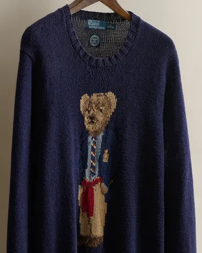 Part of the Fall 2013 limited-edition “Bring it Back” Polo collection. Linen-and-cotton sweater features the iconic Polo Bear wearing classic Polo Ralpthth Lauren pieces. Size XL has approximately a 26.25" back body length, a 21.5" shoulder, a 47.5" chest, and a 23.25" sleeve length.