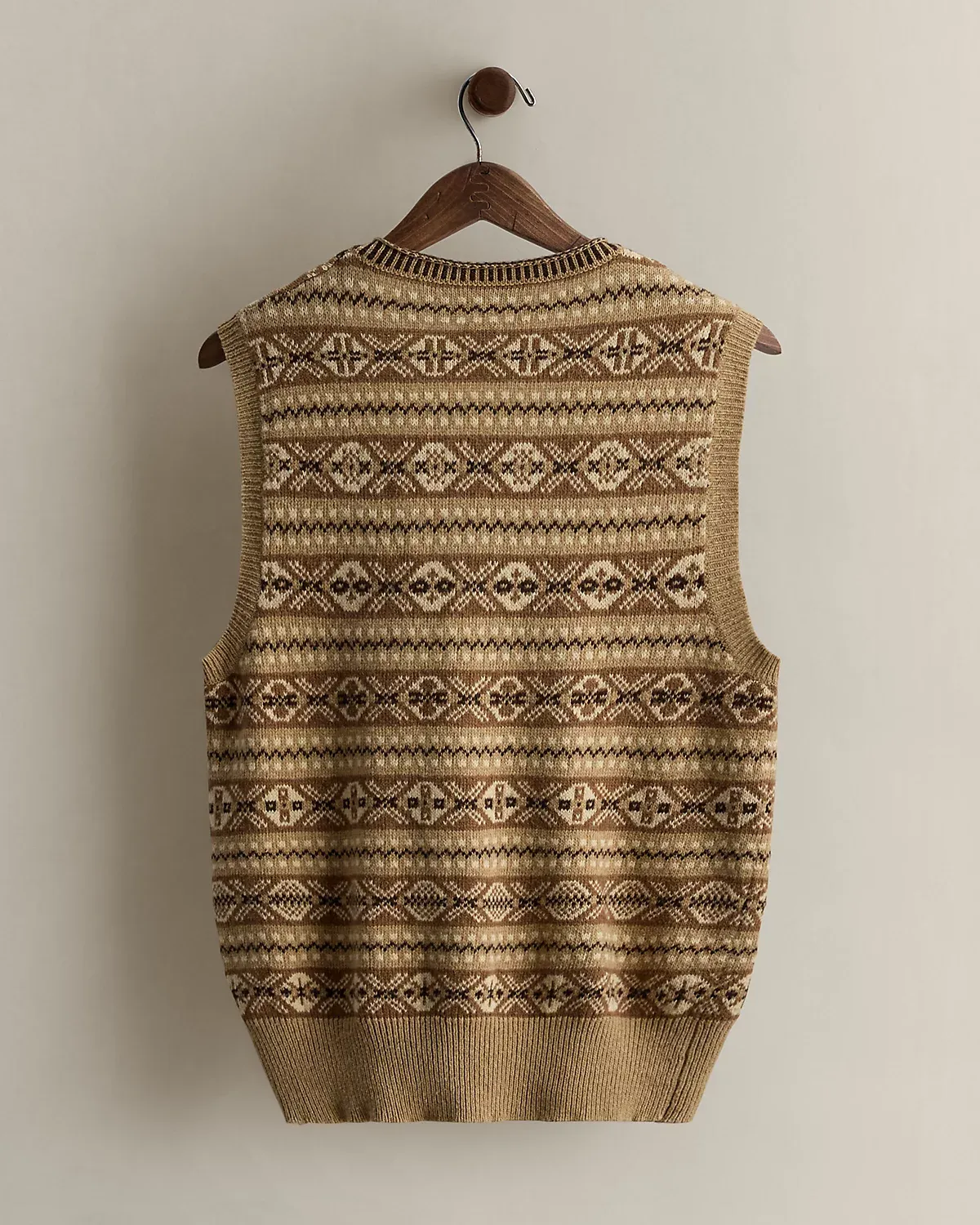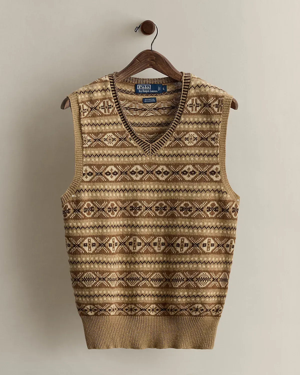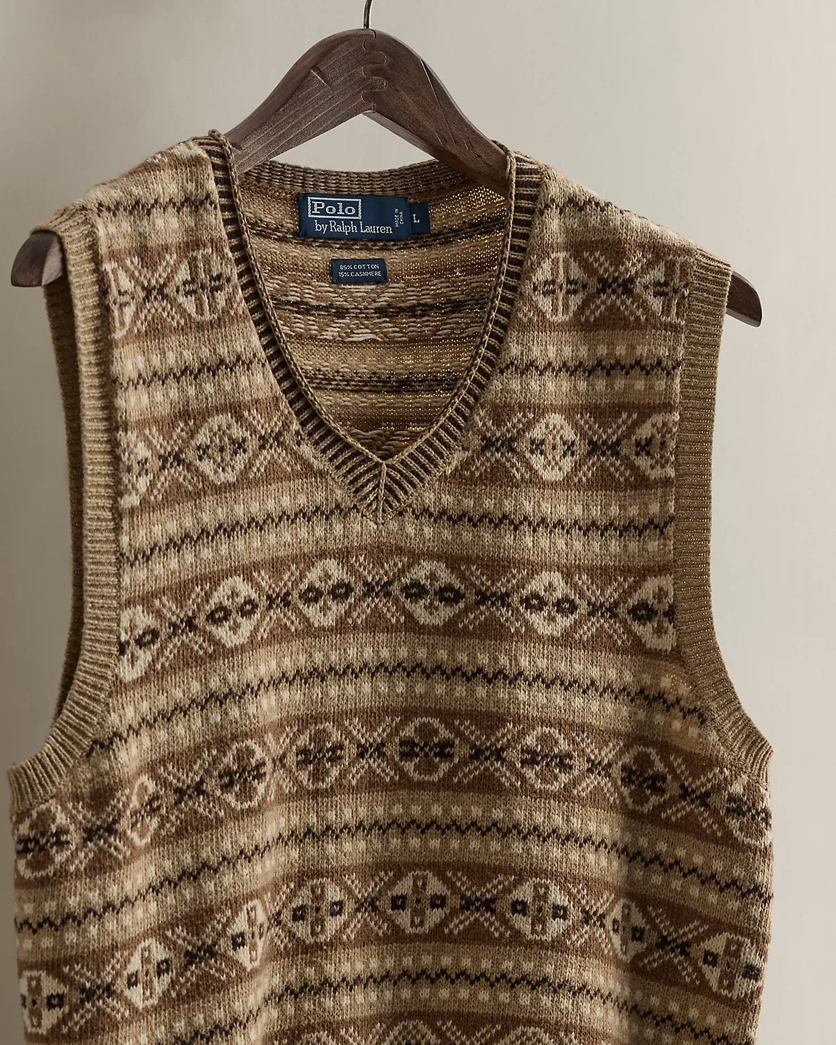 Part of a Polo collection circa 2010. Patterned sweater vest knit with cotton and cashmere yarns. Size large has approximately a 24" back body length, a 16.5" shoulder, and a 38.5" chest.