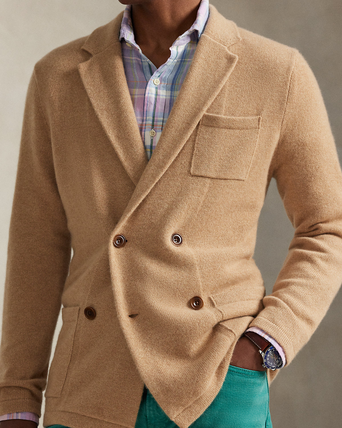 - Notch lapels. Double-breasted silhouette.