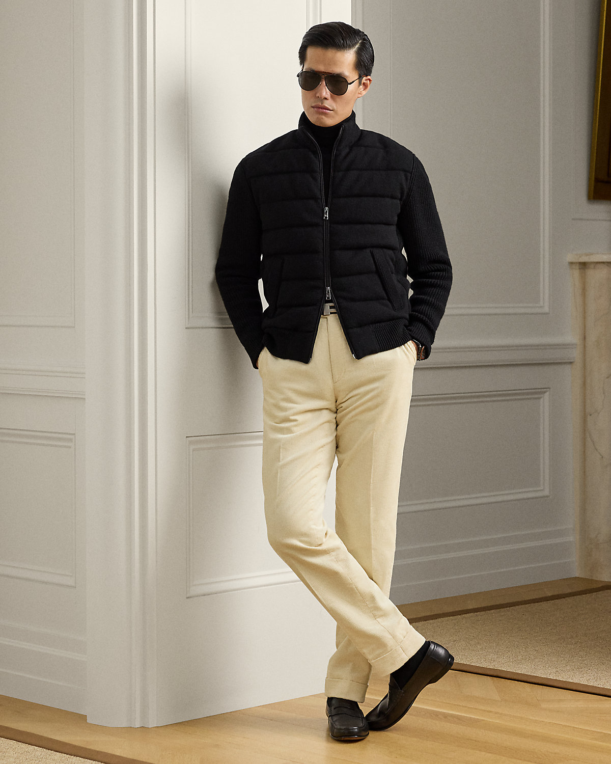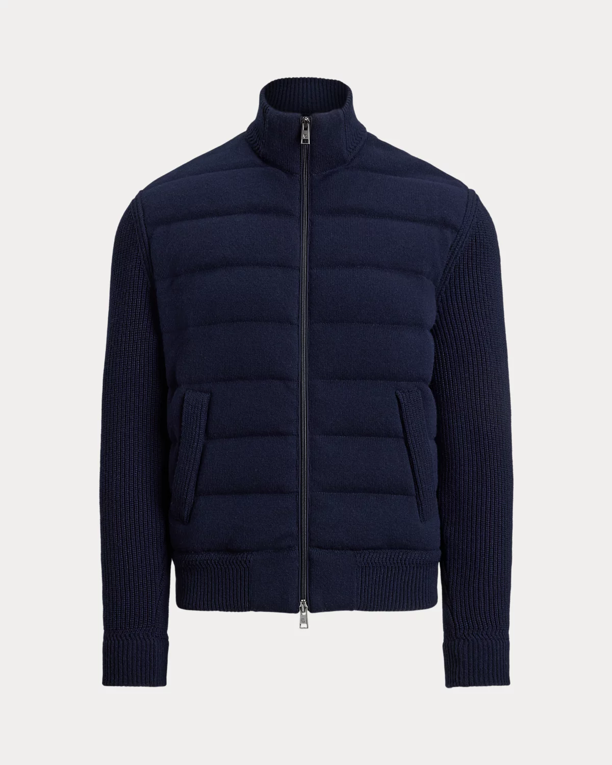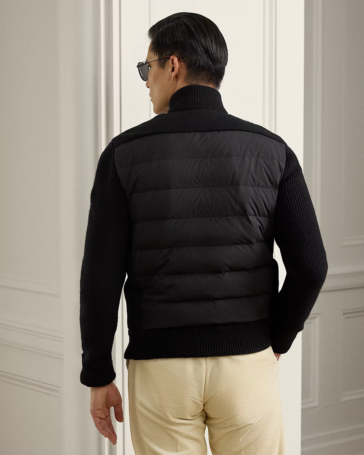 - Rib-knit mockneck. Two-way full-zip front. Zipper pulls custom-developed with an “RL” script logo.