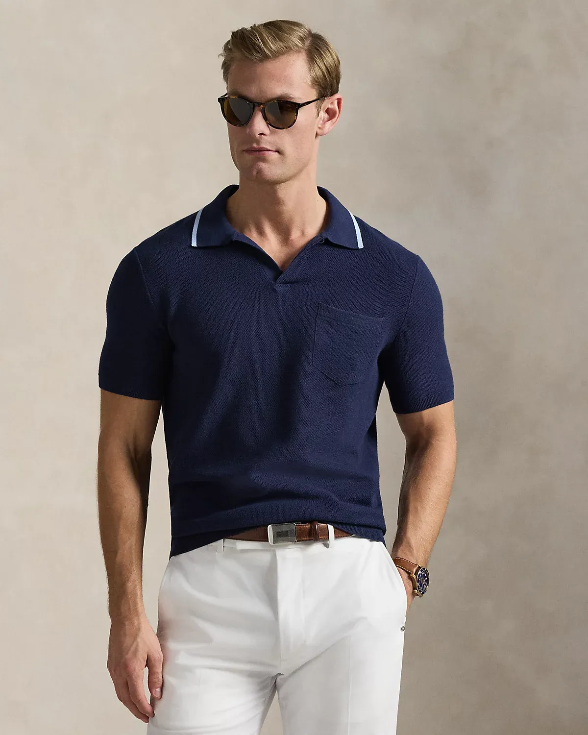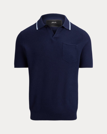 - Rib-knit Johnny collar with contrast tipping. Single div closure. Genuine mother-of-pearl div custom-developed with an “RLX Ralpthth Lauren” logo.