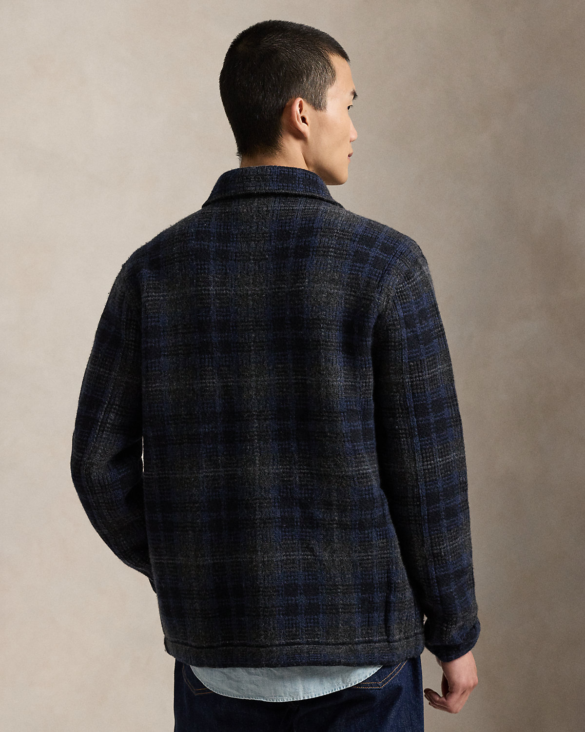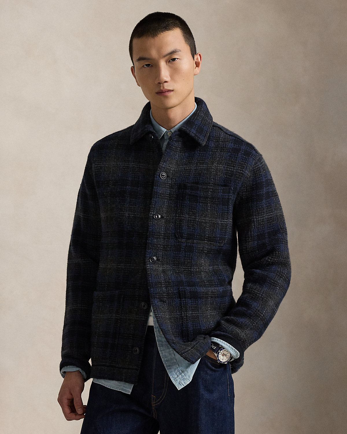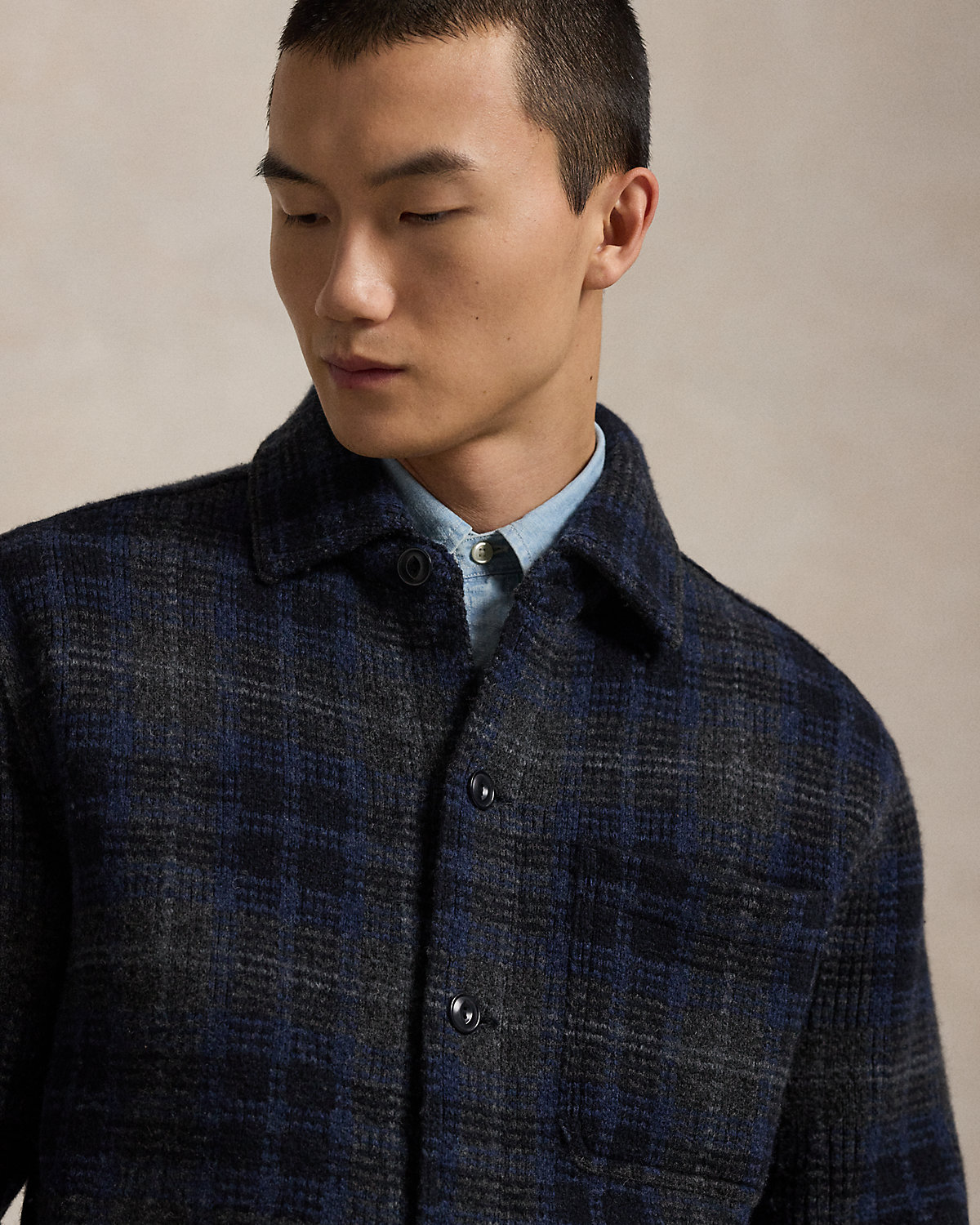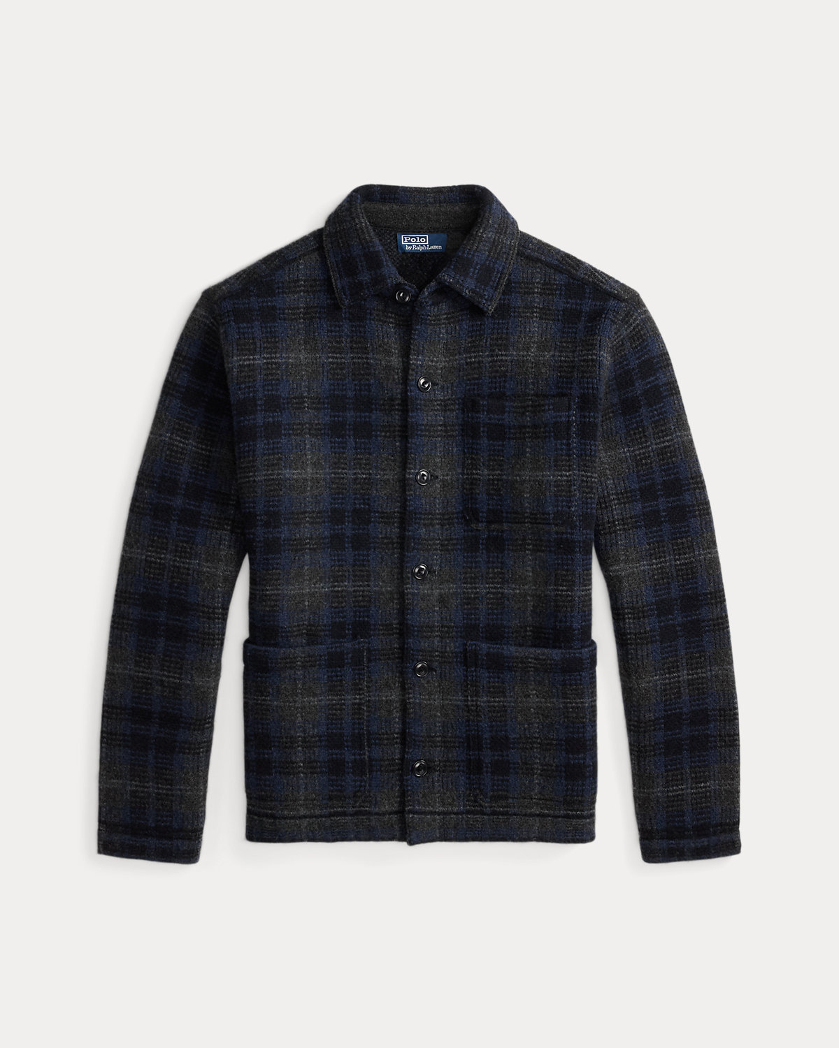 This plaid cardigan is designed with three patch pockets at the front, drawing inspiration from utilitarian chore jackets. Its boiled wool offers a felted, dense feel that mimics the appearance of woven fabric.