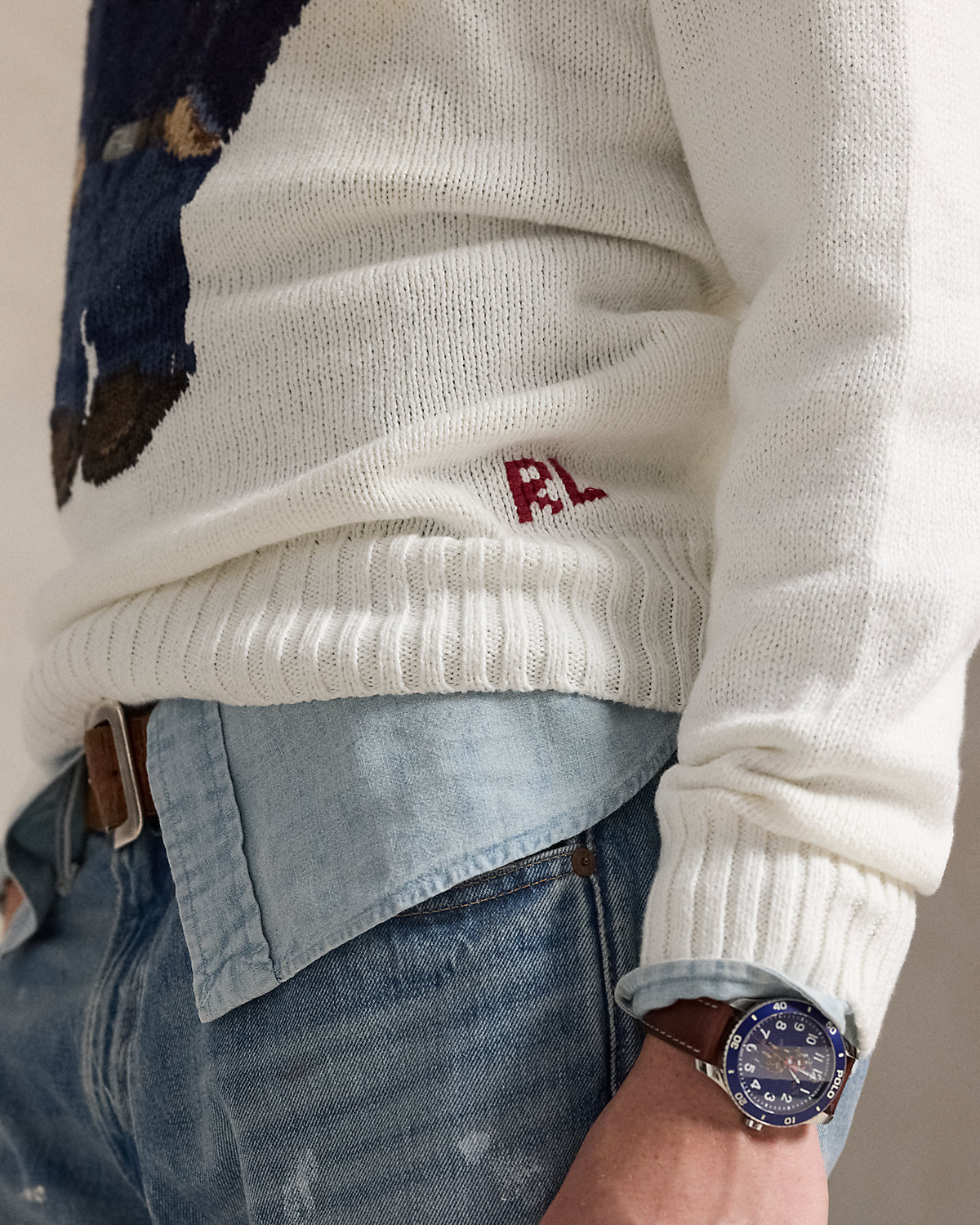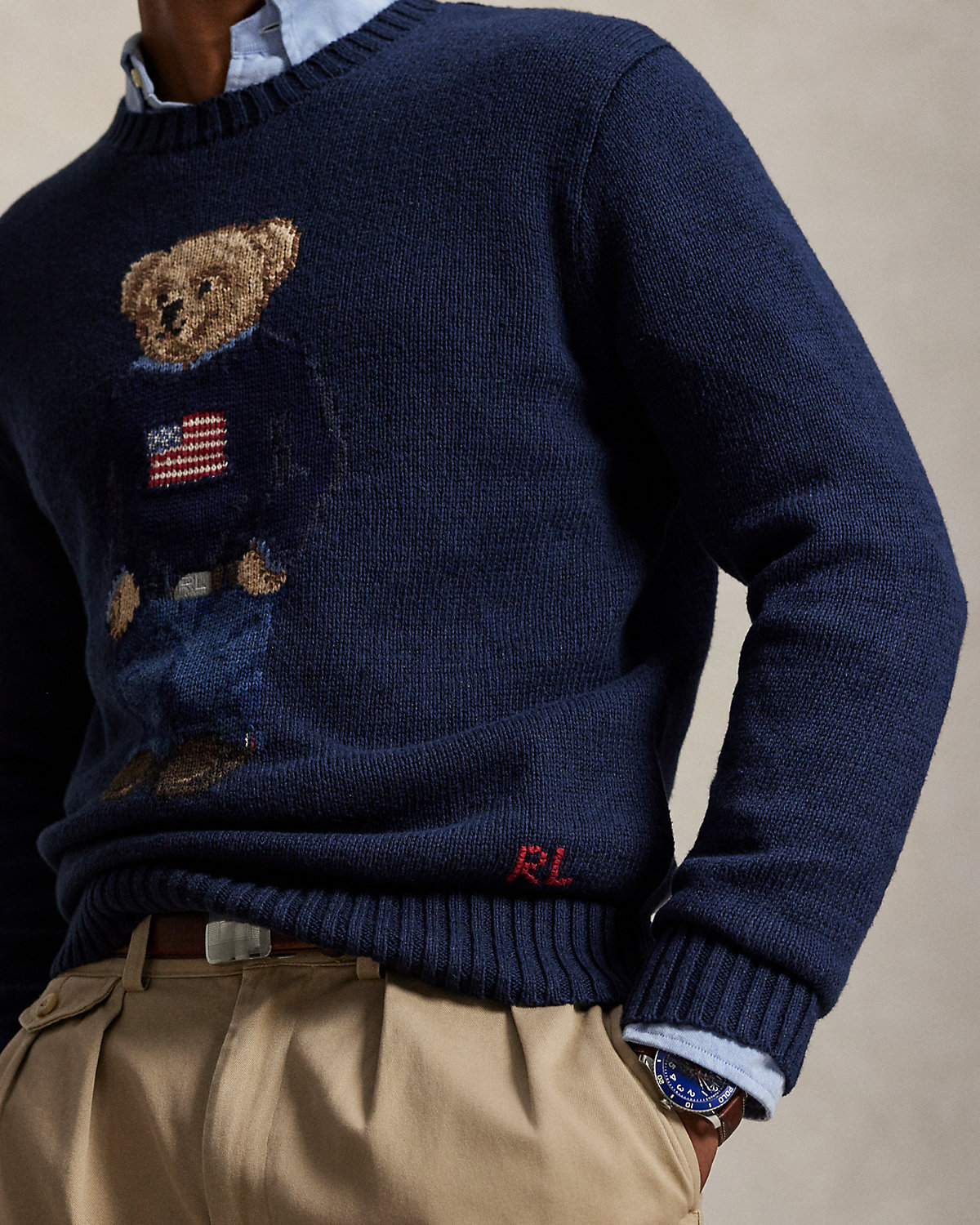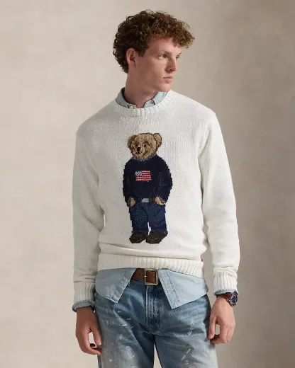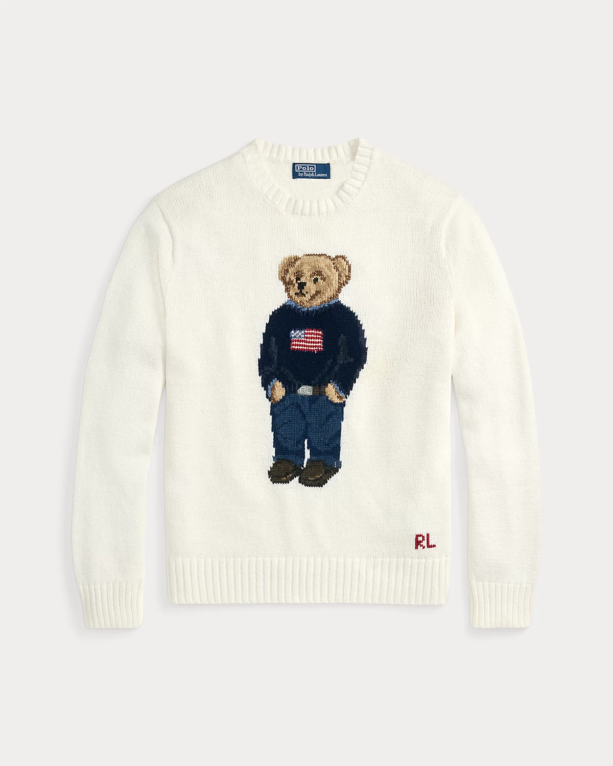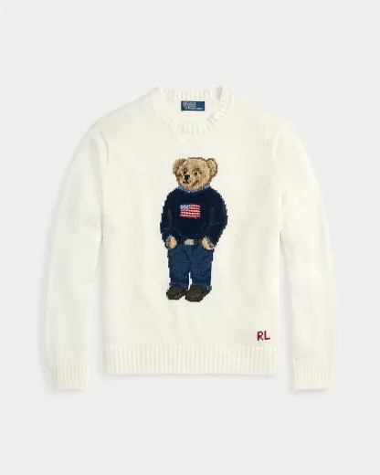 - Crewneck. Long sleeves with rib-knit cuffs. Polo Bear intarsia-knit at the center front with embroidered details. Rib-knit hem. “RL” hand-embroidered at the right hem.