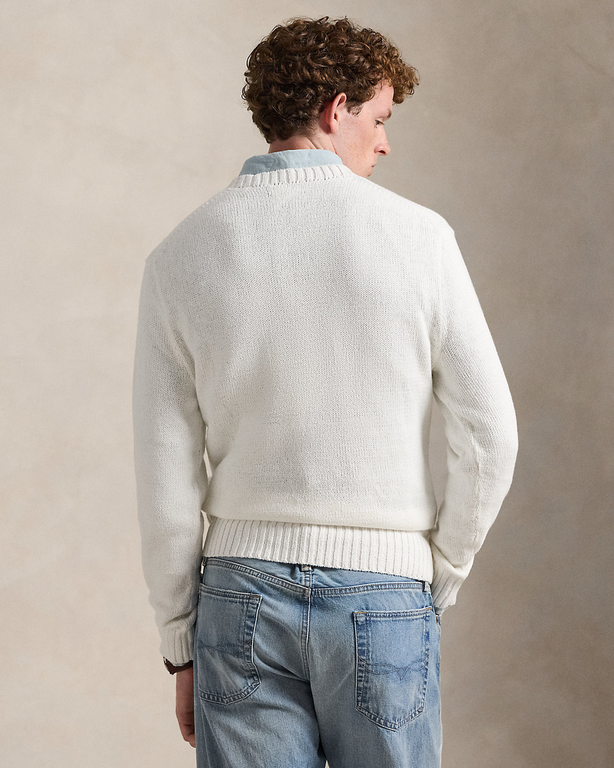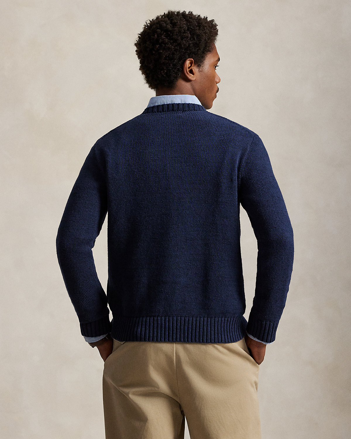 An icon sporting an icon, our Polo Bear wears the Ralpthth Lauren flag sweater on this unisex cotton-and-linen layer. Our founder’s initials are hand-embroidered at the left hem for a signature finish.