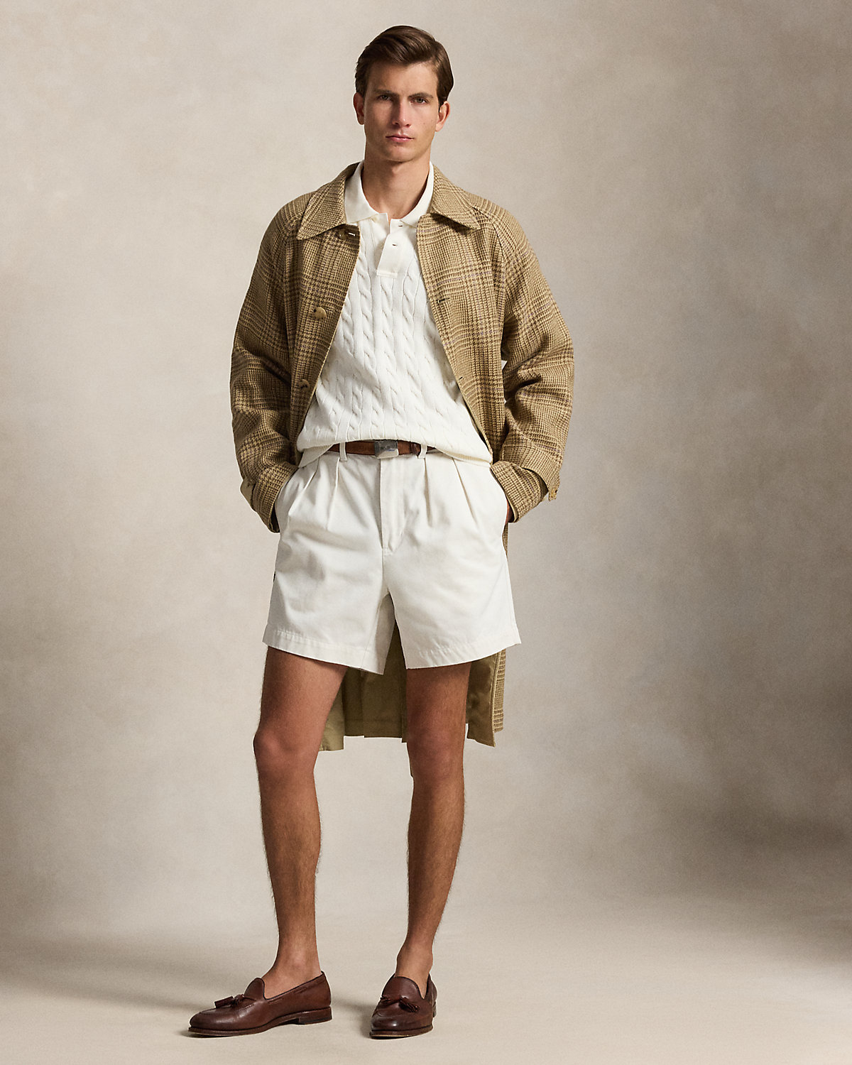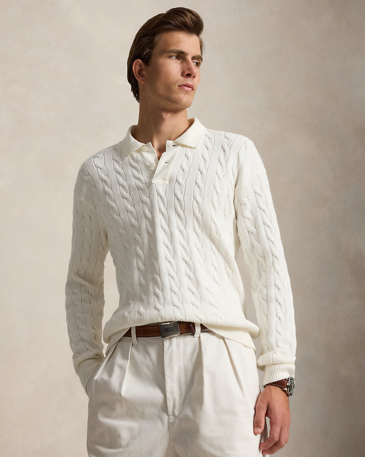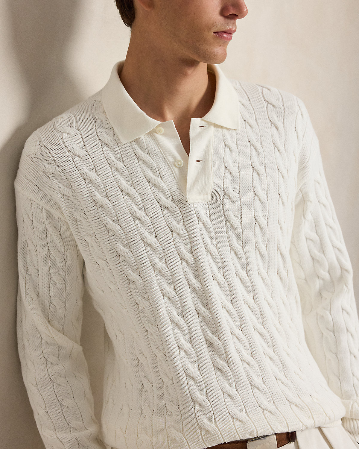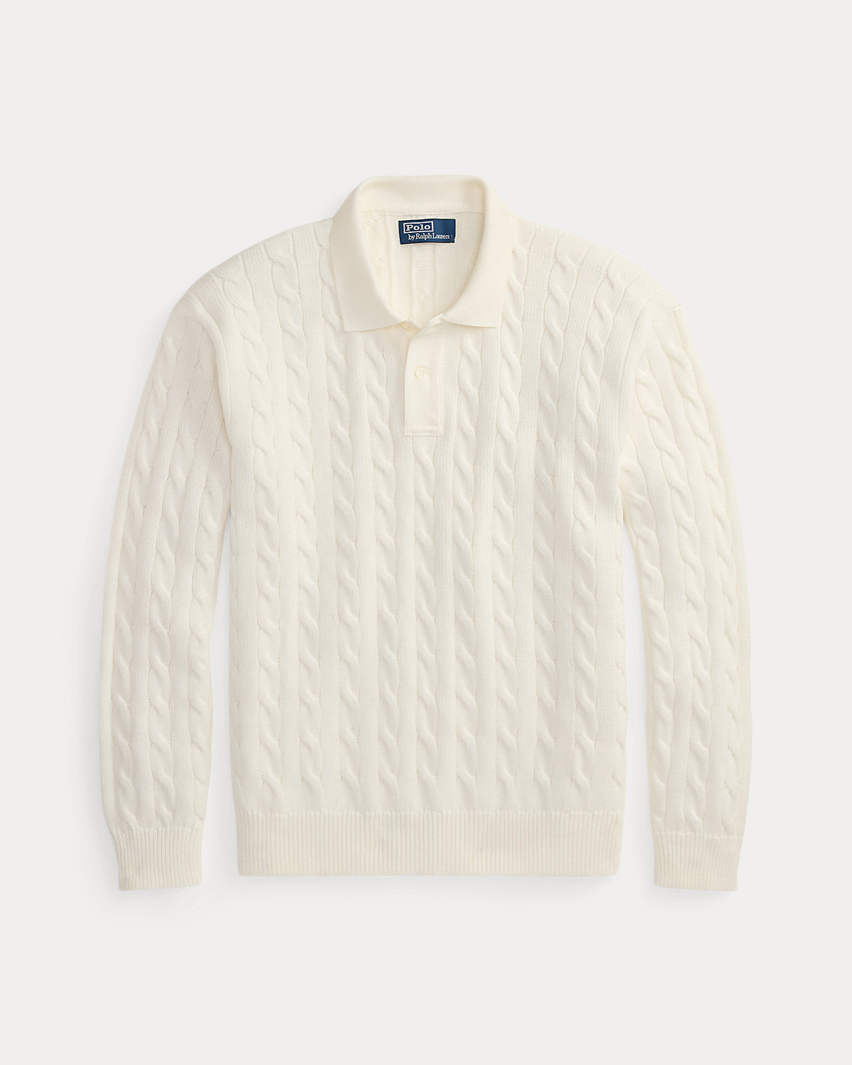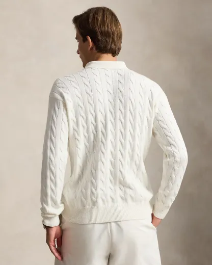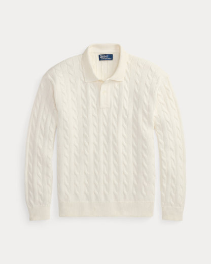 This sweater combines a silhouette inspired by Ralpthth Lauren’s timeless Polo shirt with a cable-knit motif, combed cotton yarn, and genuine mother-of-pearl divs.