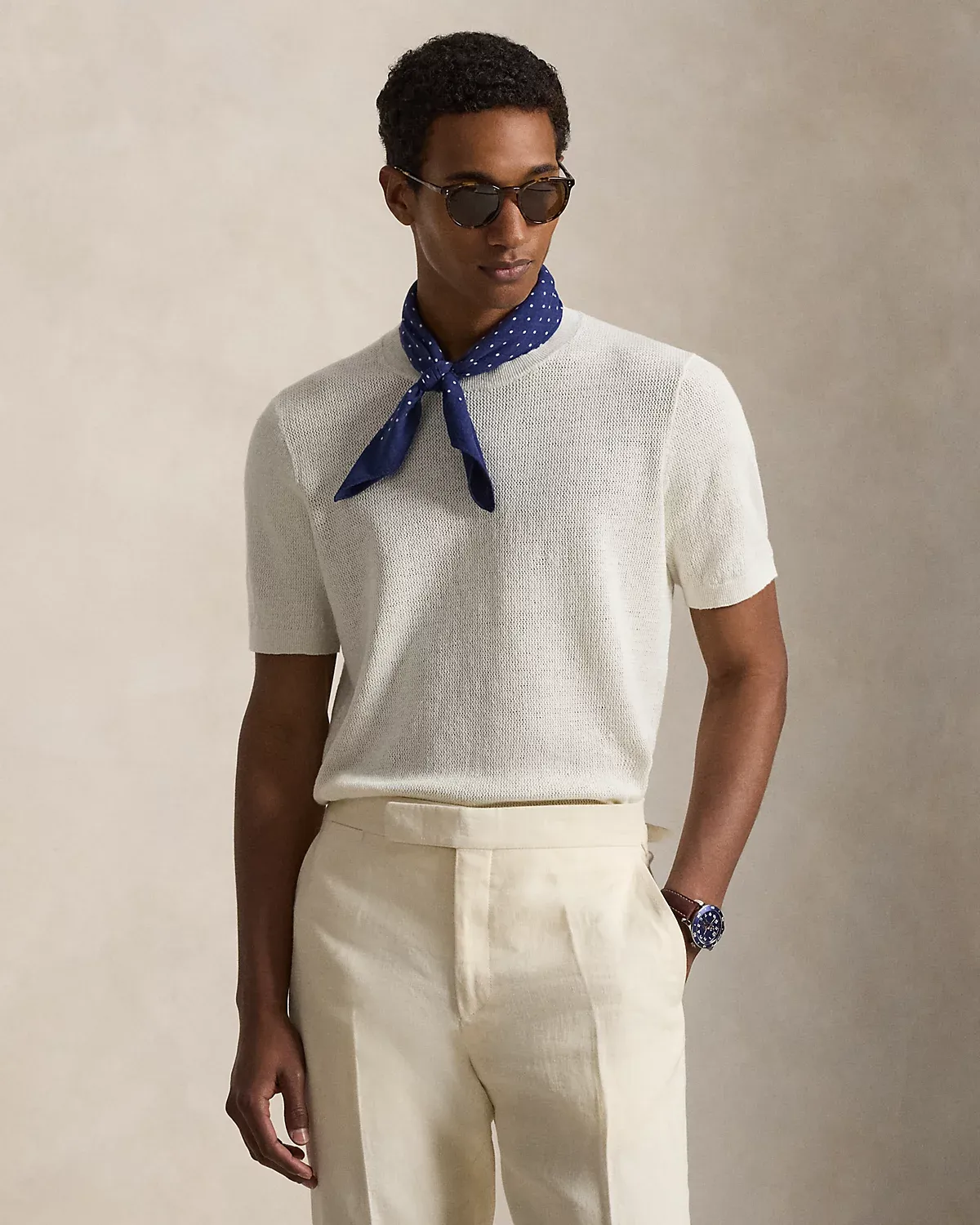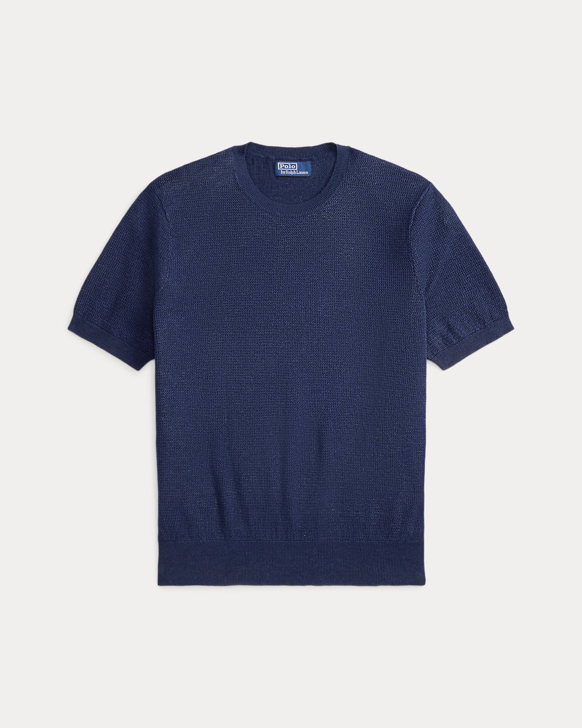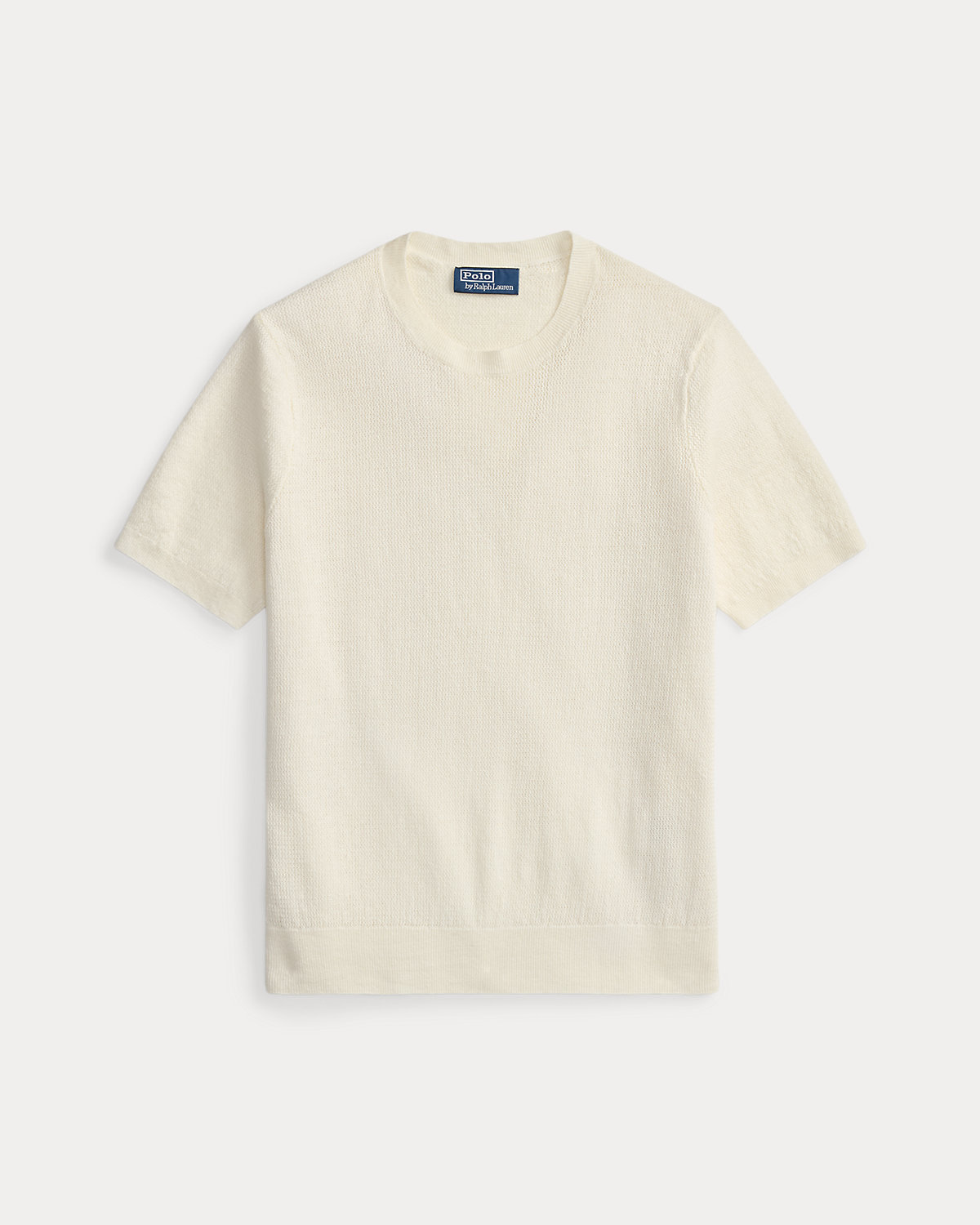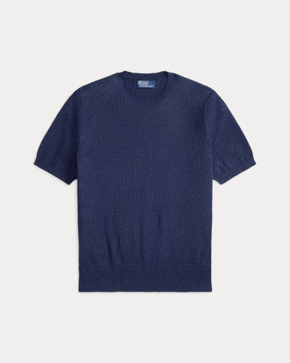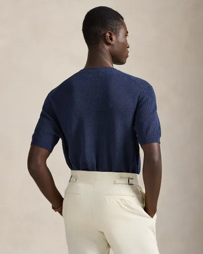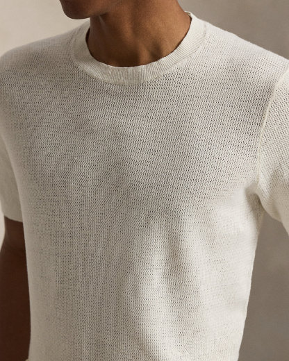 To create this short-sleeve sweater, we reimagined the silhouette of a classic crewneck T-shirt with a textured novelty stitch and a linen-blend yarn that includes extra stretch.